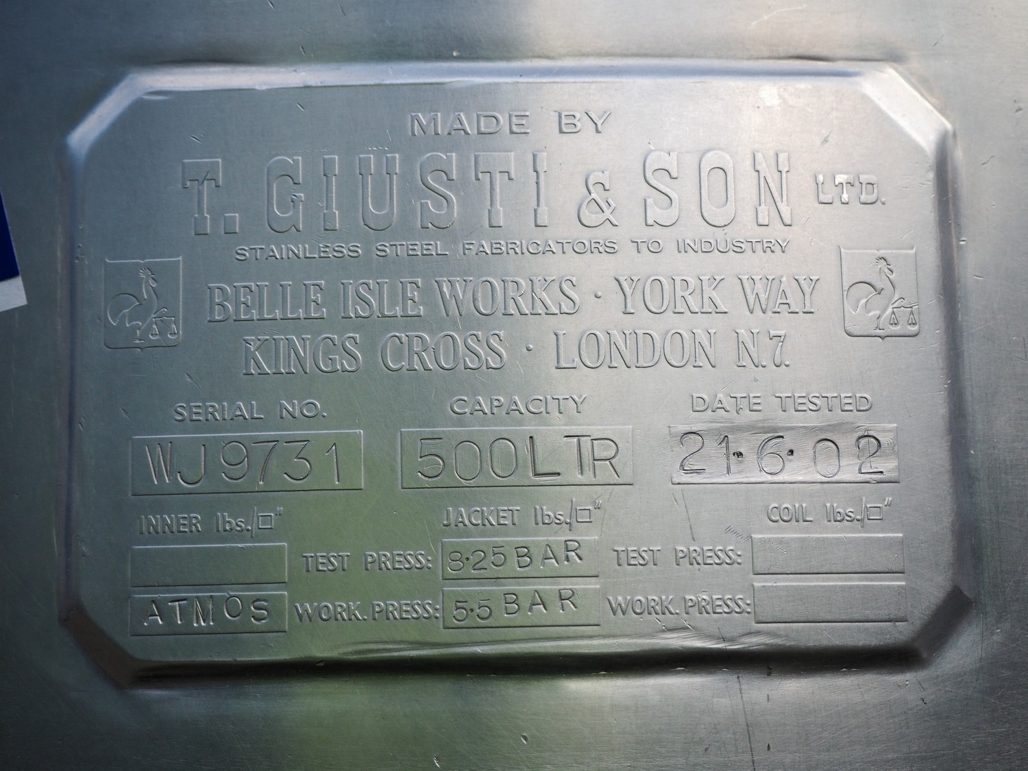 T.Giusti & Son LTD s/s mixing tank with bottom part double jacked, serial number: WJ9731, year of construction: 21.6.02, capacity: 500 liter, dimensions: 1150 mm x 1200 mm x 1900 mm.