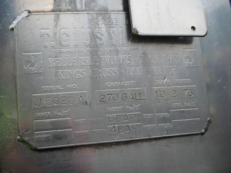 T.Giusti & Son LTD s/s mixing tank with bottom part double jacketed, serial number: J6020A, year of construction: 10.2.76, capacity: 270 gallon, dimensions: 1900 mm x 1250 mm x 1620 mm.