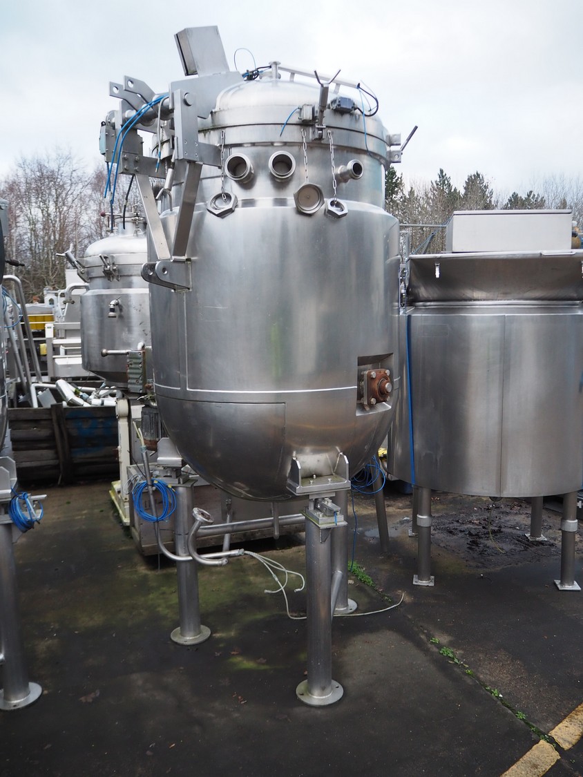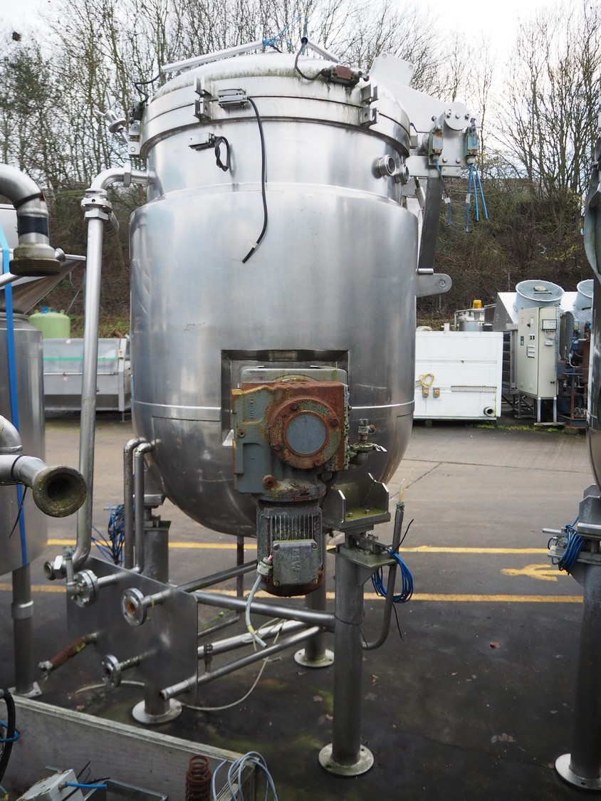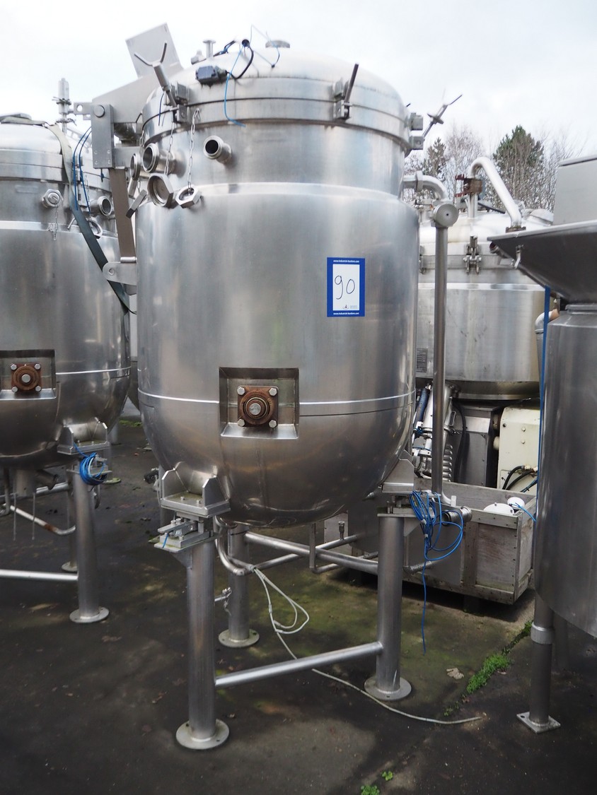 Giusti s/s double jacked tank with mixing arm on weighing cells, serial number: M11664A, year of construction: 28.11.94, capacity: 500 liter, dimensions: 1450 mm x 1280 mm x 2700 mm.