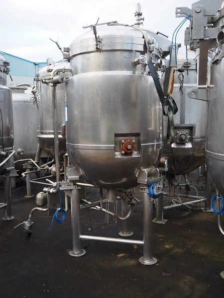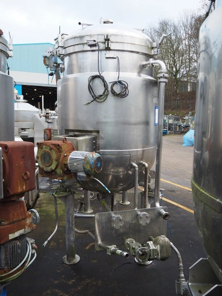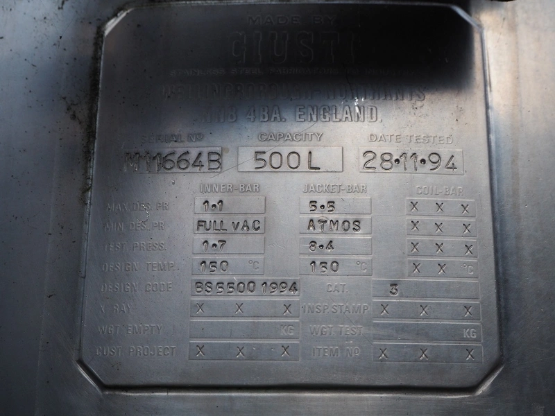 Giusti s/s double jacketed tank with mixing arm on weighing cells, serial number: M11664B, year of construction: 28.11.94, capacity: 500 liter, dimensions: 1450 mm x 1280 mm x 2700 mm.