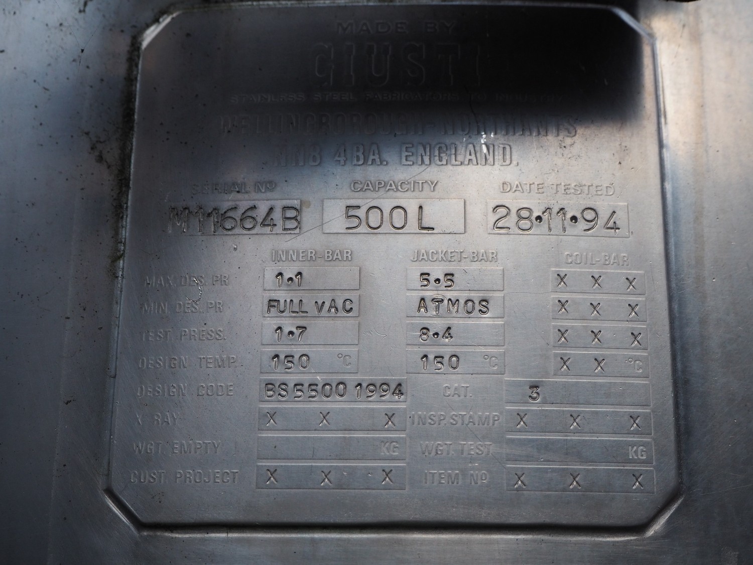 Giusti s/s double jacked tank with mixing arm on weighing cells, serial number: M11664B, year of construction: 28.11.94, capacity: 500 liter, dimensions: 1450 mm x 1280 mm x 2700 mm.