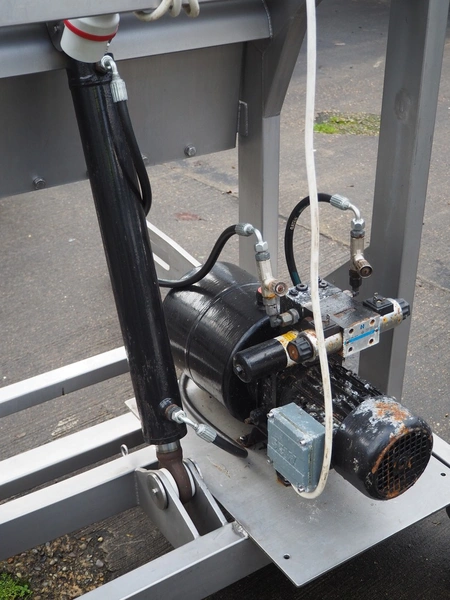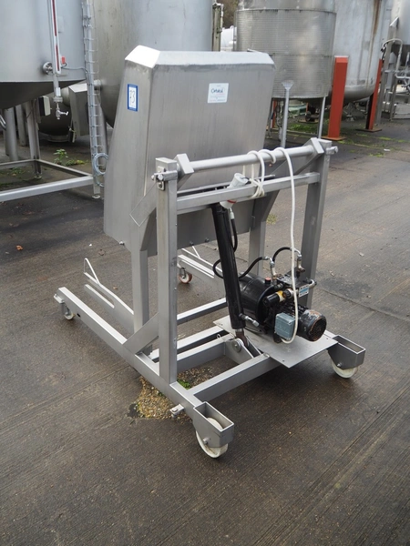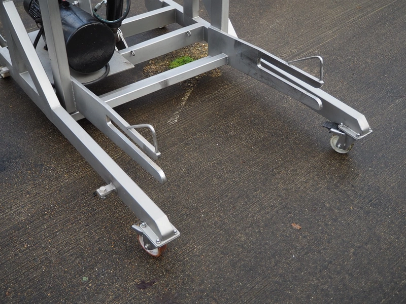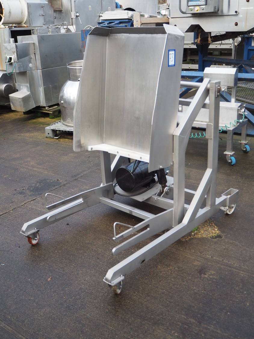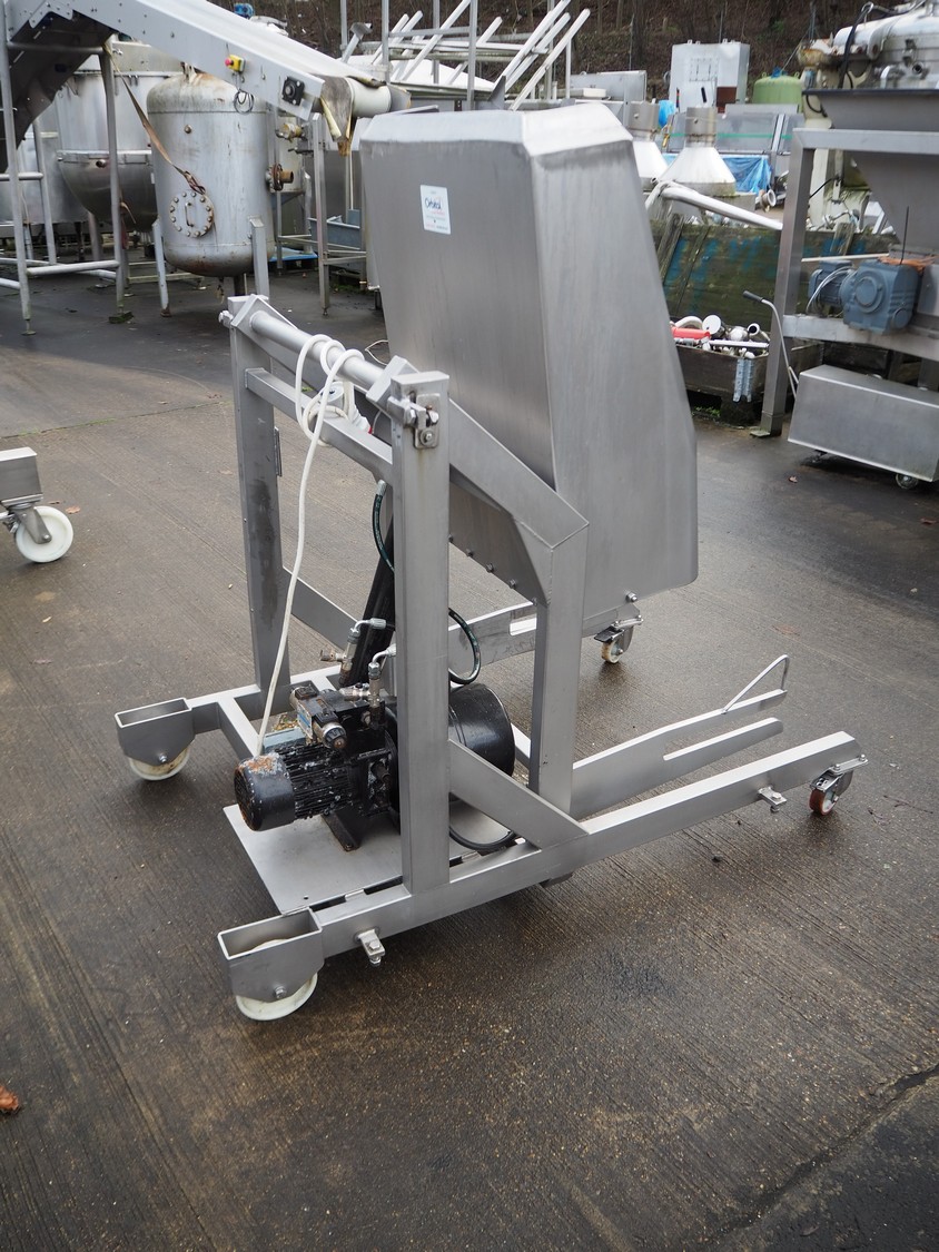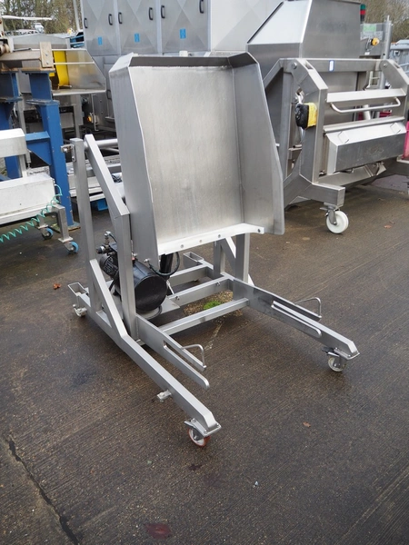 Mobile s/s tilting device for 200 liter meat bins, tilting height: 1100 mm, total dimensions: 1500 mm x 1000 mm x 1500 mm.