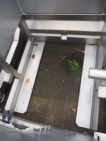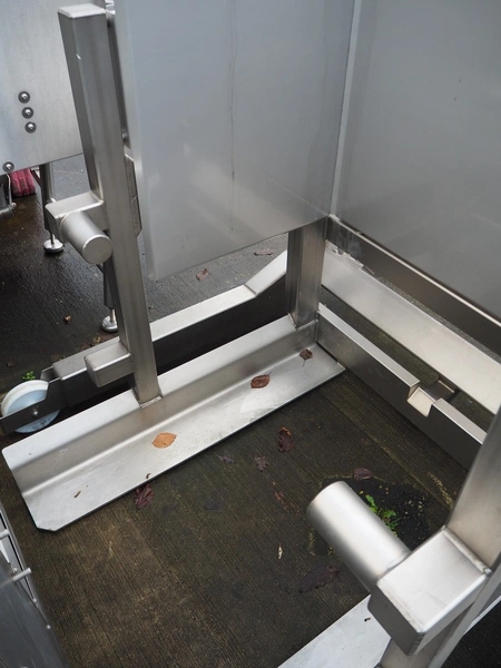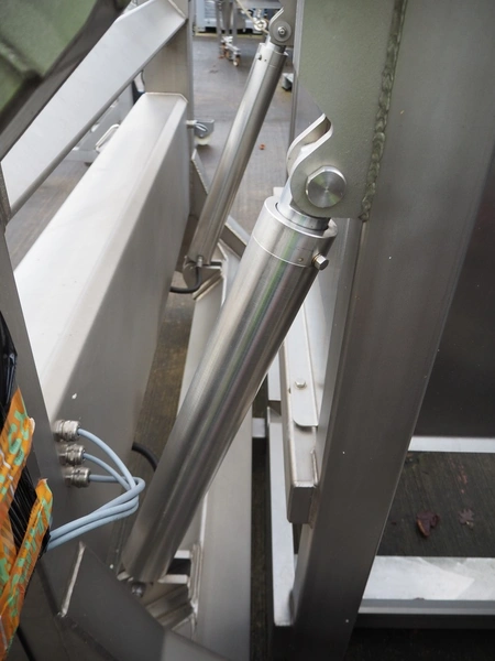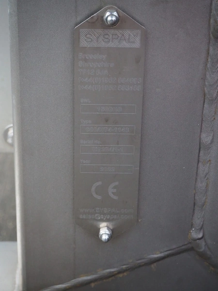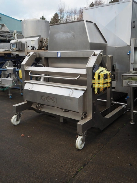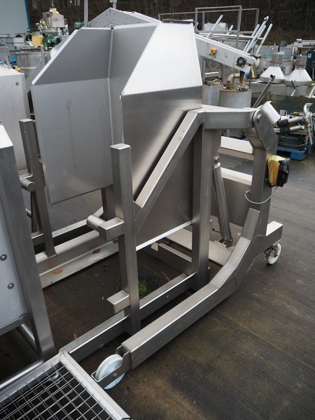 Syspal mobile s/s tilting device for pallet boxes, type: 600/HT4-1143, serial number: K9284/1-1, year of construction: 2022, capacity: 1500 kg, tilting height: 1380 mm, total dimensions: 2100 mm x 2000 mm x 2000 mm.