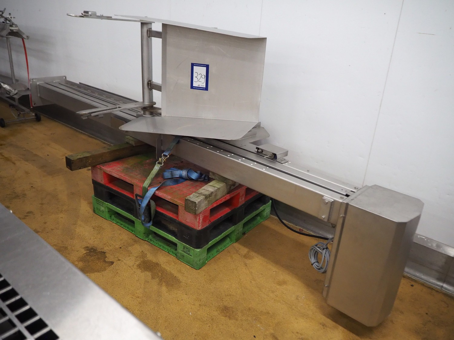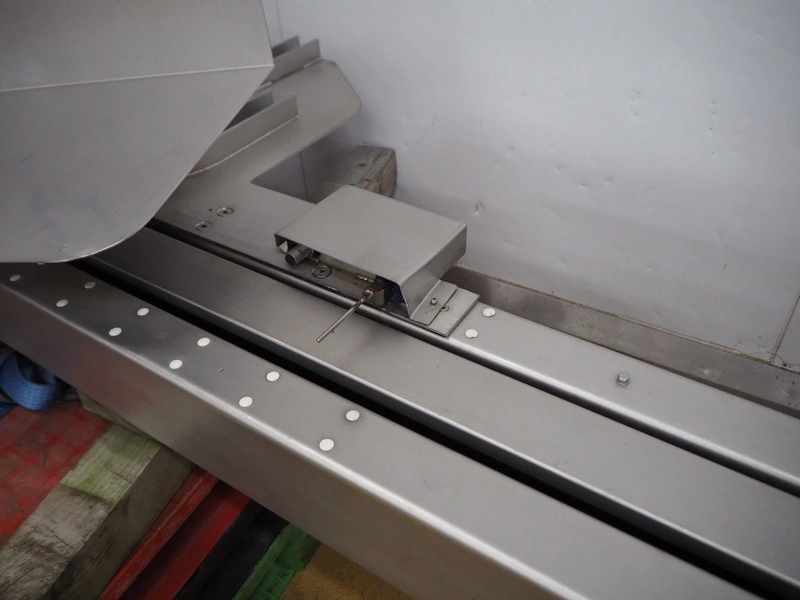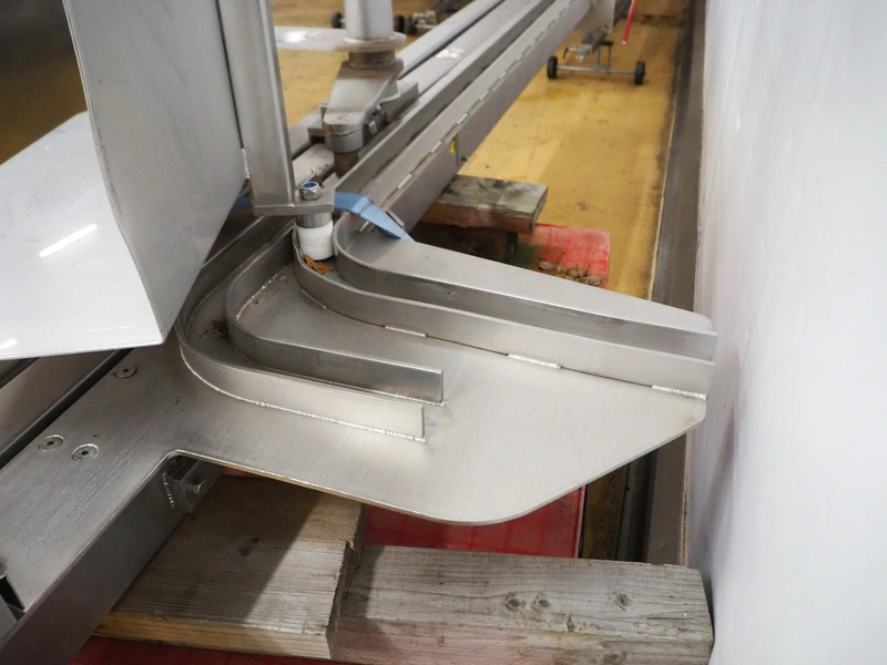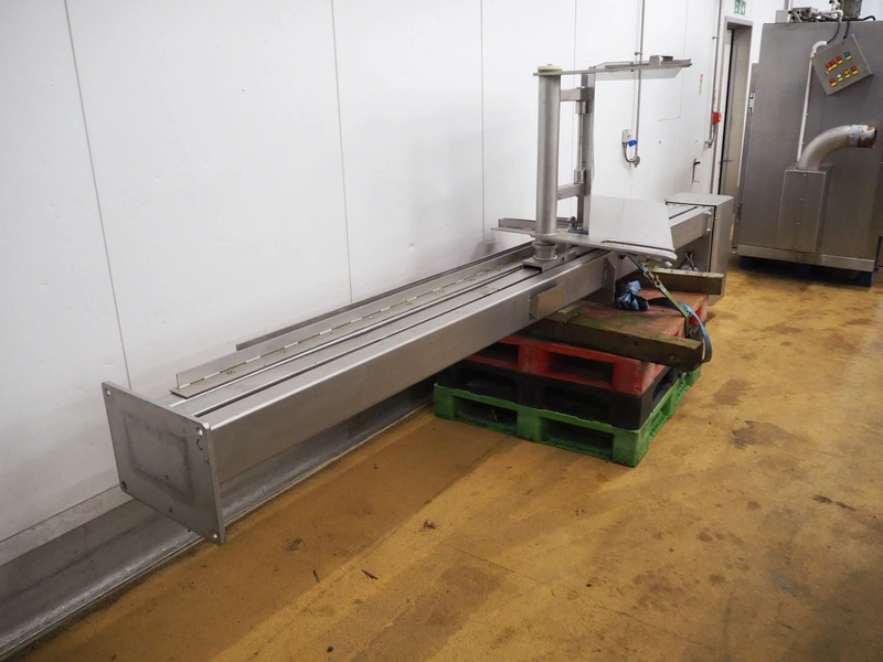 Lifter for 200 liter meat bins, lifting height: 2800 mm, total dimensions: 4200 mm x 1200 mm x 1150 mm.