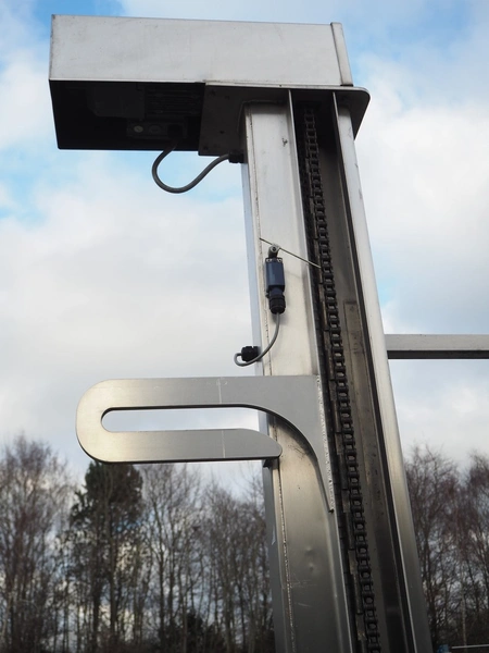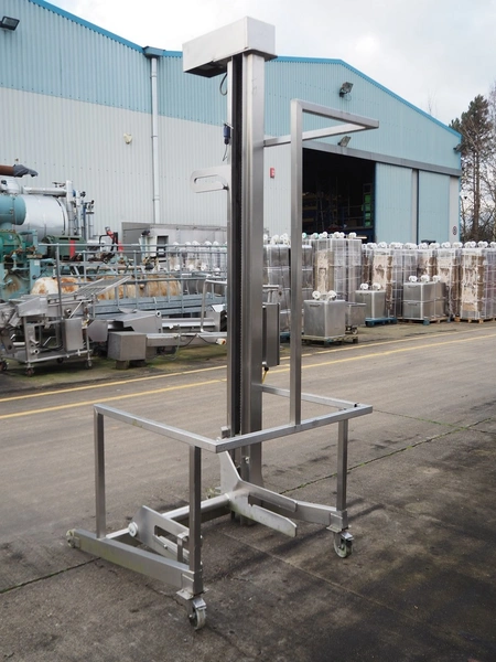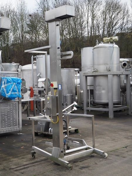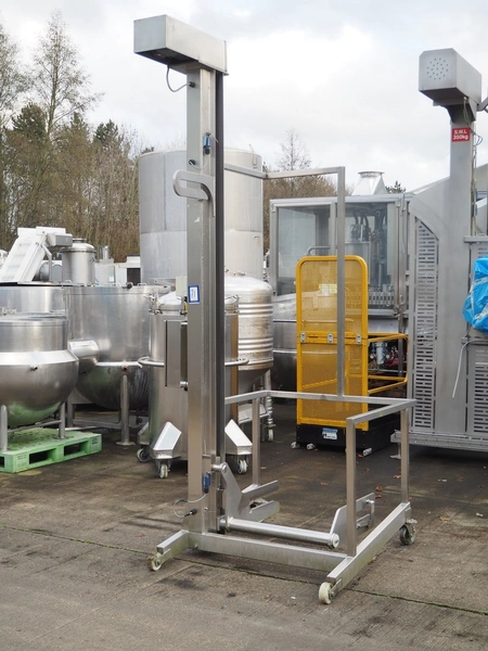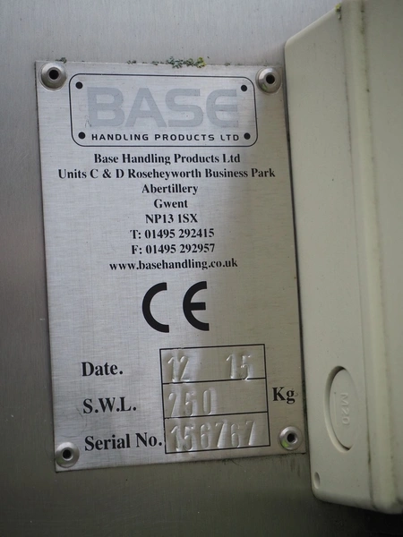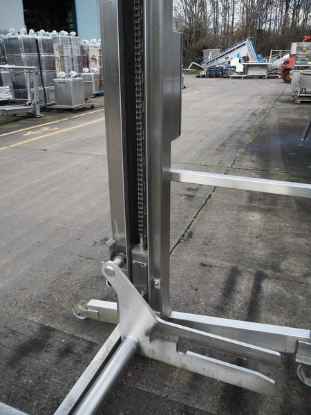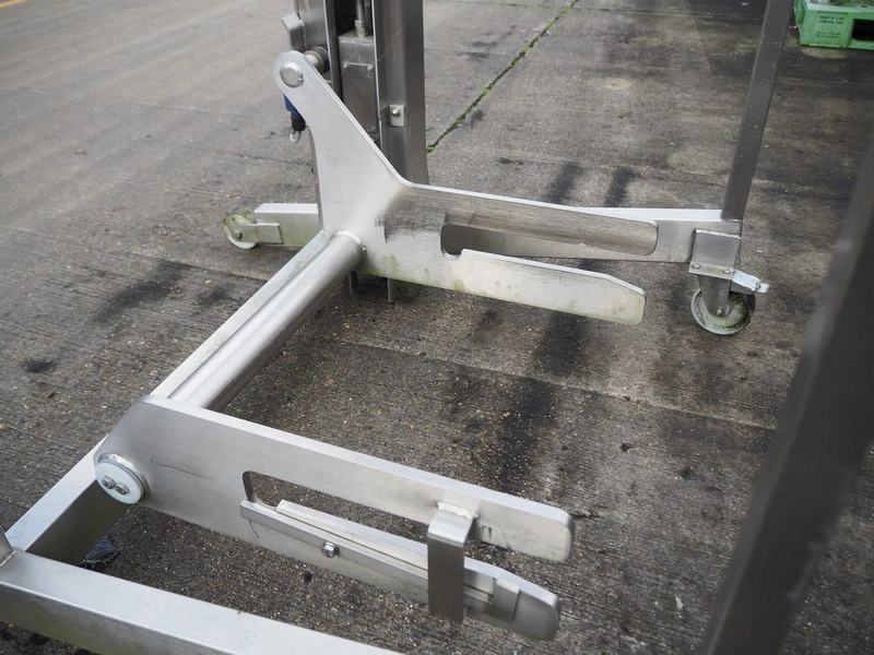 Base Handling Products Ltd mobile lifter for 200 liter meat bins, serial number: 156767, year of construction: 12-15, capacity: 250 kg, elevating height: 21170 mm, total dimensions: 1400 mm x 1250 mm x 3100 mm.