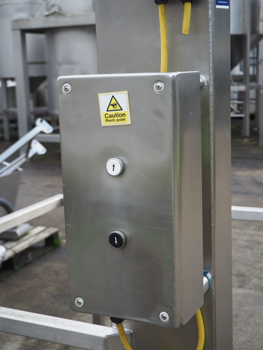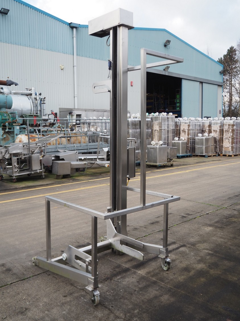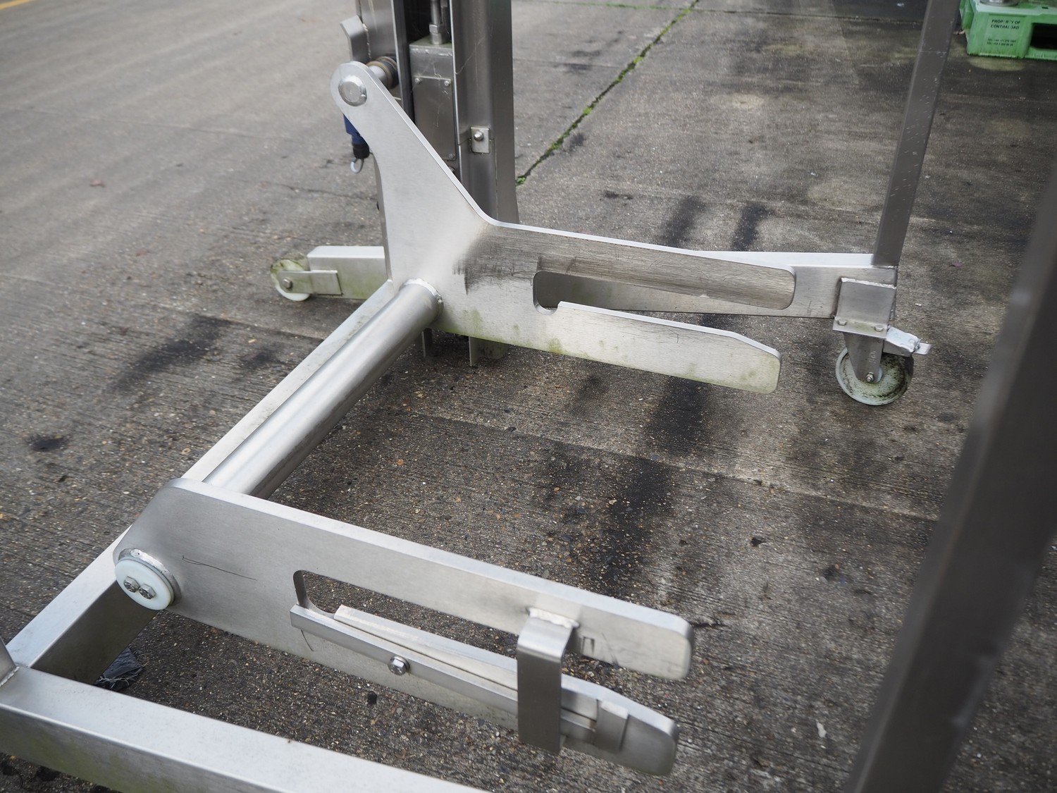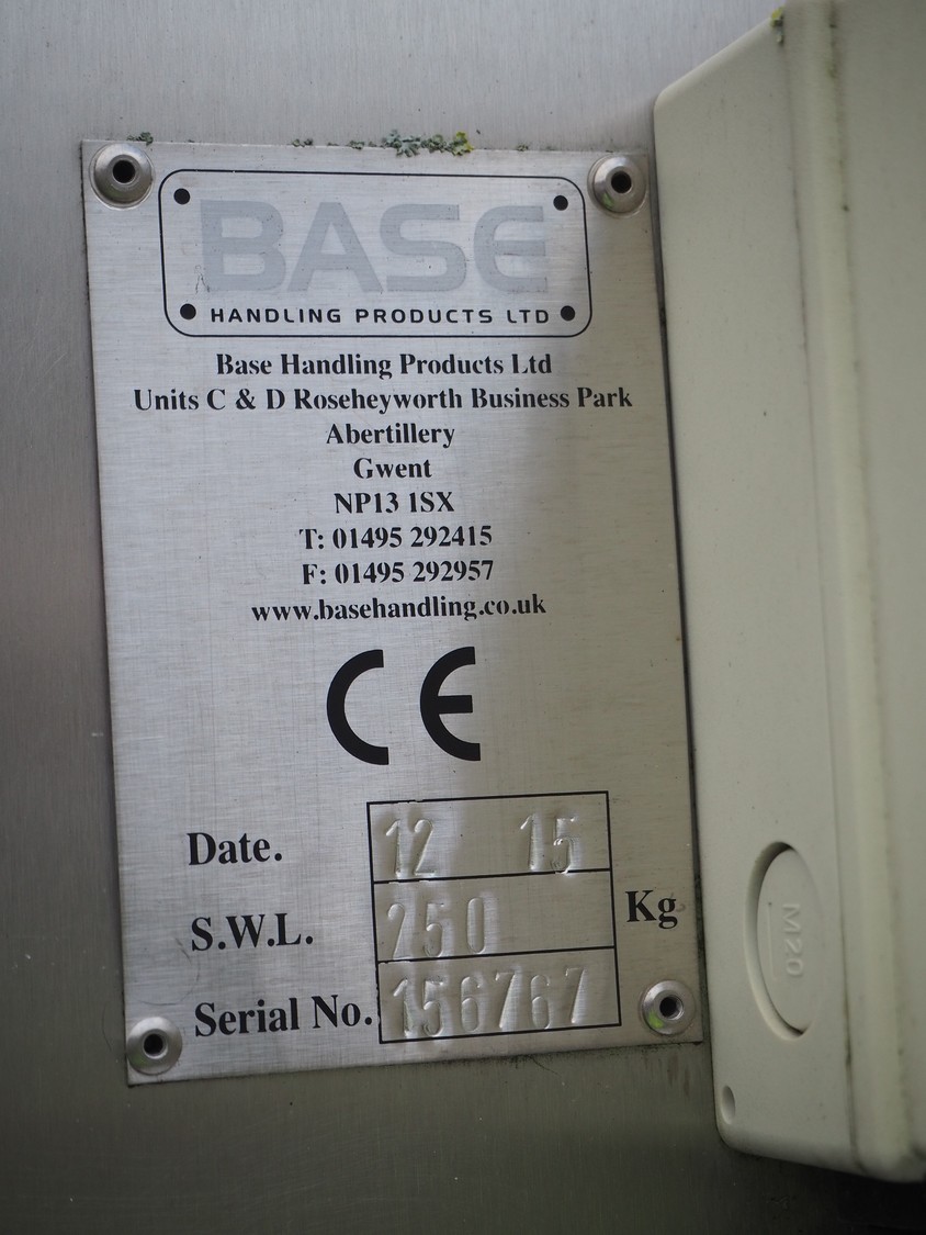Base Handling Products Ltd mobile elevator for 200 liter meat bins, serial number: 156767, year of construction: 12-15, capacity: 250 kg, elevating height: 21170 mm, total dimensions: 1400 mm x 1250 mm x 3100 mm.