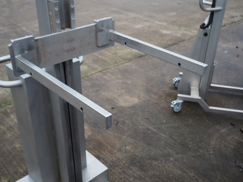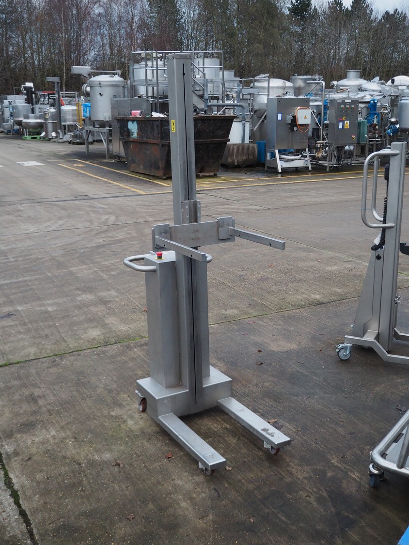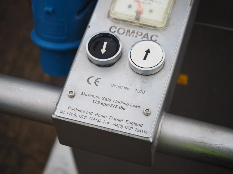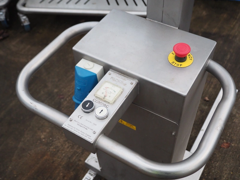 Packline mobile lifter, model: Compac, serial number: 1526, capacity: 125 kgs, lifting height: 1900 mm, platform: 460 mm x 500 mm, total dimensions: 1100 mm x 500 mm x 2080 mm.