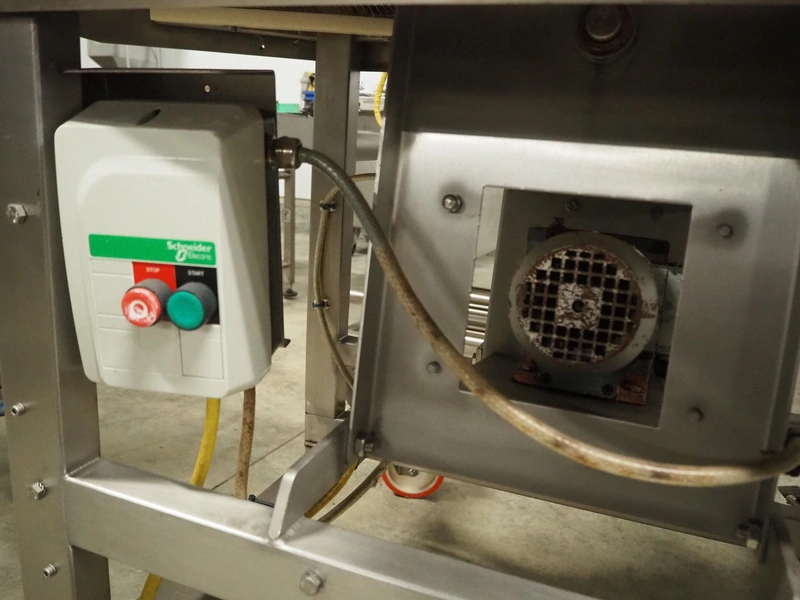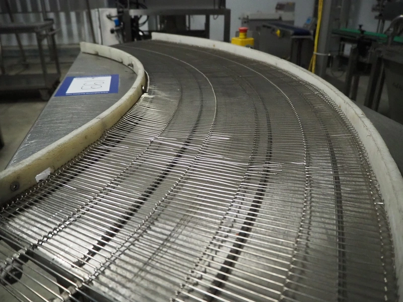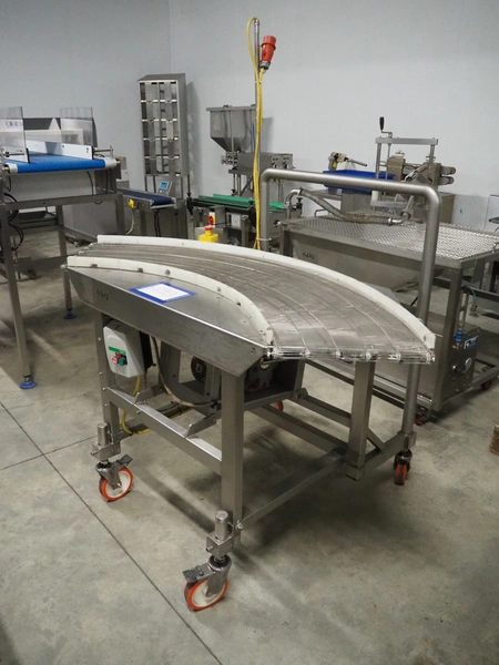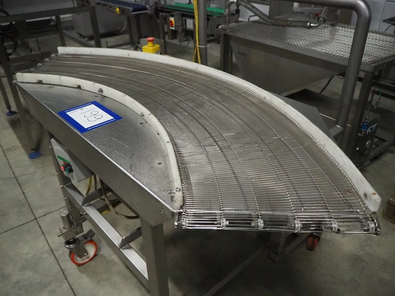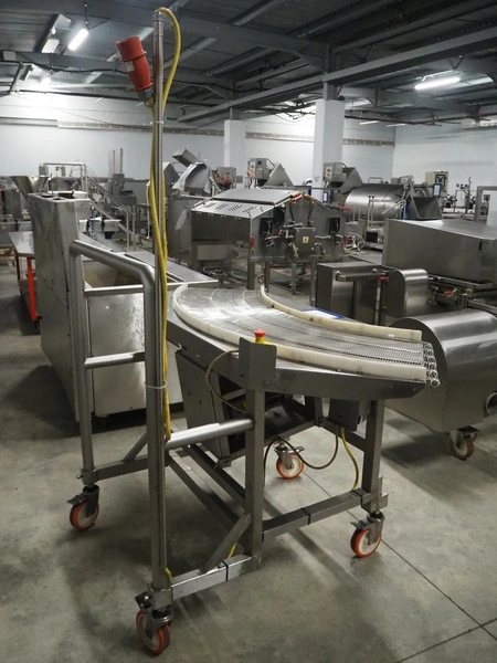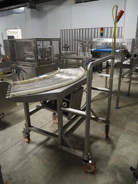 Mobile 45° curve conveyor, s/s mesh belt, belt width: 400 mm, total dimensions: 1700 mm x 1100 mm x 1930 mm.