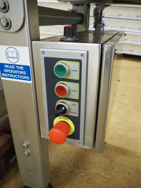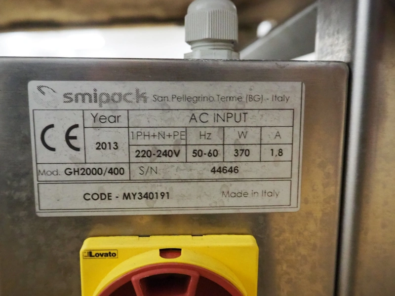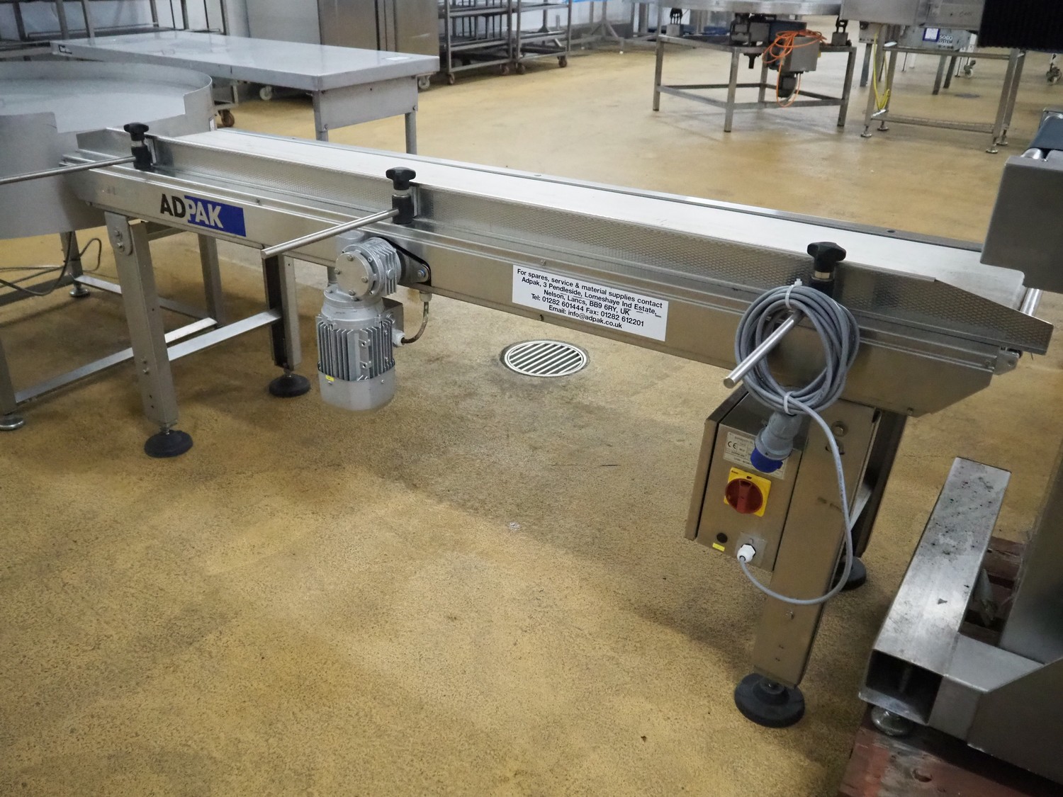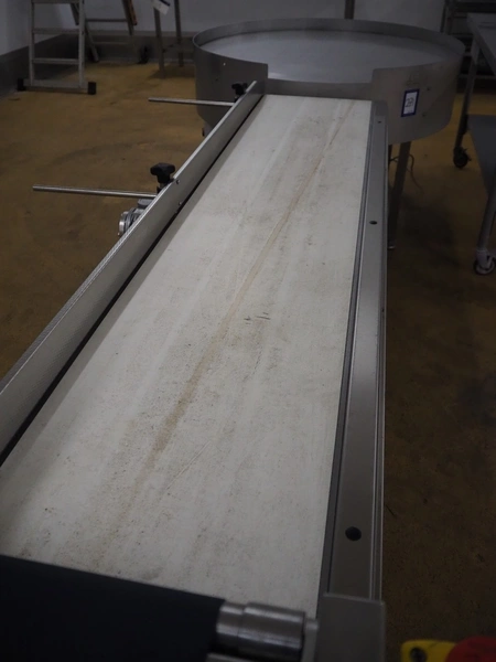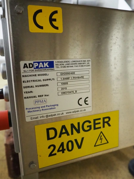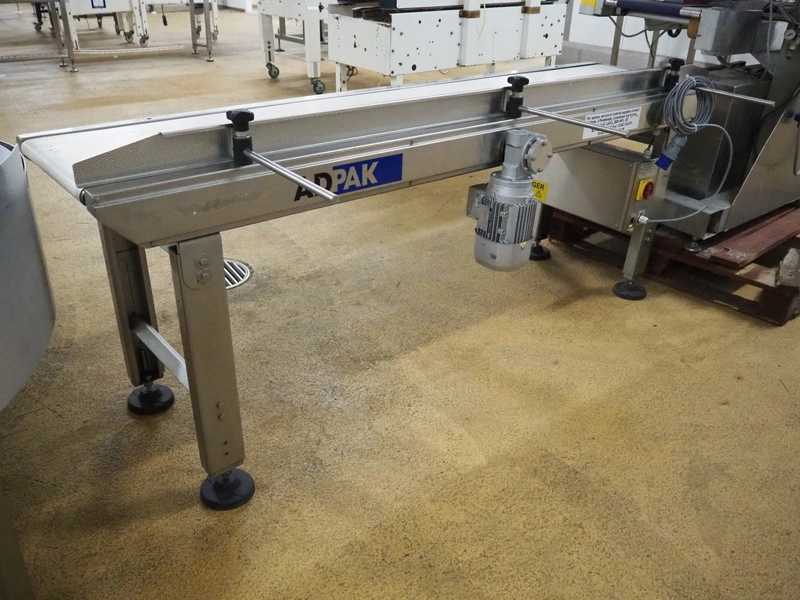 ADPAK transport belt, model: GH2000/400, serial number: 10685, year of construction: 2015, 1 Ph, 1.8 A, plastic belt, belt width: 390 mm, total dimensions: 2070 mm x 820 mm x 830 mm.
