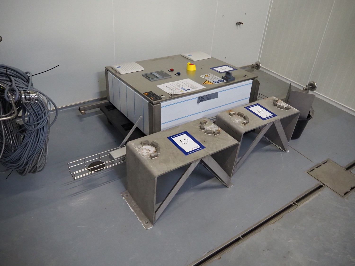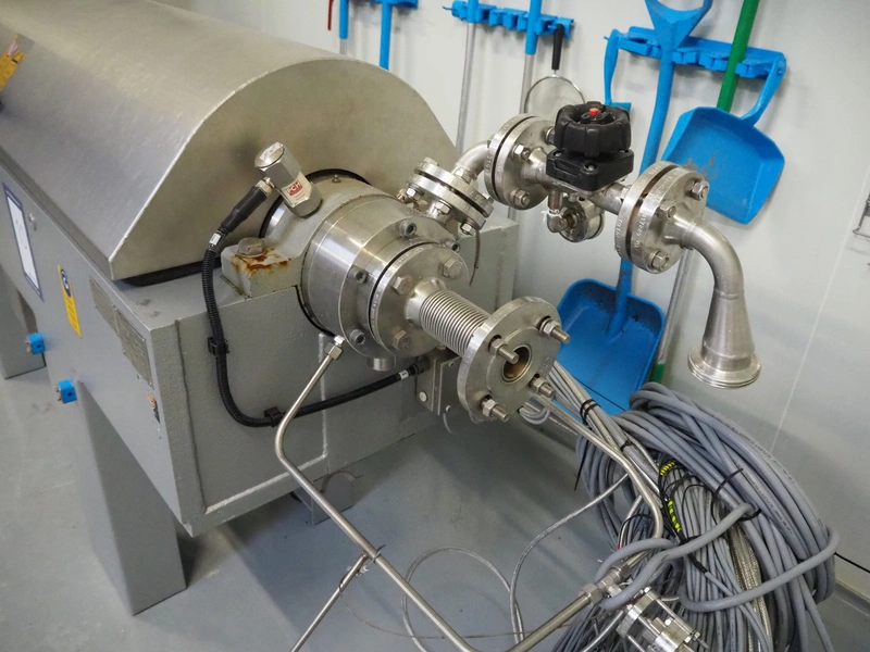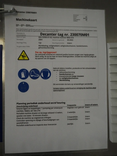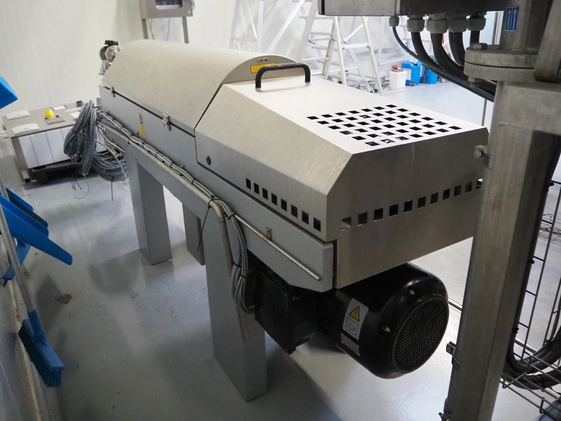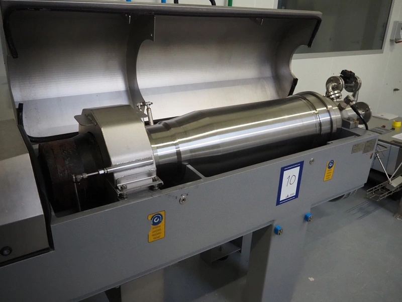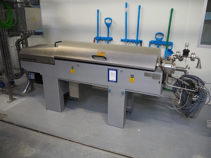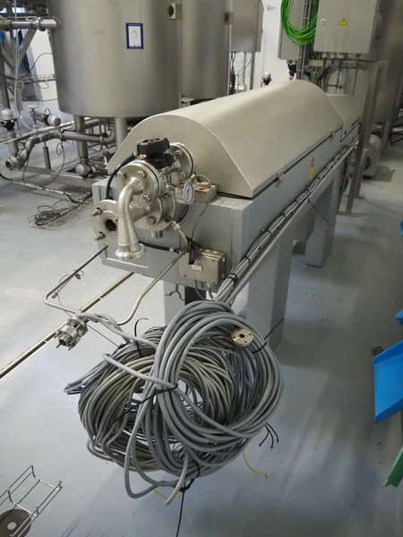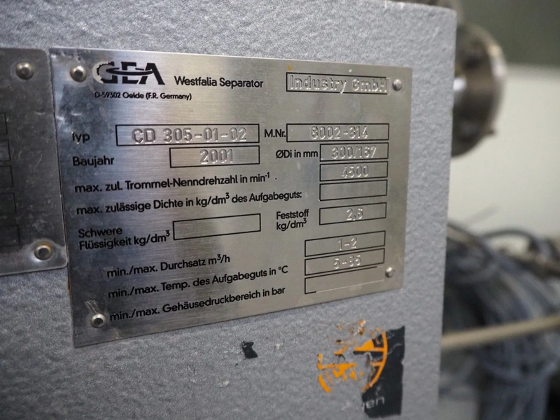 GEA Westfalia Separator AG decanter, model: CD 305-01-02, serial number: 8002314, year of construction: 2001, maximum rpm: 4500, capacity: 2.6 kg/dm³, dimensions decanter: 3100 mm x 650 mm x 1250 mm, dimensions switch cabinet: 950 mm x 400 mm x 2550 mm, including 2 steel frames, dimensions: (2x) 650 mm x 260 mm x 400 mm.