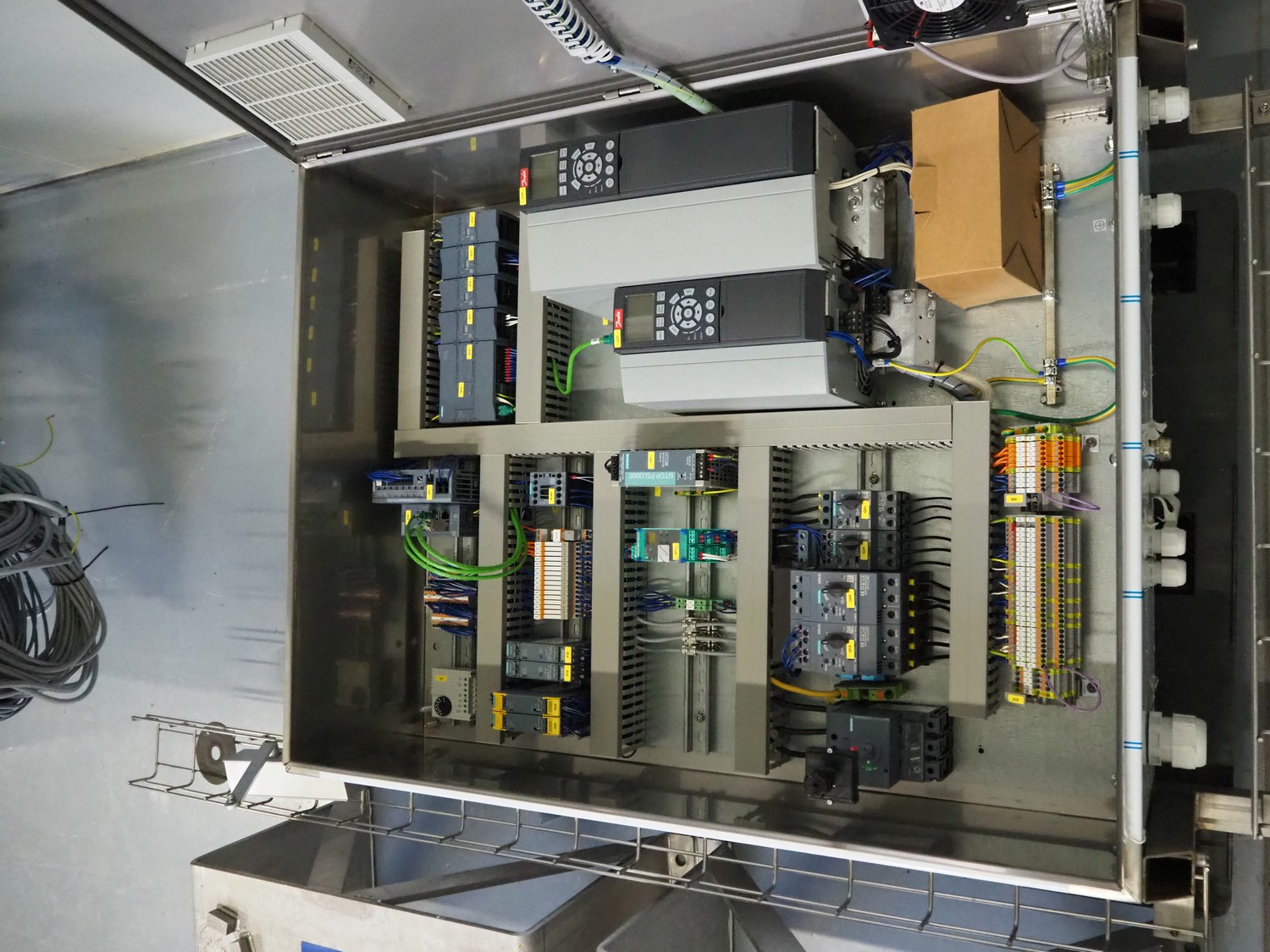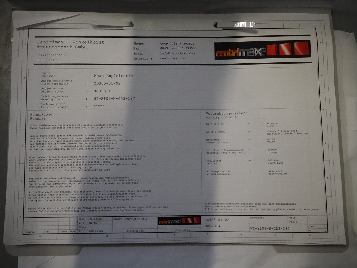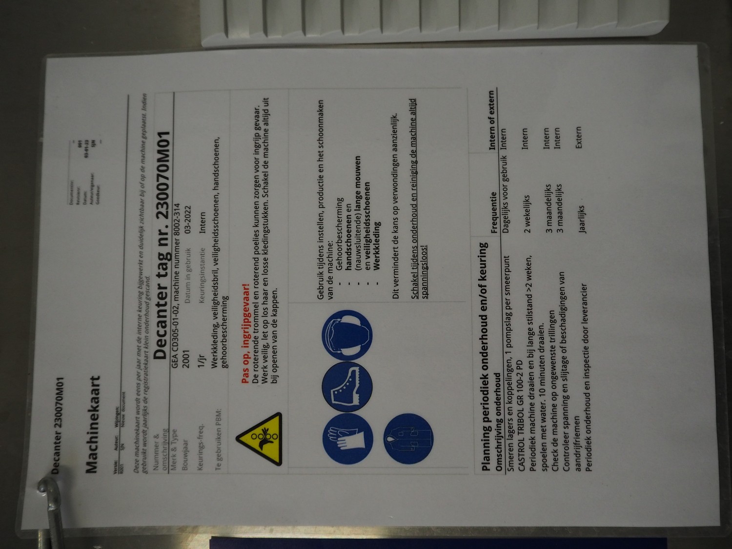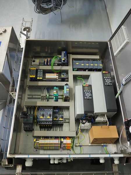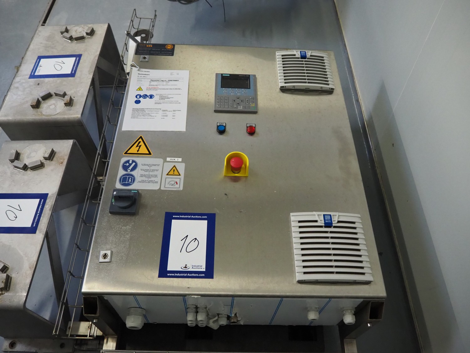 GEA Westfalia Separator AG decanter, model: CD 305-01-02, serial number: 8002314, year of construction: 2001, maximum rpm: 4500, capacity: 2.6 kg/dm³, dimensions decanter: 3100 mm x 650 mm x 1250 mm, dimensions switch cabinet: 950 mm x 400 mm x 2550 mm, including 2 steel frames, dimensions: (2x) 650 mm x 260 mm x 400 mm.