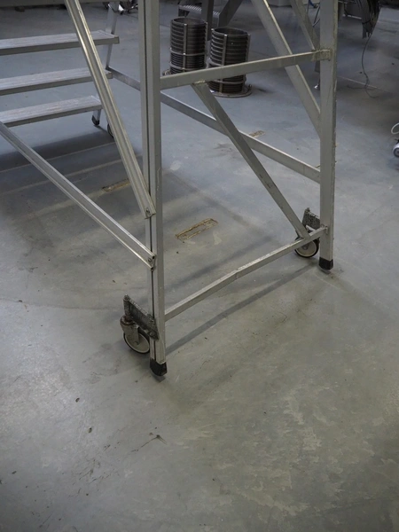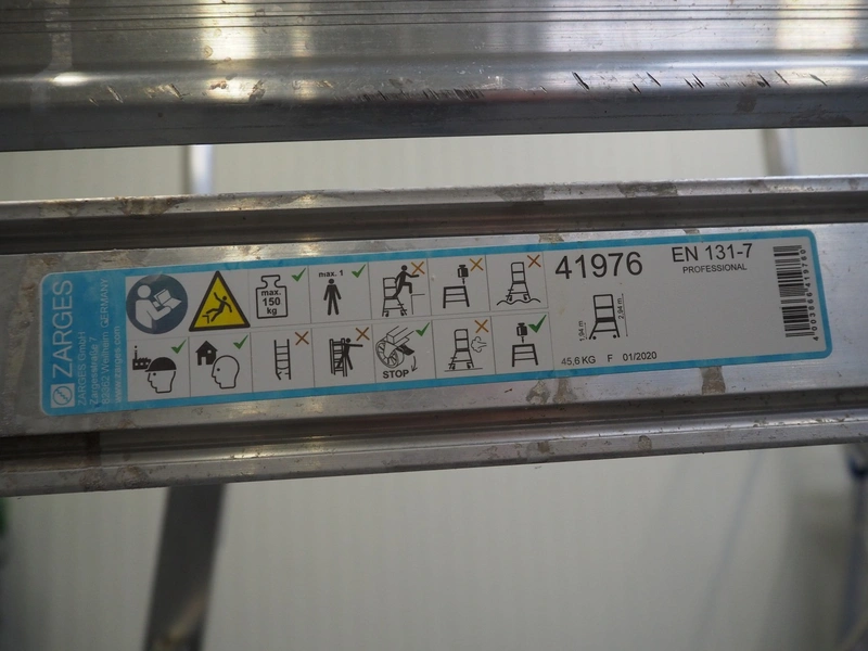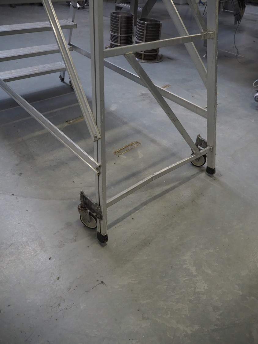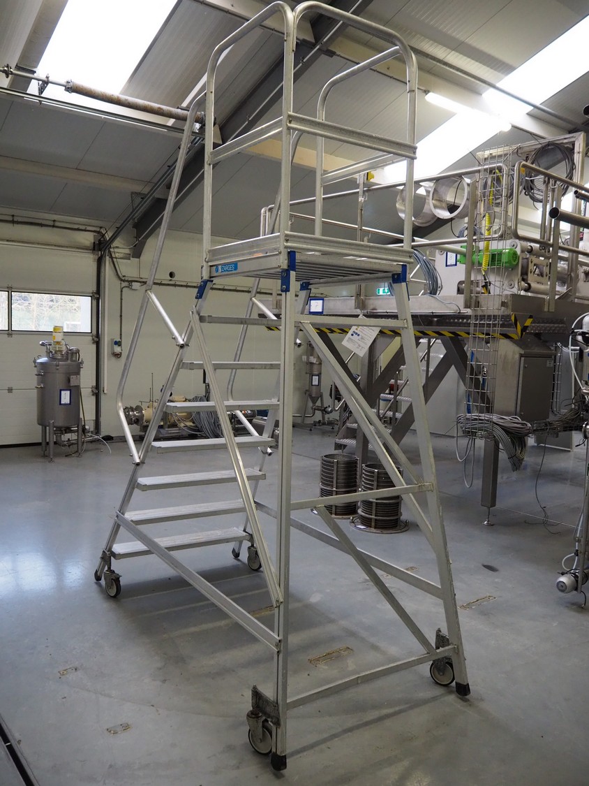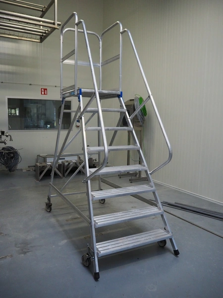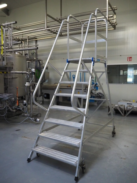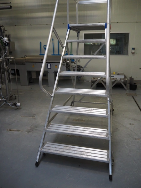 Zarges GmbH mobile aluminium platform, maximum capacity: 150 kg, 7 steps, working height: 1950 mm, total dimensions: 2250 mm x 950 mm x 2950 mm.