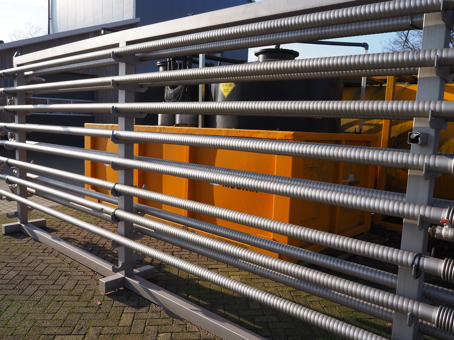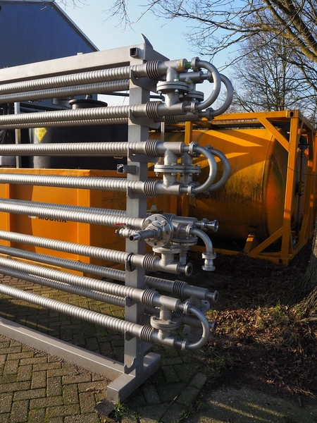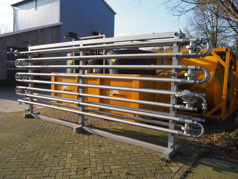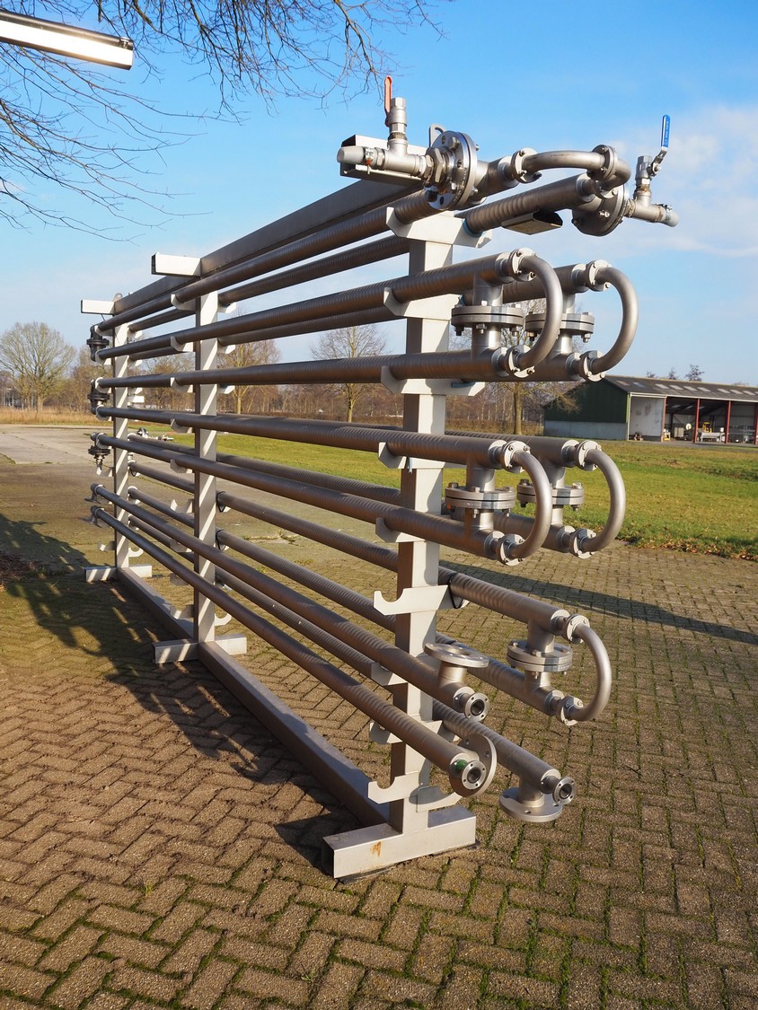 Alfa Laval tubular heat exchanger, type: 1x15VLO1x38/76-60-304/316L-CD, serial number: P03071/5-1, year of construction: 2003, test pressure: 4.5/27 bar, maximum temperature: 105° Celsius, dimensions: 6400 mm x 560 mm x 2400 mm.