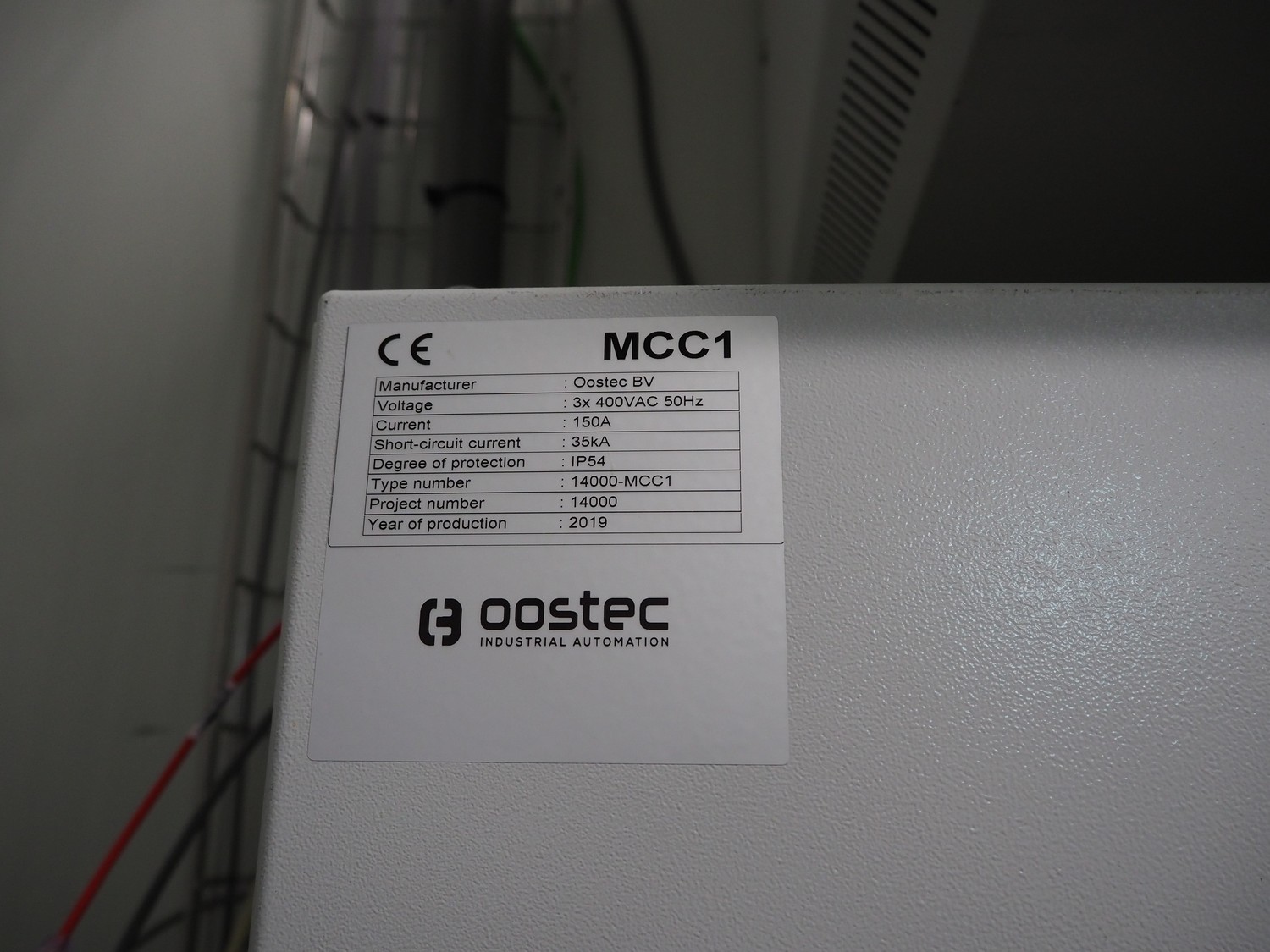 Oostec switch cabinet, type: 14000-MCC1, number: 14000, year of construction: 2019, 400 V, 3 Ph, 50 Hz, 150 A, dimensions: 3600 mm x 550 mm x 2000 mm.