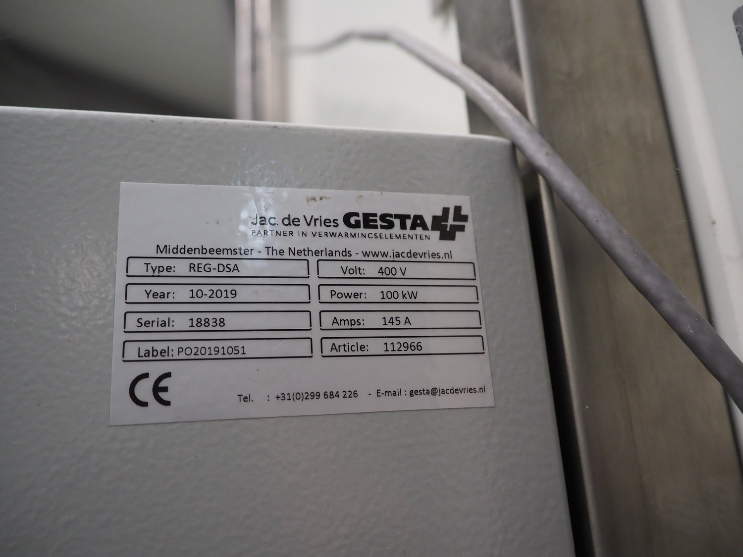GESTA switch cabinet, type: REG-DSA, serial number: 18838, year of construction: 10/2019, 400 V, 145 A, 100 kW, dimensions: 800 mm x 400 mm x 800 mm.