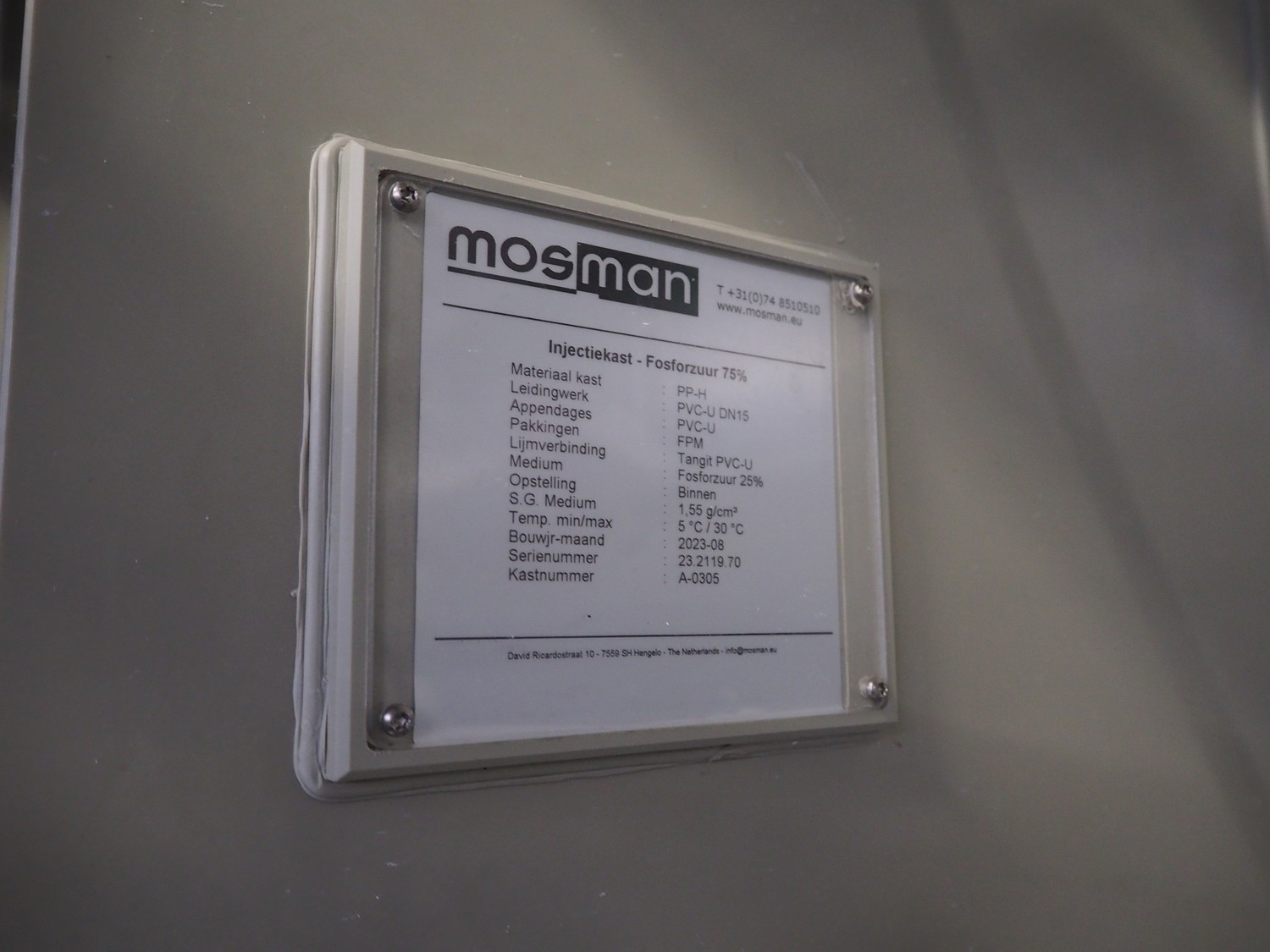 Mosman phosphoric acid injection cabinet, serial number: 23.2119.70, year of construction: 08/2023, dimensions: 400 mm x 450 mm x 600 mm.