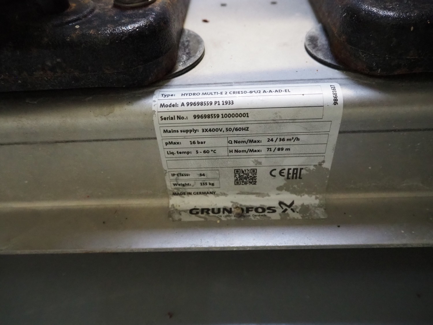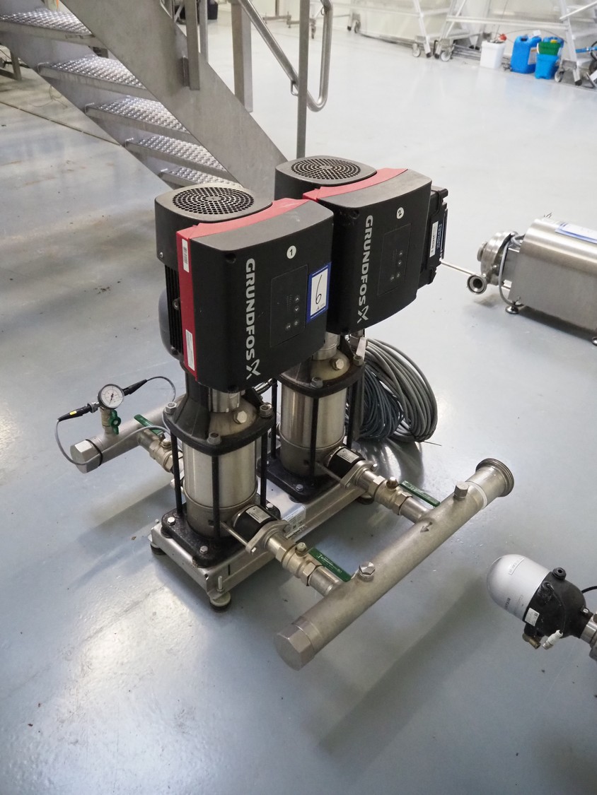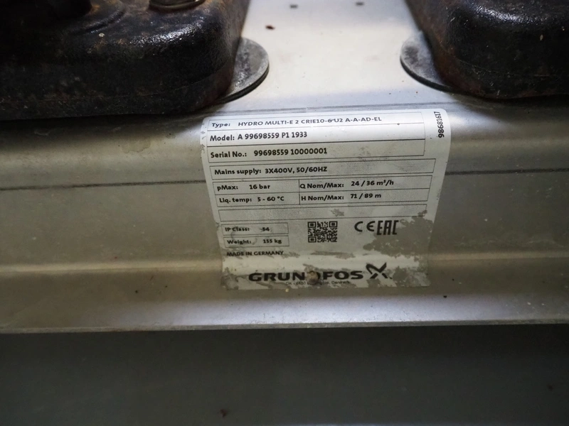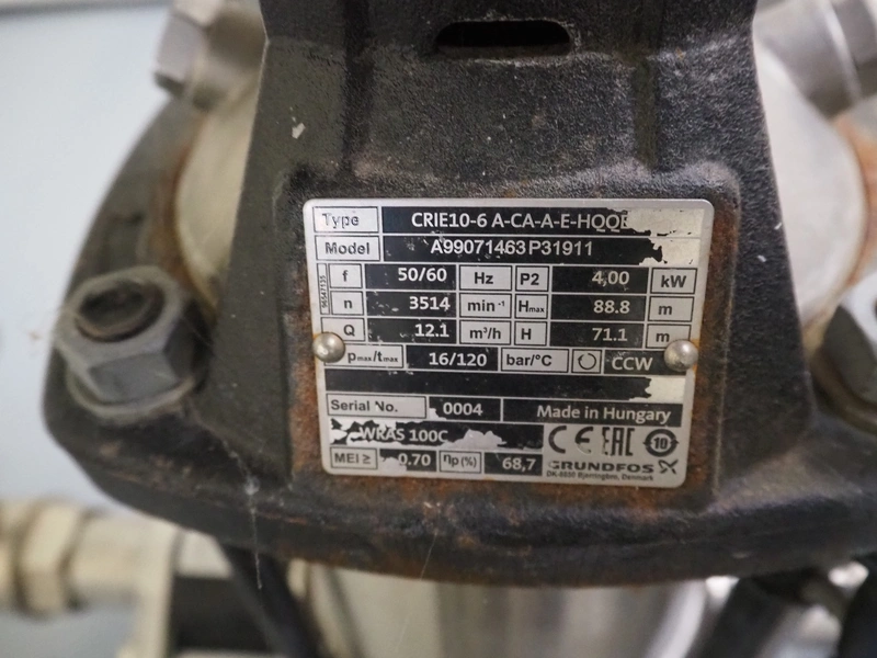 2 Grundfos circulation pumps, type: (2x) CRIE10-6 A-CA-A-E-HQQE, model: A99071463P31911, 50/60 Hz, 4 kW, capacity: 12.1 m³ per hour, dimensions: 1000 mm x 800 mm x 950 mm.