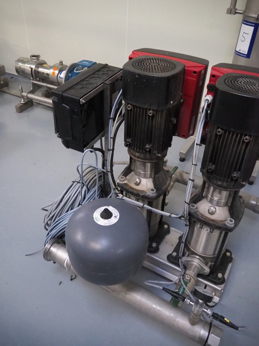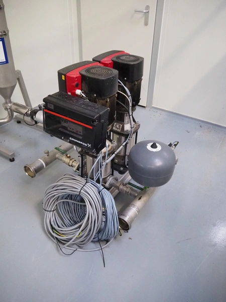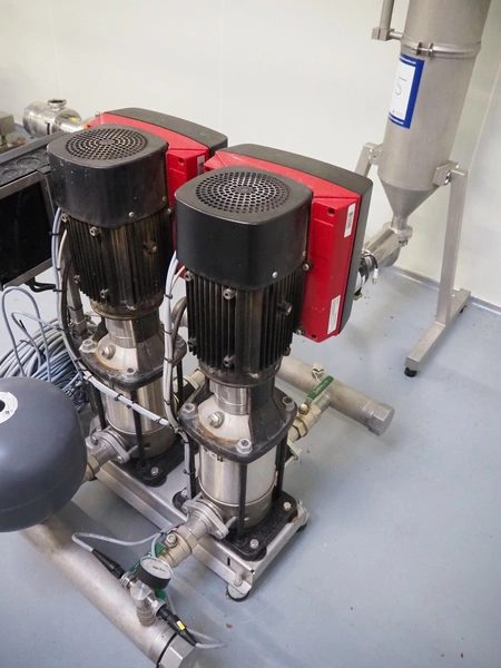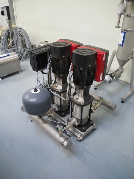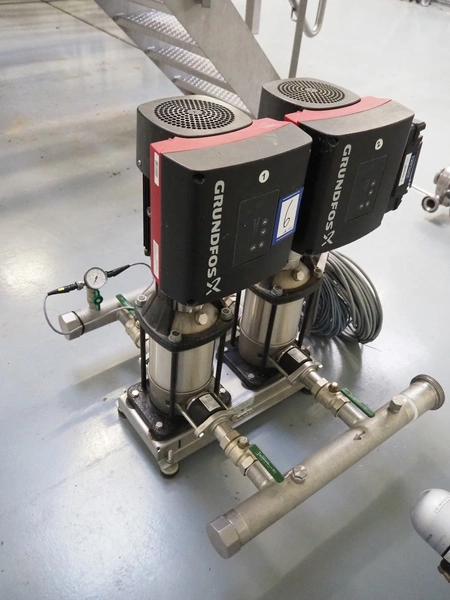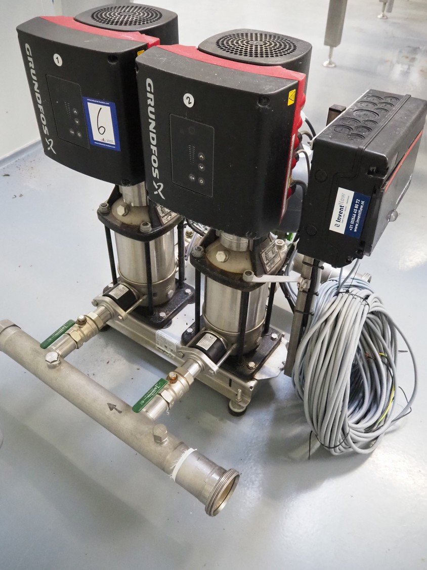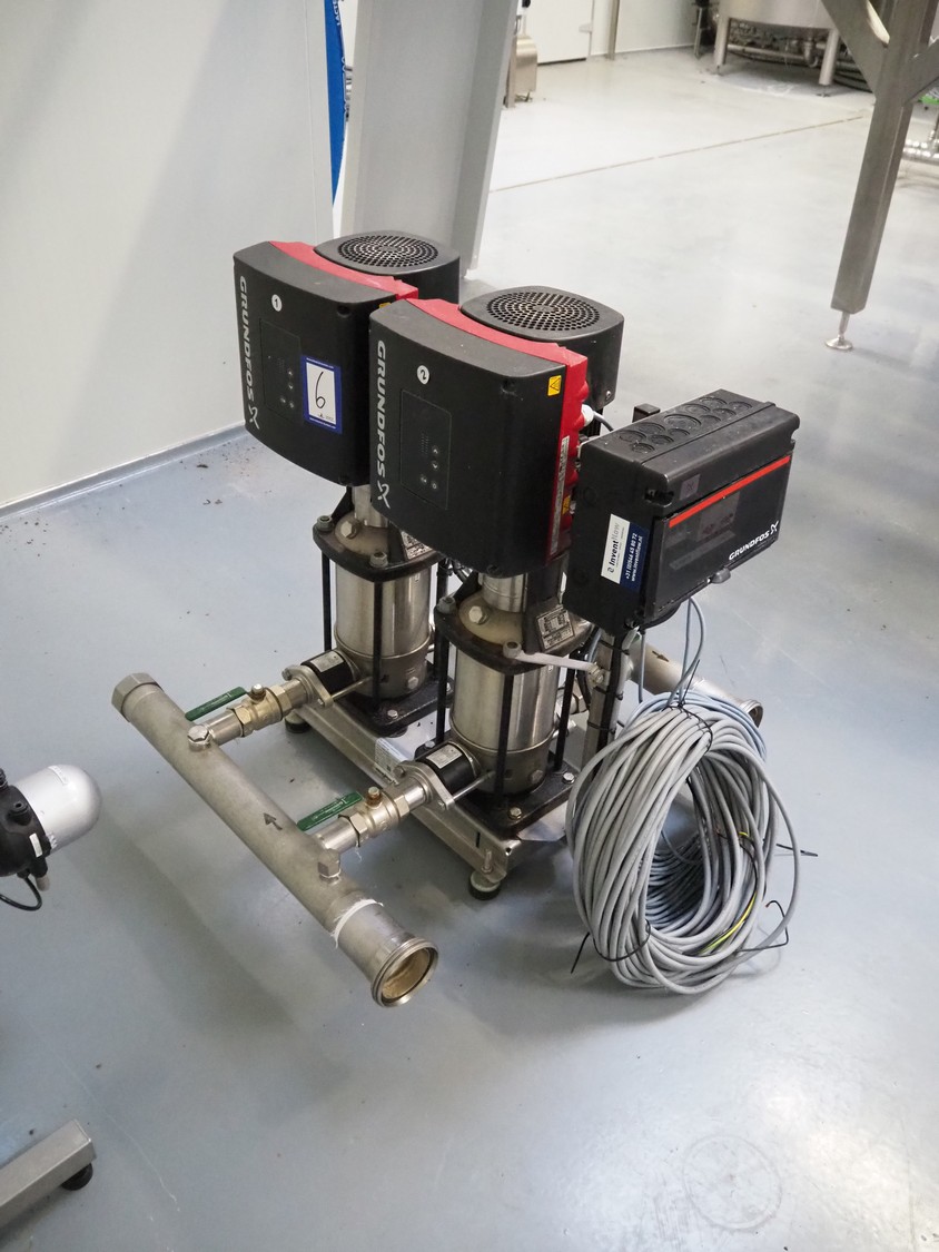 2 Grundfos circulation pumps, type: (2x) CRIE10-6 A-CA-A-E-HQQE, model: A99071463P31911, 50/60 Hz, 4 kW, capacity: 12.1 m³ per hour, dimensions: 1000 mm x 800 mm x 950 mm.