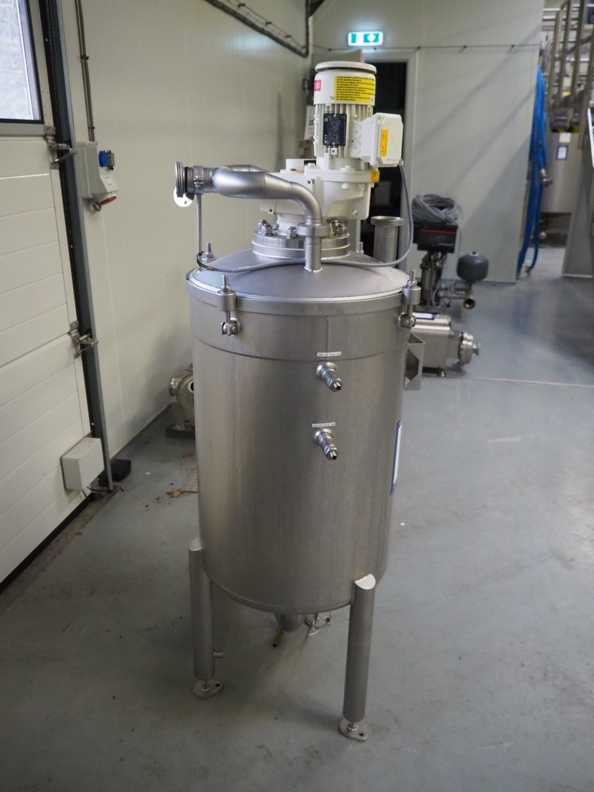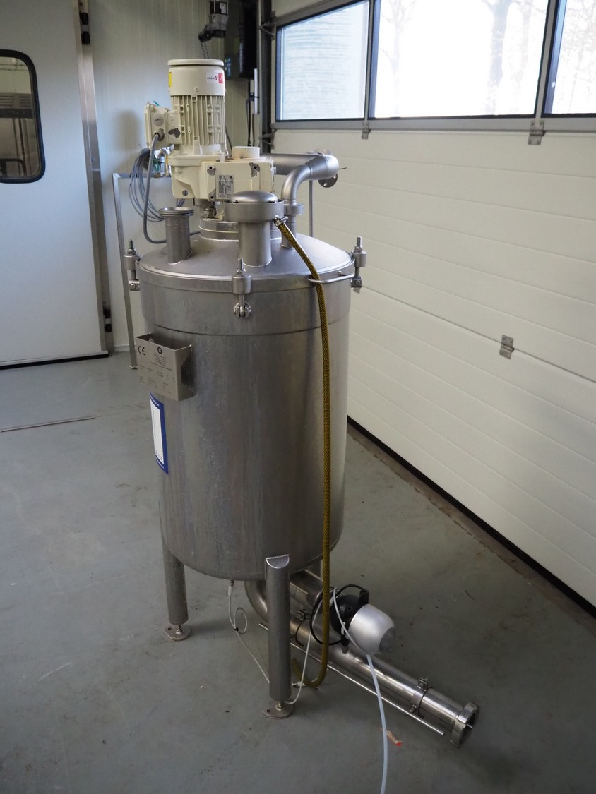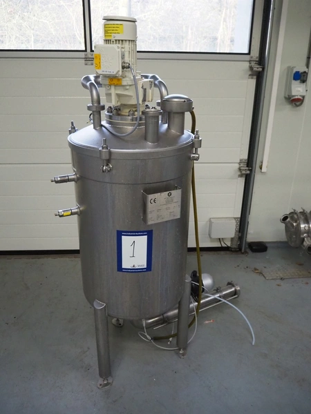 BAC Machinebouw B.V. s/s double jacketed mixing tank with agitator, year of construction: 2019, volume: 100 liter, weight: 90 kg, dimensions: 1100 mm x 650 mm x 1670 mm.