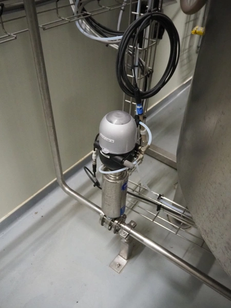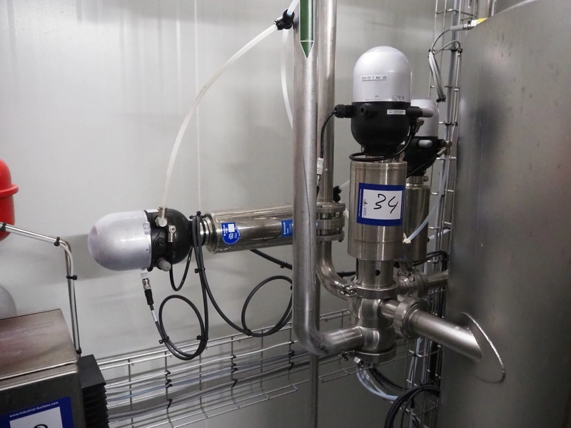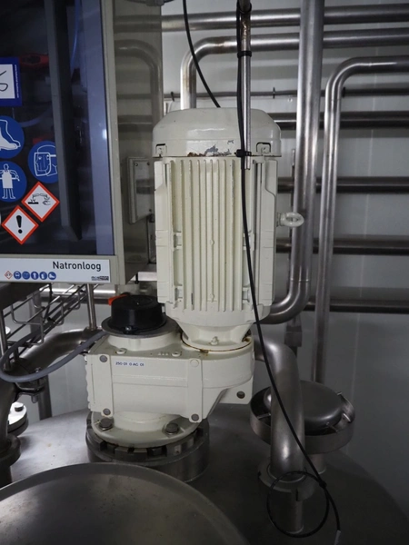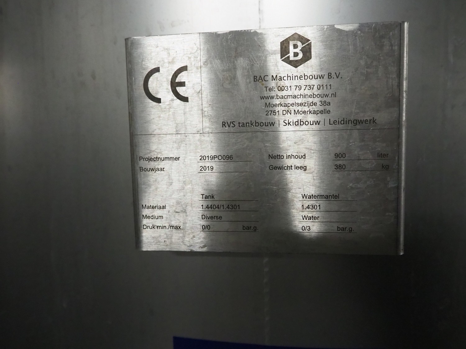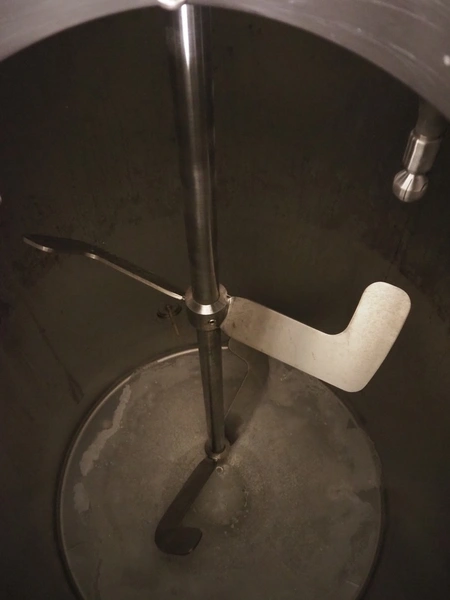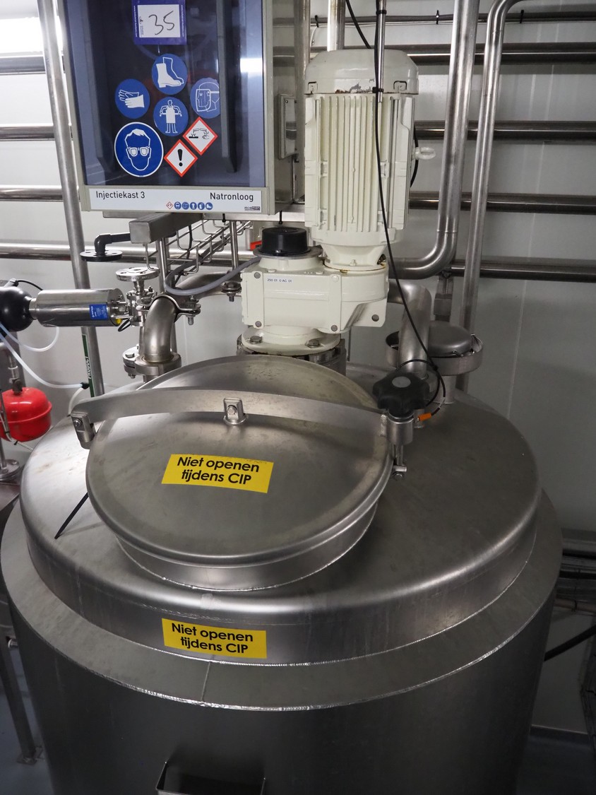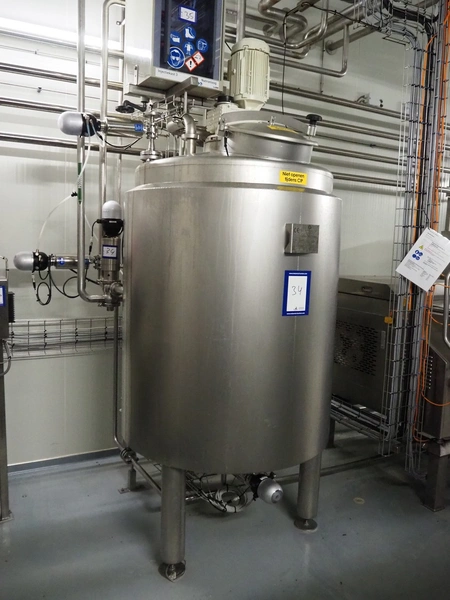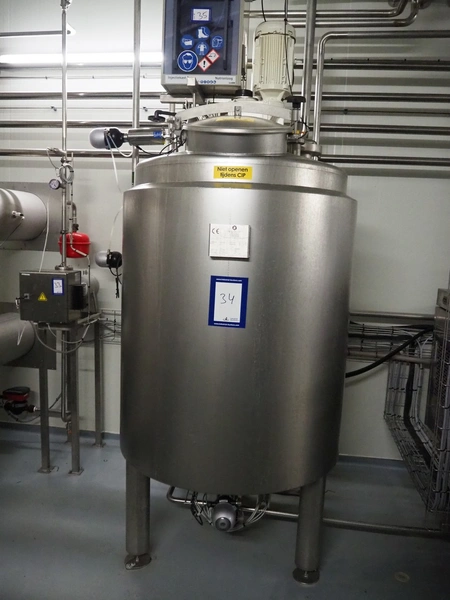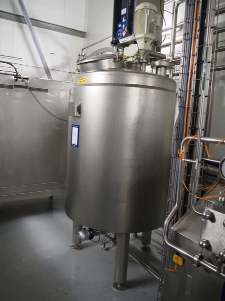 BAC Machinebouw B.V. s/s double jacketed mixing tank with agitator and 6 Pentair valves, year of construction: 2019, volume: 900 liter, weight: 380 kg, dimensions: 1500 mm x 1400 mm x 2650 mm.
