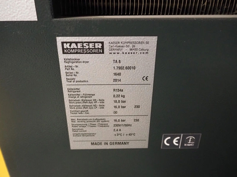 - Kaeser Kompressoren air dryer, type: TA 8, serial number: 1640, year of construction: 2014, 230 V, 1 Ph, 50 Hz, refrigerant: R134a / 0.22 kg, dimensions: 600 mm x 600 mm x 800 mm,