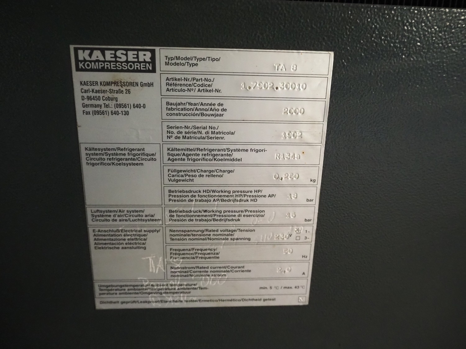 - Kaeser Kompressoren air dryer, type: TA 8, serial number: 1.7902.30010, year of construction: 2000, refrigerant: R 134 A, quantity of refrigerant: 0.260 kg, 230 V, 1 Ph, 50 Hz, Sicc pressure vessel, volume: 280 liter, dimensions: 1200 mm x 500 mm x 1800 mm,