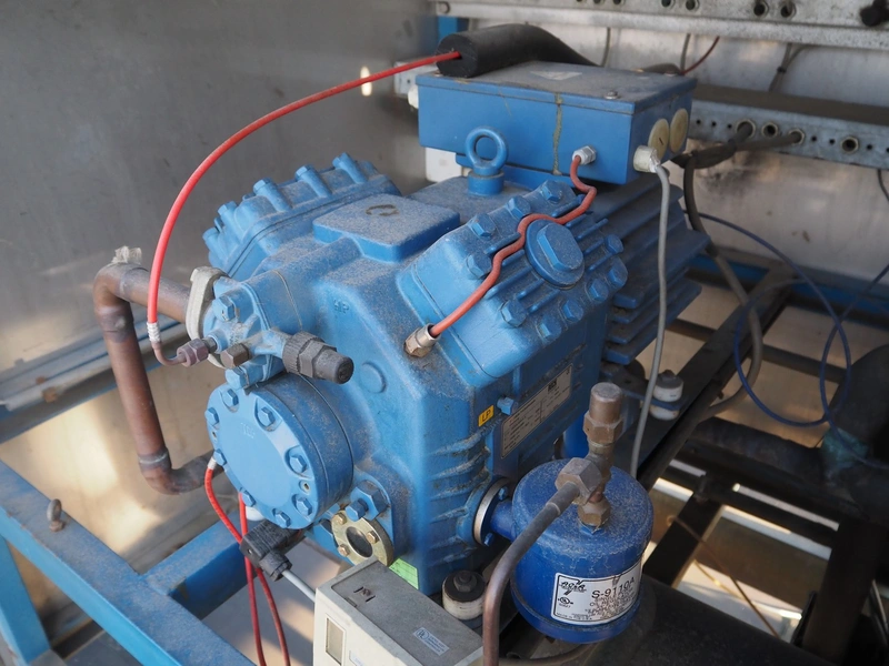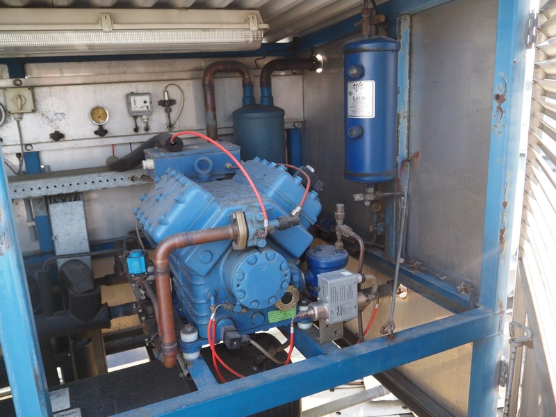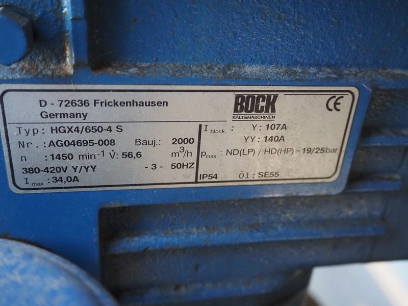 • Bock compressor rack with 2 cooling compressor, type: (1x) HGX4/650-4 S, number: AG04695-008, year of construction: 2000, capacity: 56.6 m³ per hour and (1x) HGX5/830-4 S, number: AG03608-006, year of construction: 2000, capacity: 72.2 m³ per hour, refrigerant: R404A, total dimensions compressor rack: 2350 mm x 1400 mm x 1500 mm,