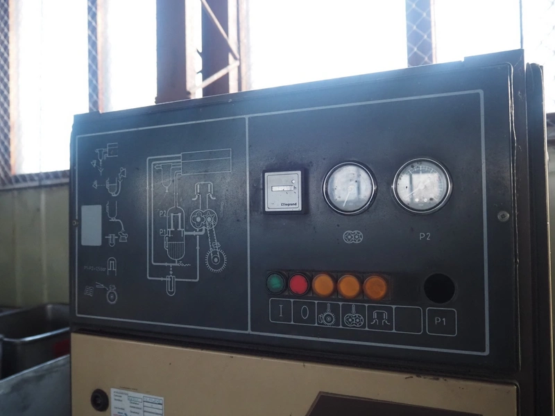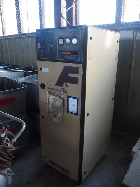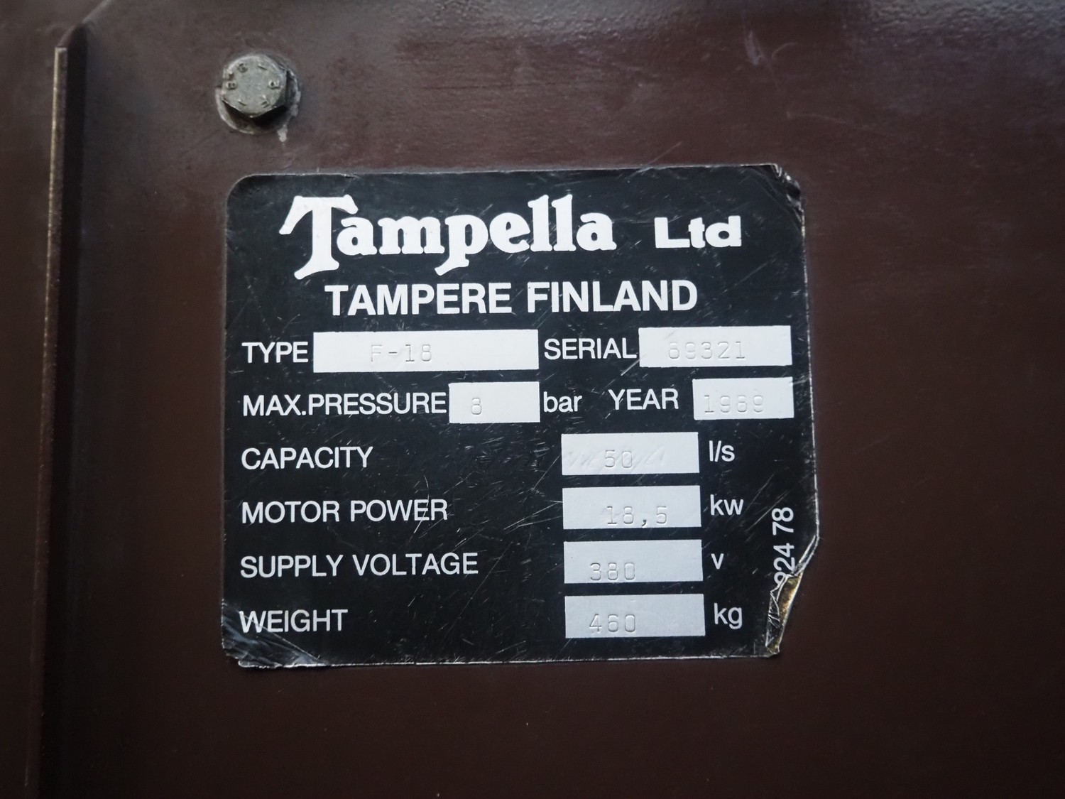 Tampella Ltd air compressor, type: F-18, serial number: 89321, year of construction: 1989, 380 V, 18.5 kW, capacity: 50 l/s, max pressure: 8 bar, weight: 460 kg, dimensions: 680 mm x 830 mm x 1850 mm.