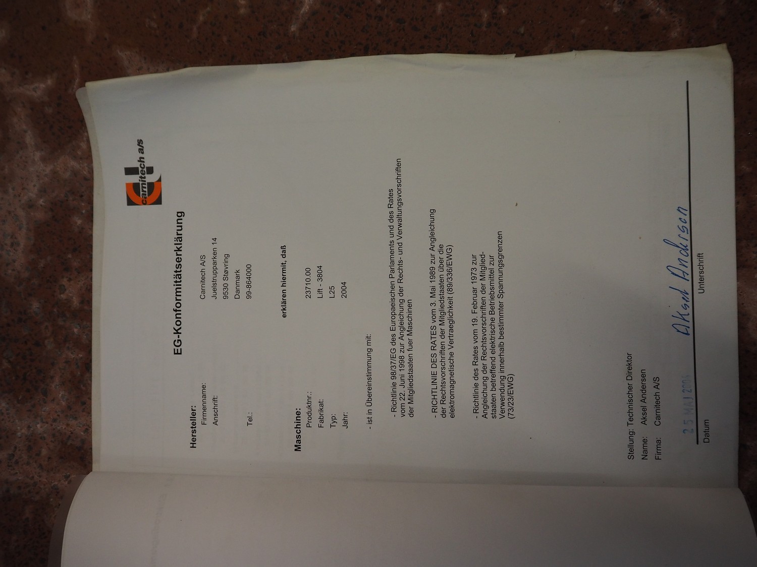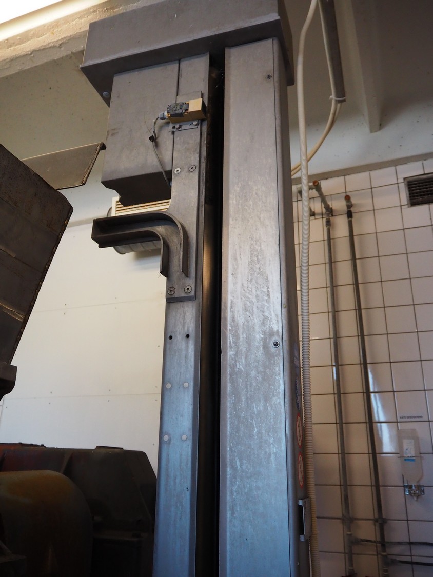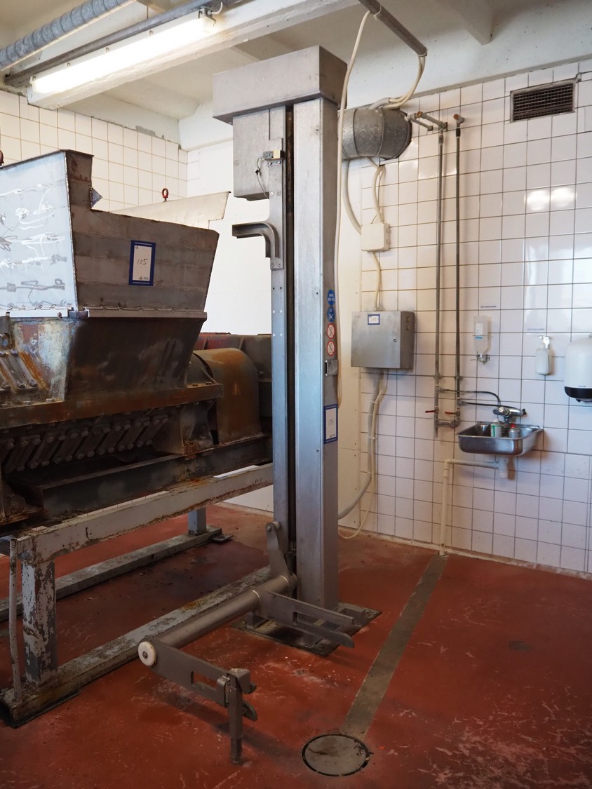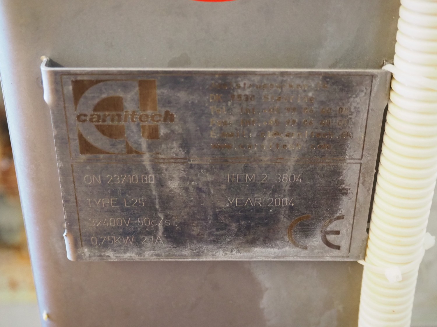 Carnitech lifter for meat bins, type: L25, machine number: 3804, year of construction: 2004, 400 V, 3 Ph, 50 Hz, 2.1 A, 0.75 kW, capacity: 250 kg, lifting height: 2080 mm, total dimensions: 1550 mm x 1000 mm x 2930 mm.