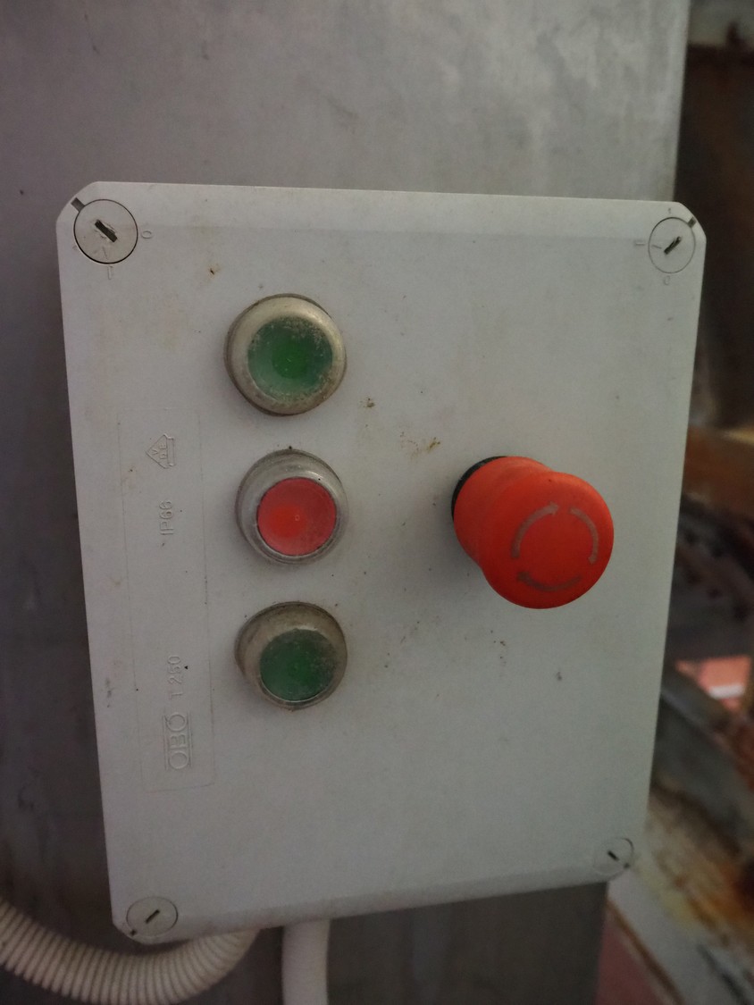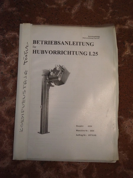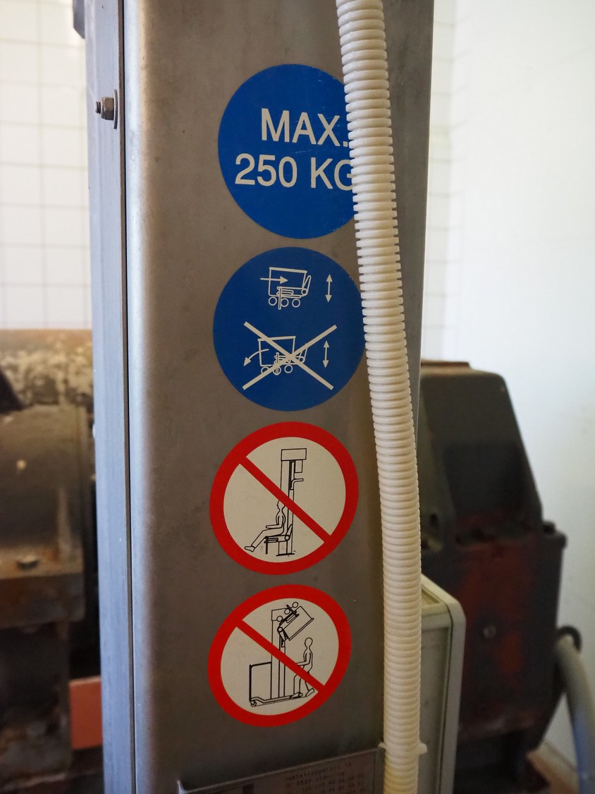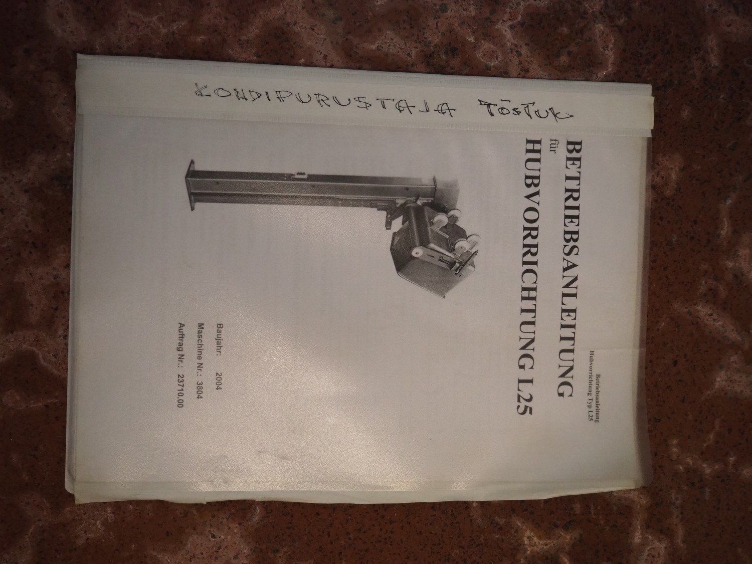 Carnitech lifter for meat bins, type: L25, machine number: 3804, year of construction: 2004, 400 V, 3 Ph, 50 Hz, 2.1 A, 0.75 kW, capacity: 250 kg, lifting height: 2080 mm, total dimensions: 1550 mm x 1000 mm x 2930 mm.
