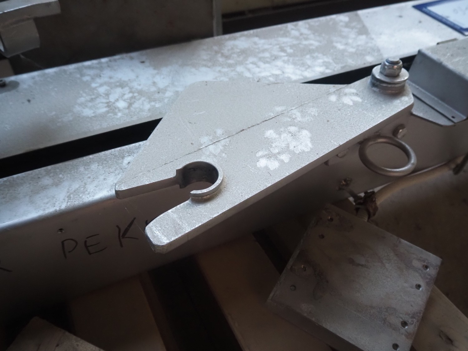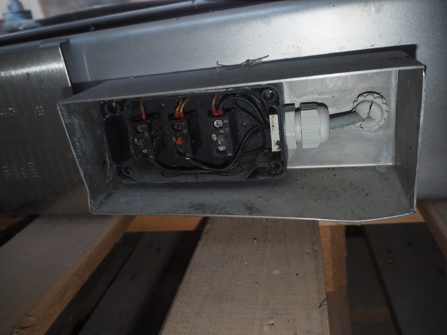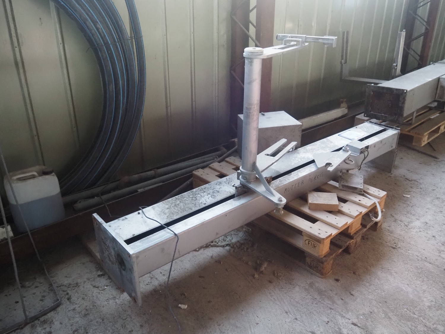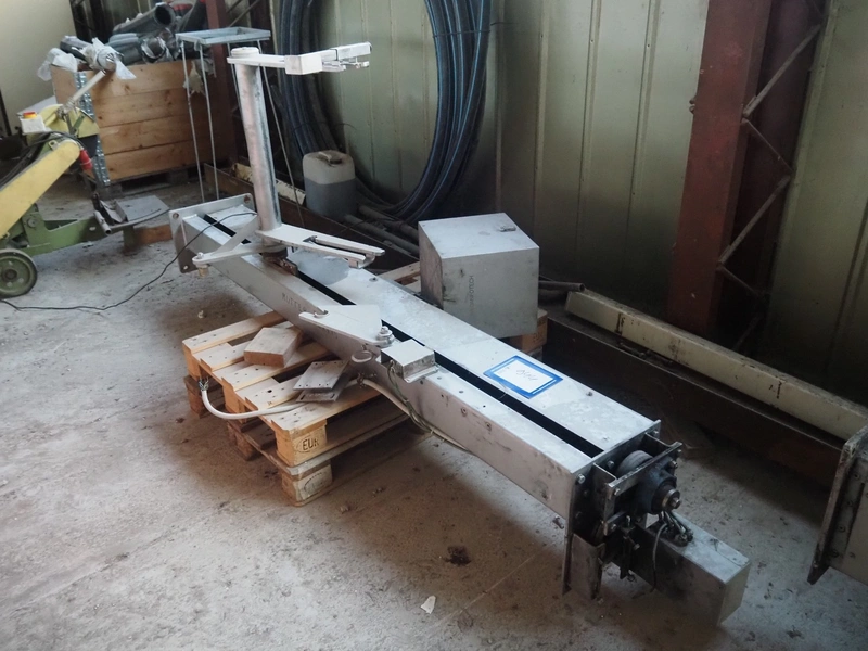 SFK Danfotech s/s lifter for meat bins, type: SH 300, serial number: 1711, year of construction: 1999, 3x400 V, 50 Hz, 1.5 kW, 3.6 A, maximum capacity: 300 kg, lifting height: 1500 mm, total dimensions: 1000 mm x 1000 mm x 3000 mm. Incomplete, technical condition unknown.