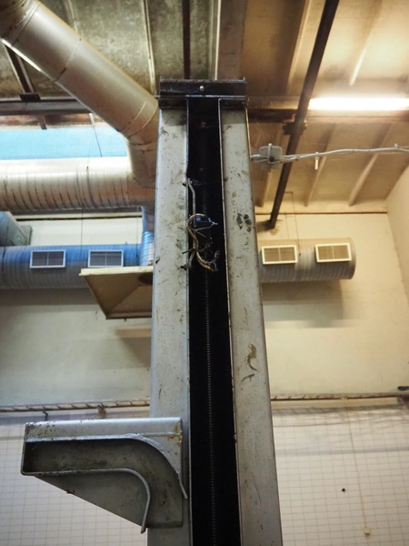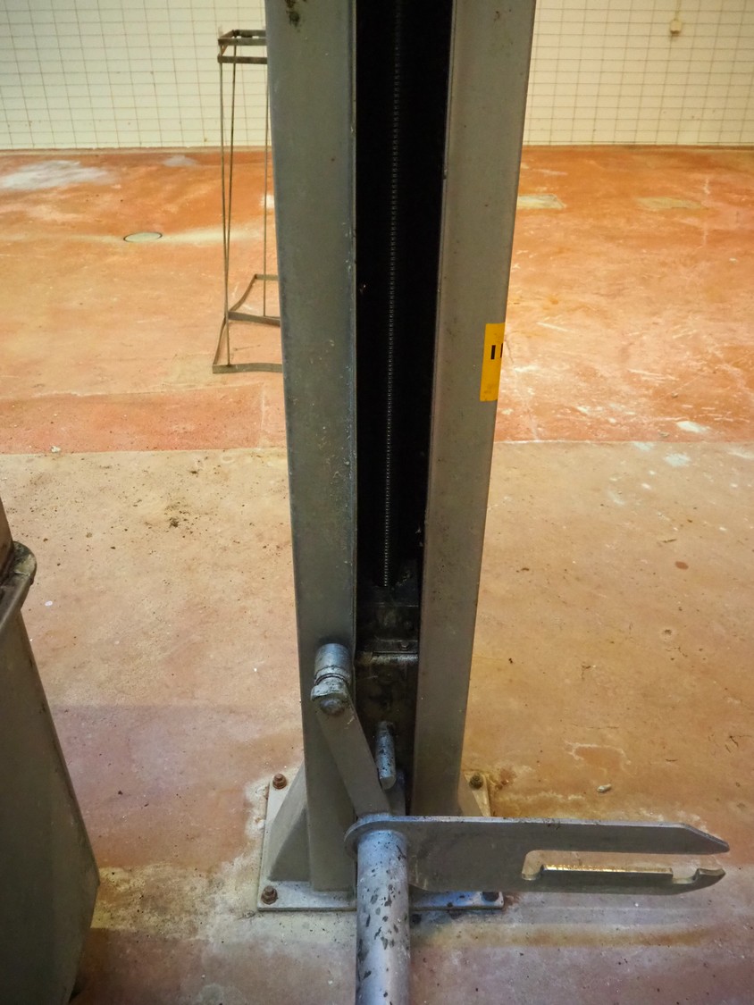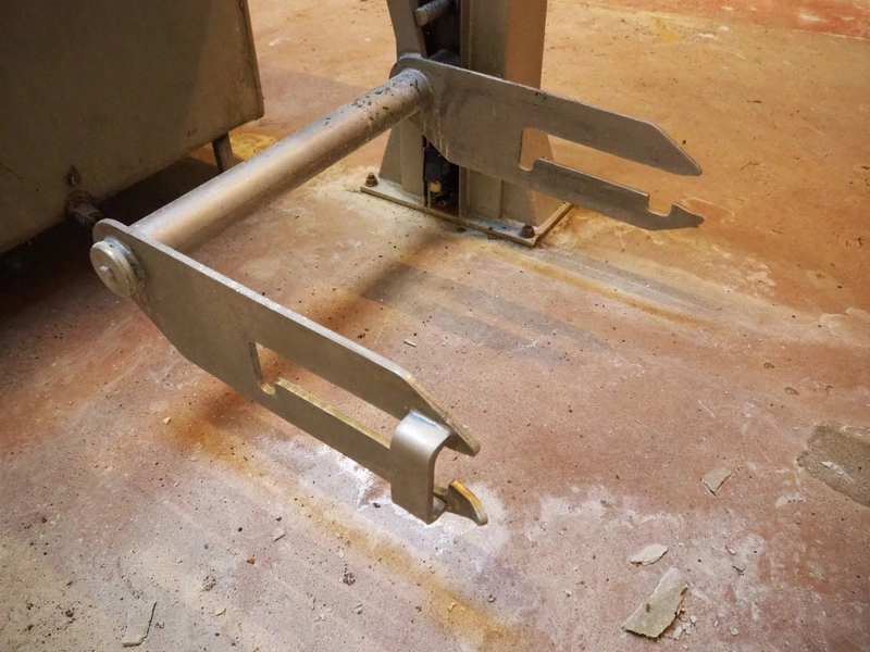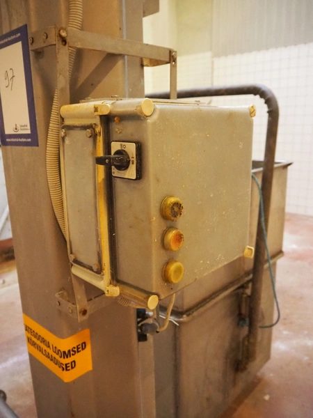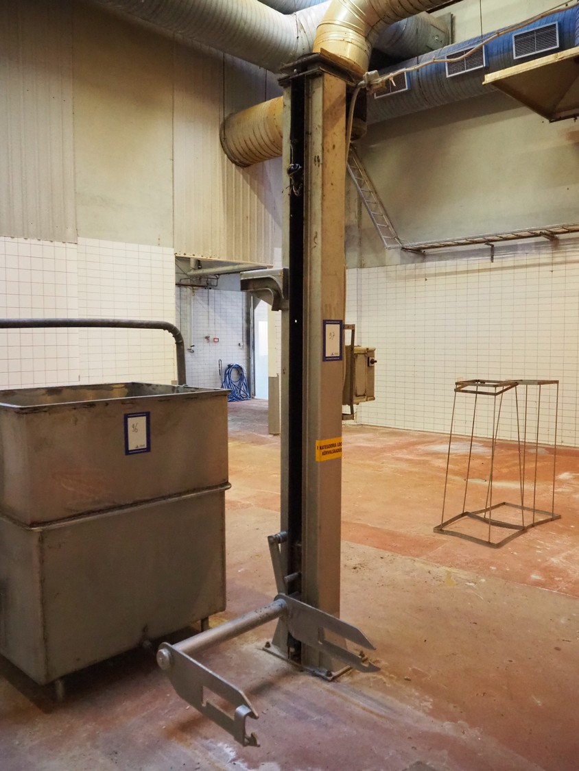 S/s lifter for meat bins, lifting height: 1860 mm, total dimensions: 1300 mm x 1050 mm x 2940 mm. Technical condition unknown.