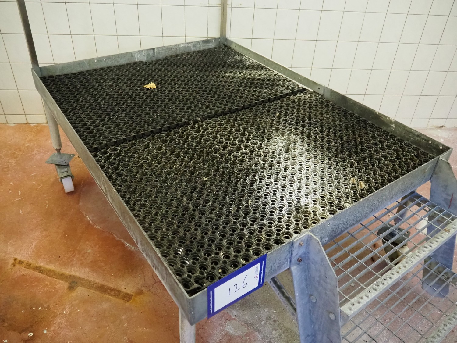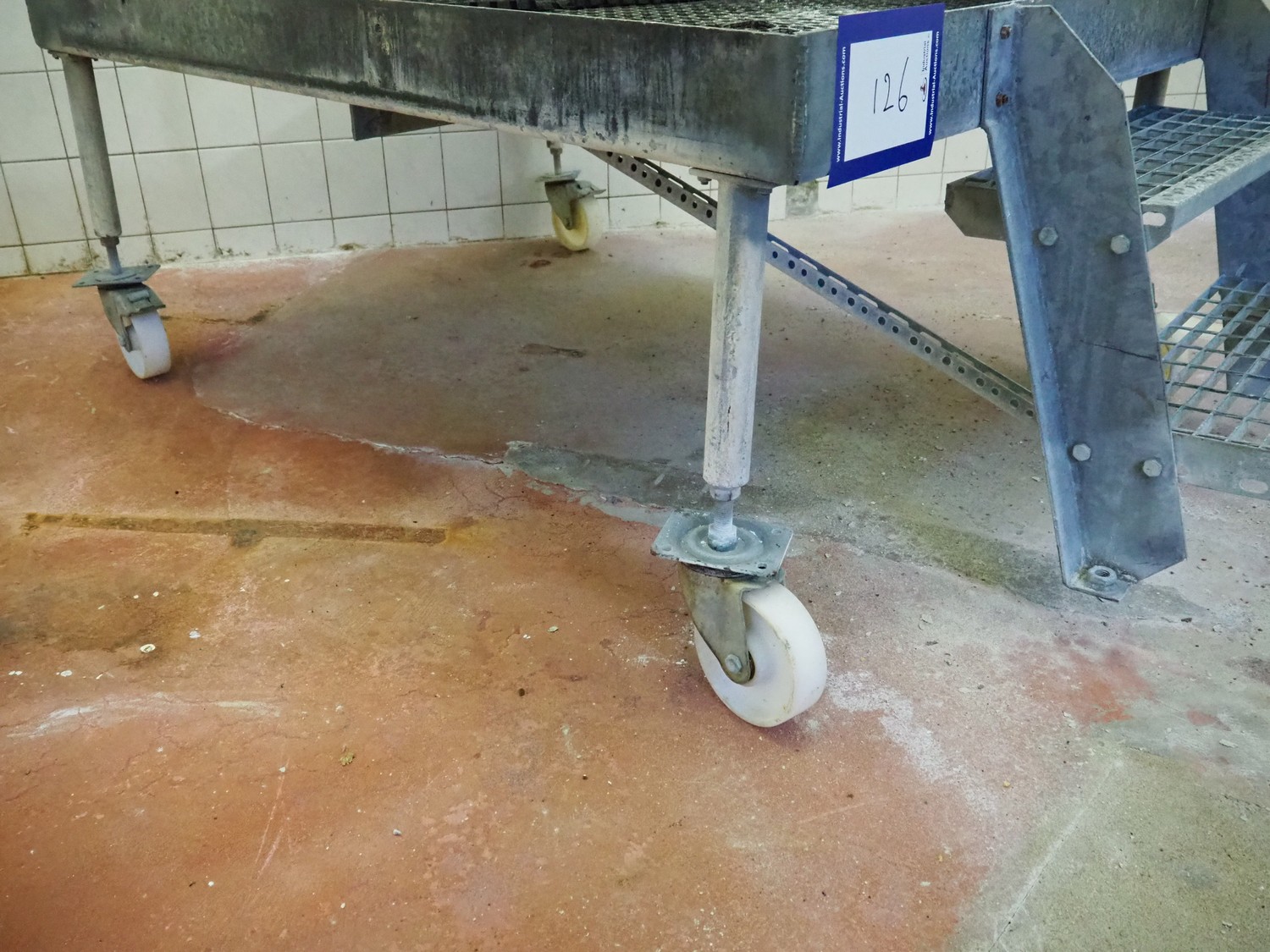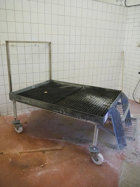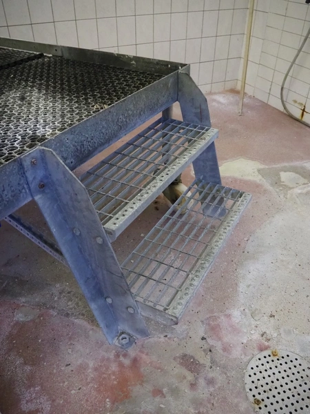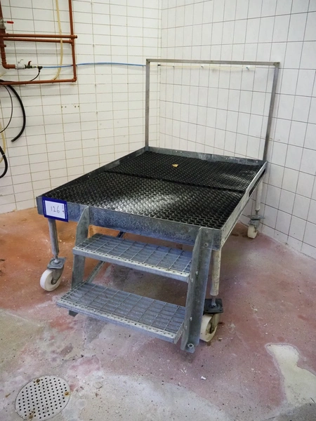 Mobile galvanized platform, 2 steps, working height: 620 mm, total dimensions: 1970 mm x 1220 mm x 1550 mm.