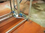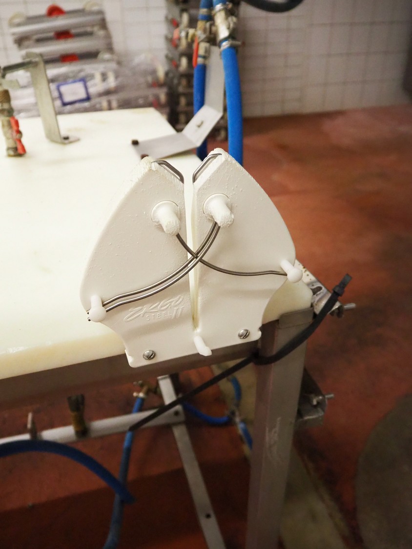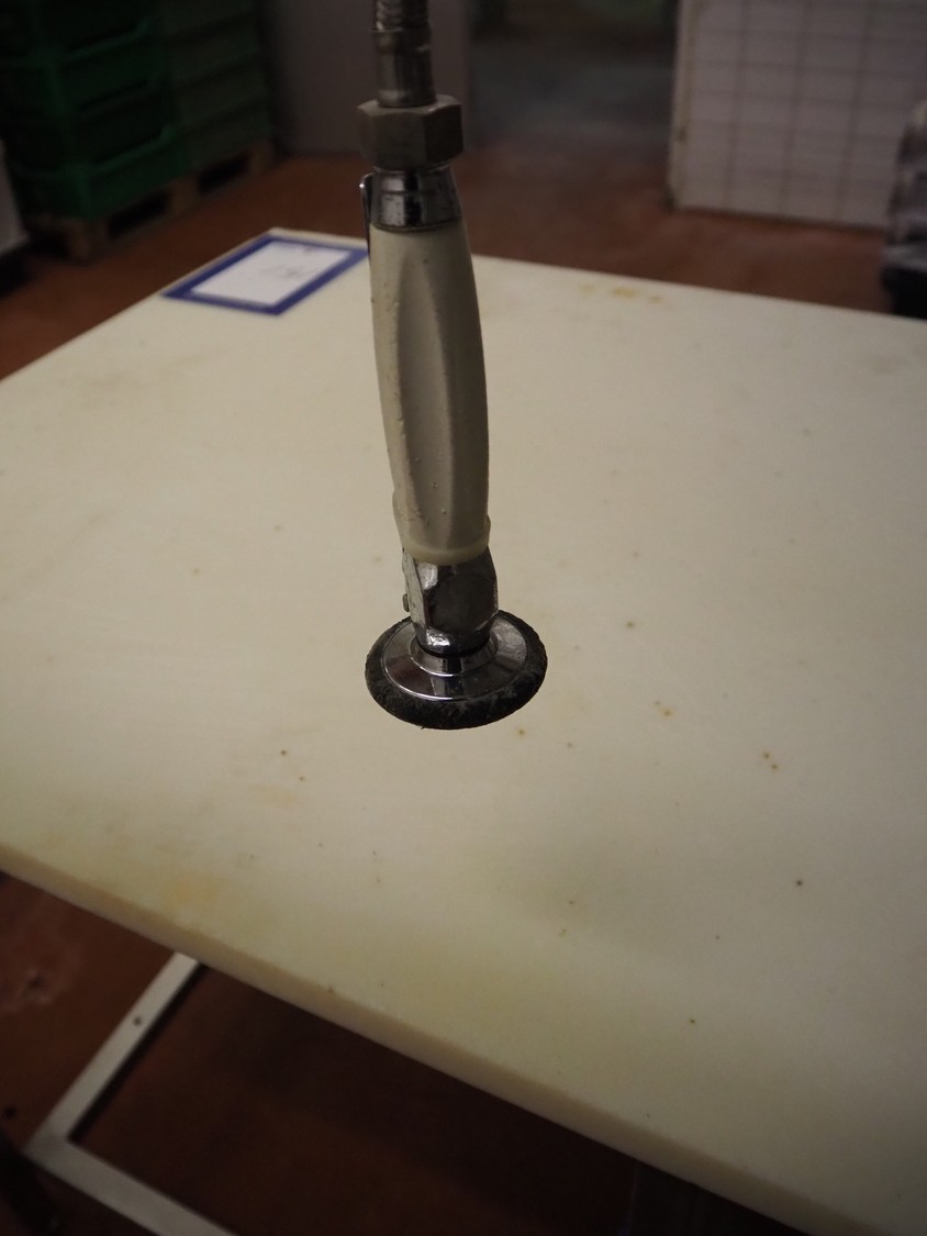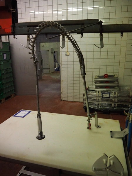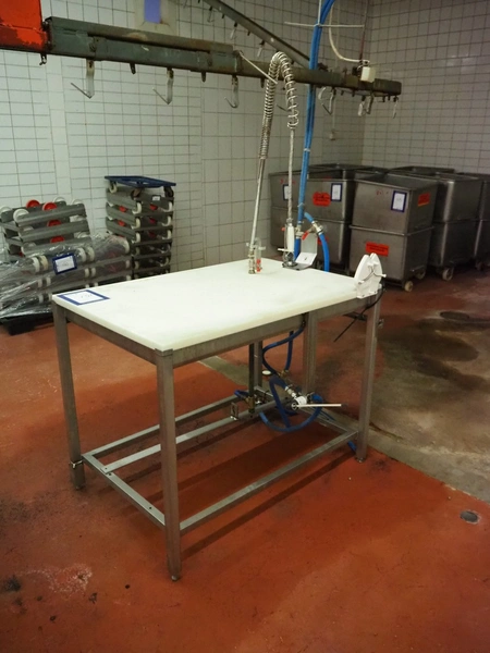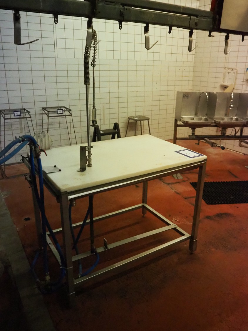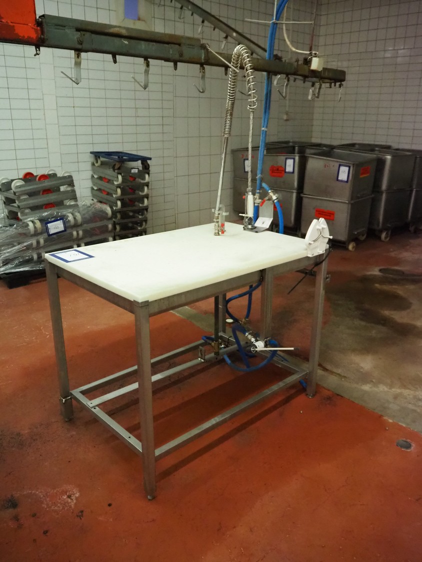 S/s table with plastic top and faucet, dimensions top: 1200 mm x 800 mm, total dimensions: 1220 mm x 820 mm x 1830 mm.