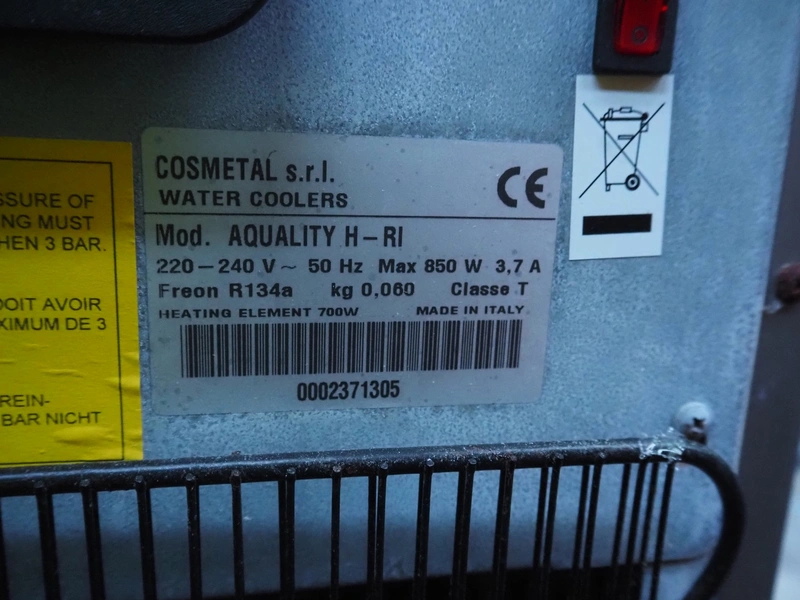 Cosmetal s.r.l. water dispenser/cooler, model: AQUALITY H-RI, serial number: 0002371305, 220-240 V, 50 Hz, 3.7 A, 850 W, refrigerant: R134a/0.060 kg, dimensions: 350 mm x 340 mm x 1130 mm.