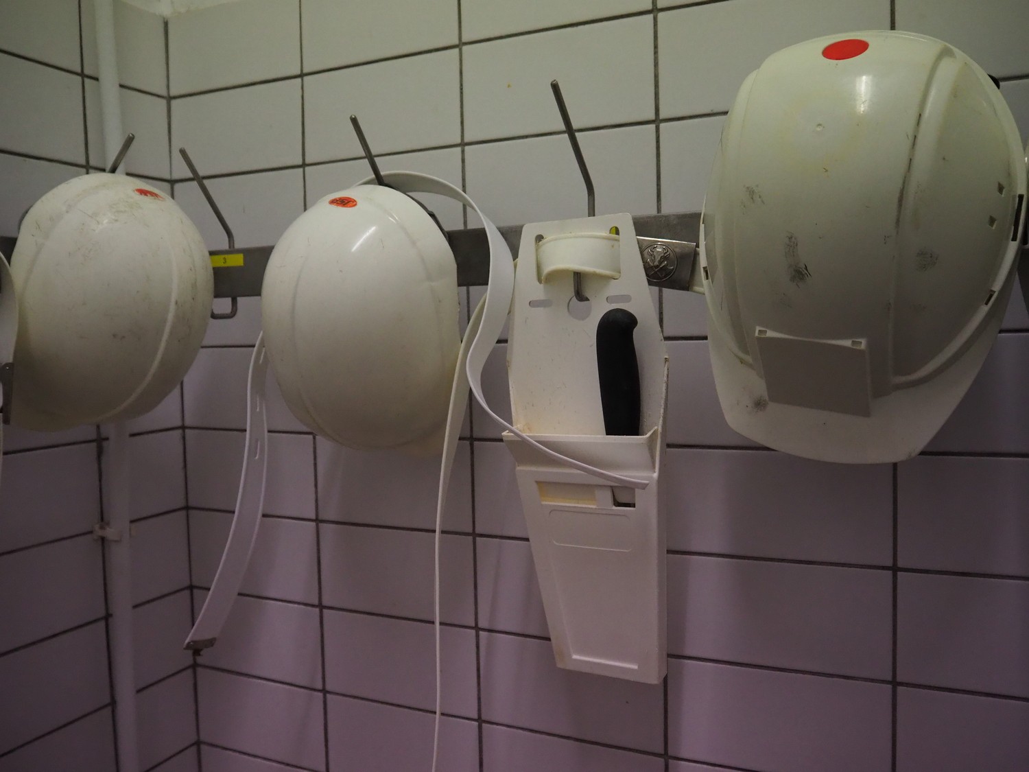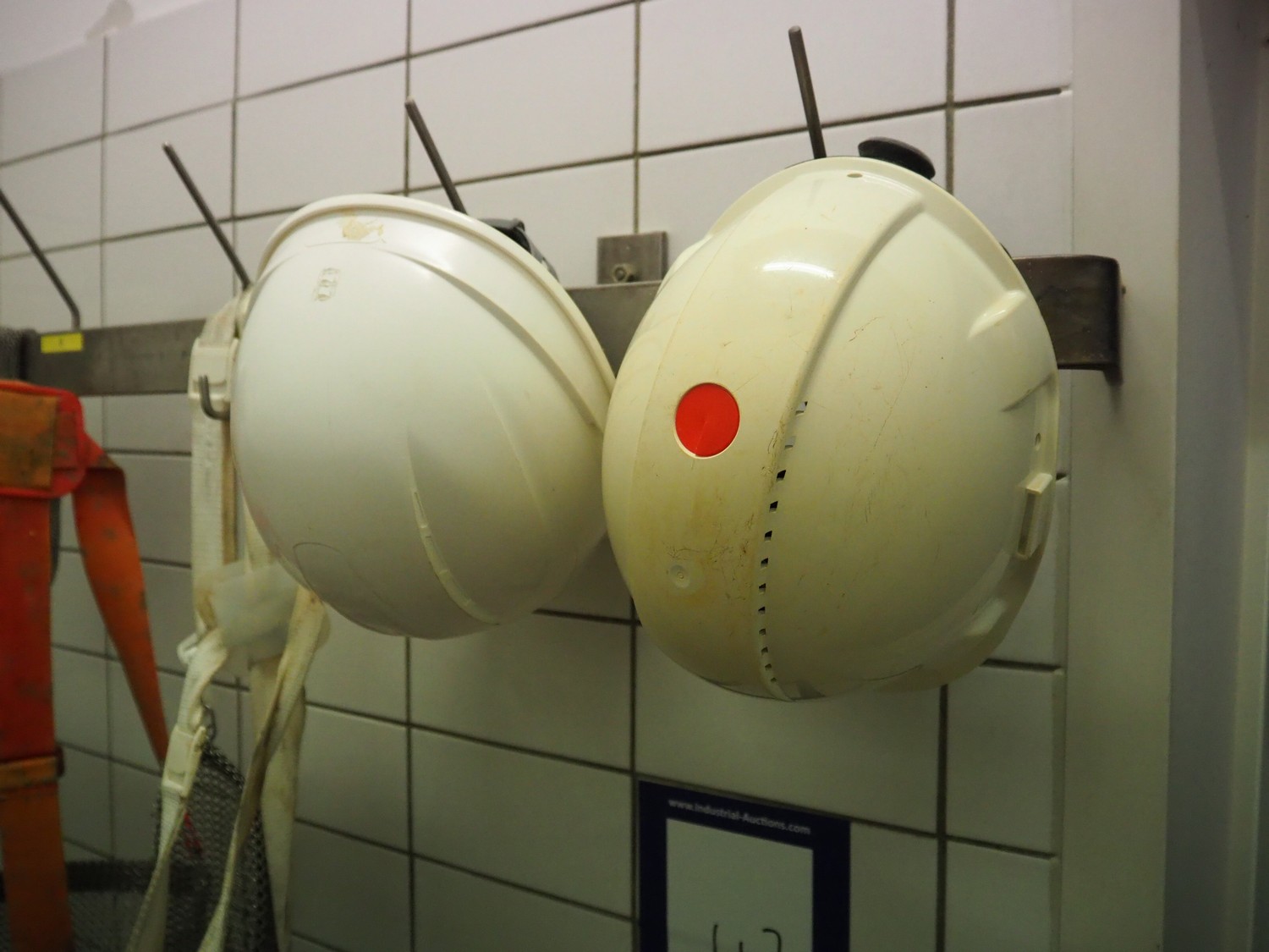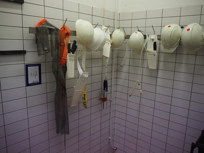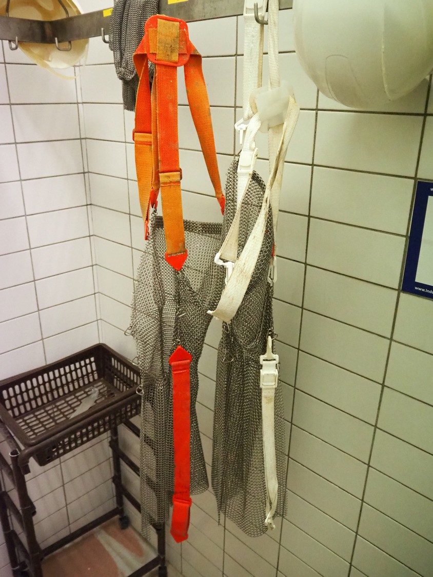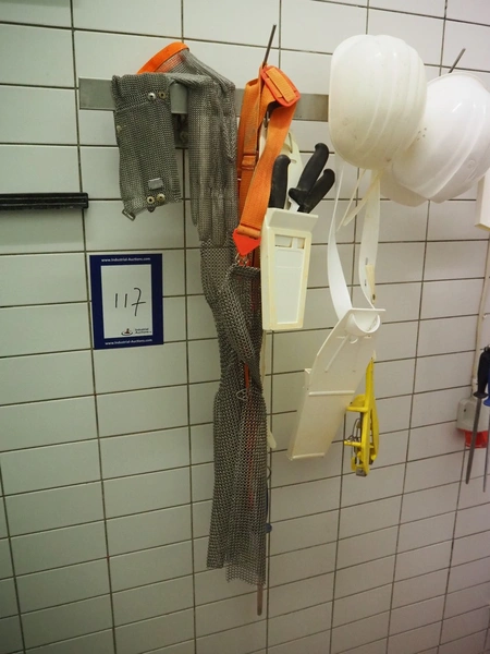 10 plastic safety helmets, 3 chainmail apron, 1 chainmail glove set and 4 plastic knife holders.