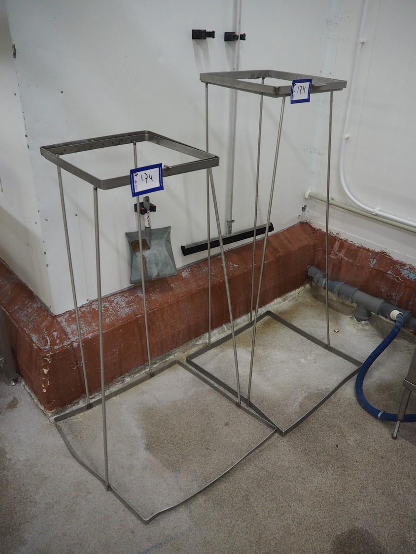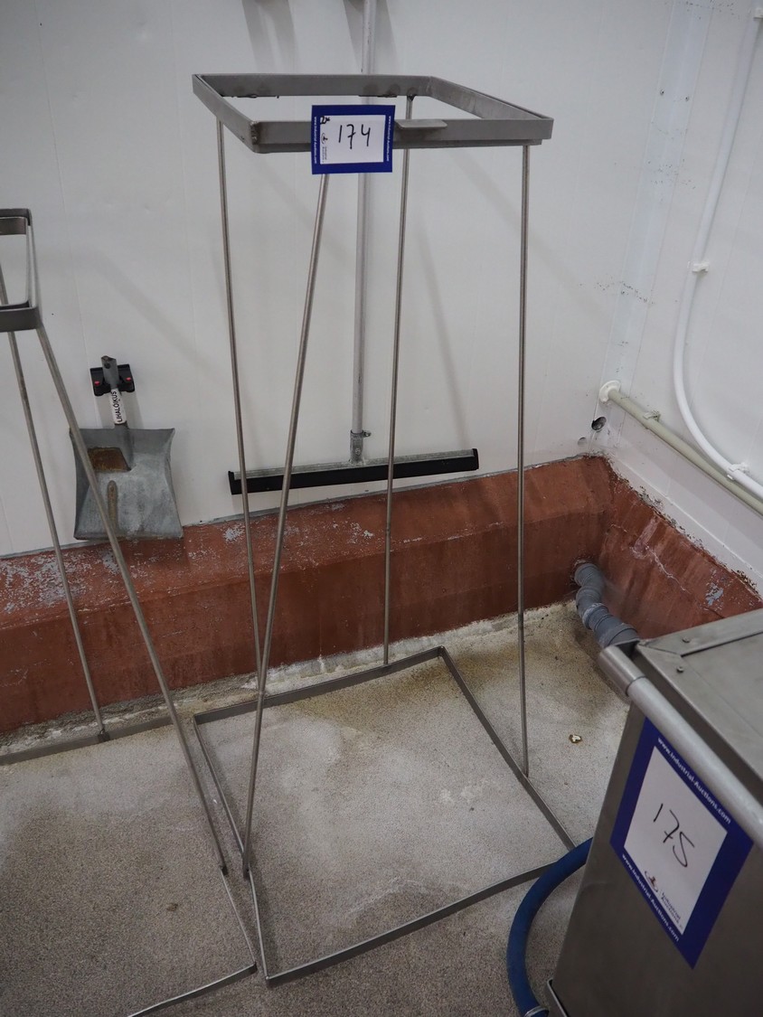 2 s/s waste bag holders, dimensions: 600 mm x 600 mm x 1080 mm and 600 mm x 600 mm x 1250 mm.