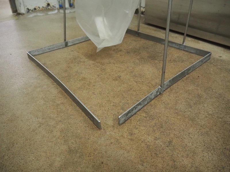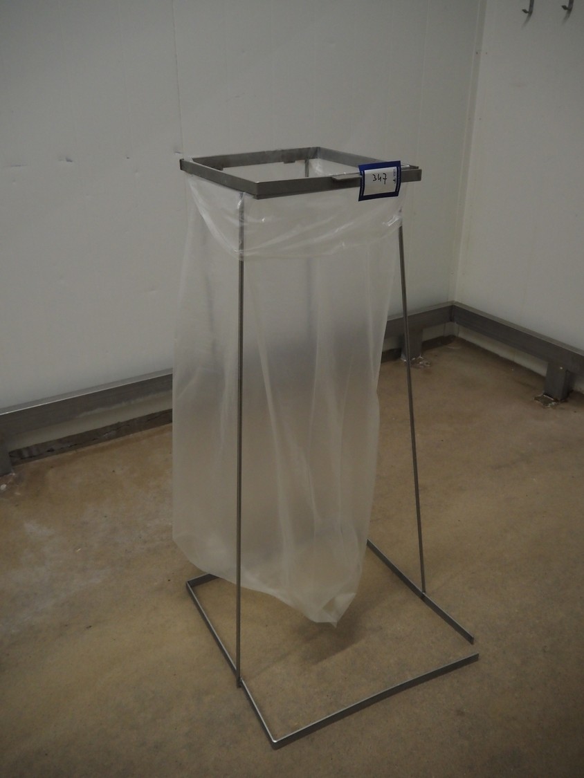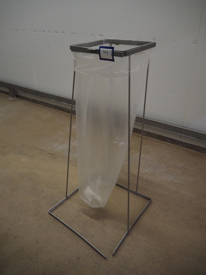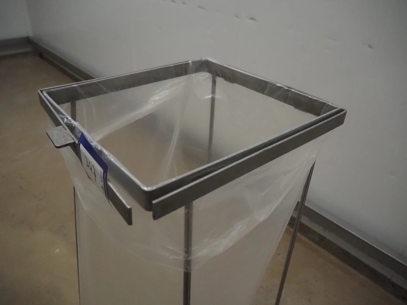 S/s waste bag holder, dimensions: 600 mm x 600 mm x 1250 mm.
