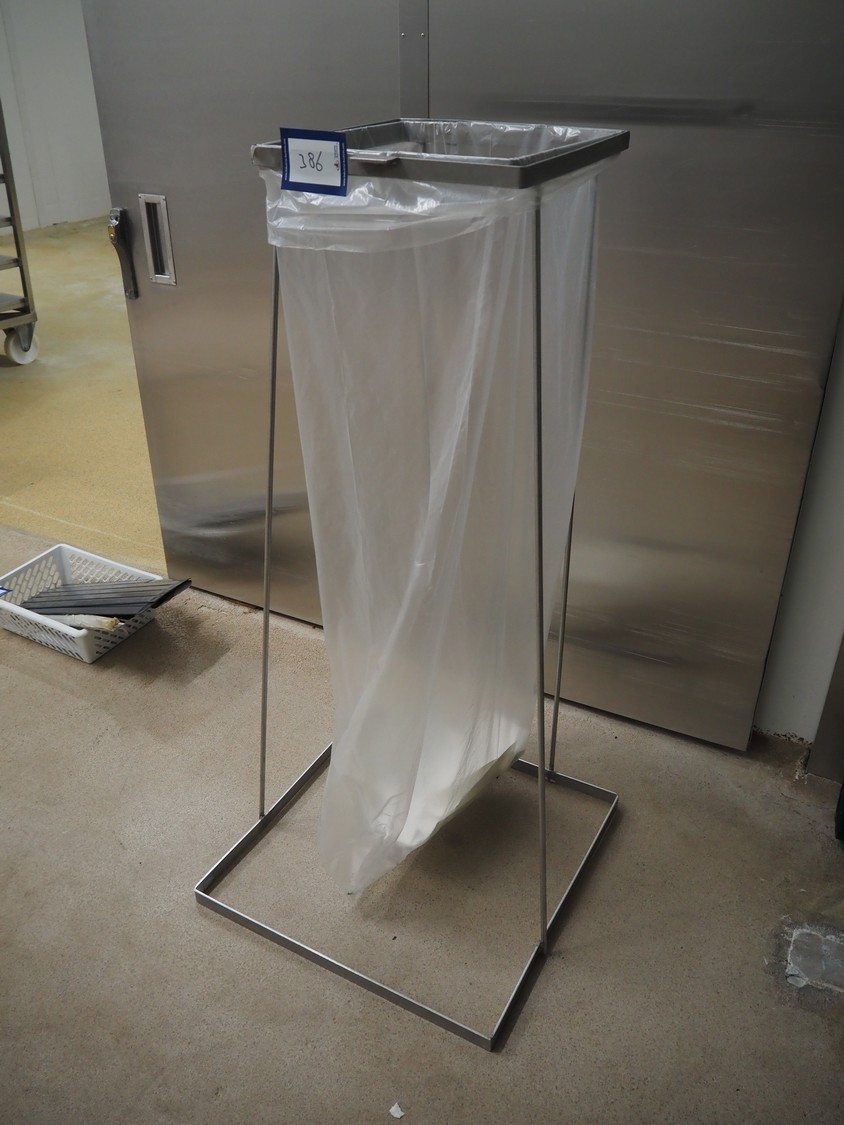 S/s waste bag holder, dimensions: 600 mm x 600 mm x 1250 mm.