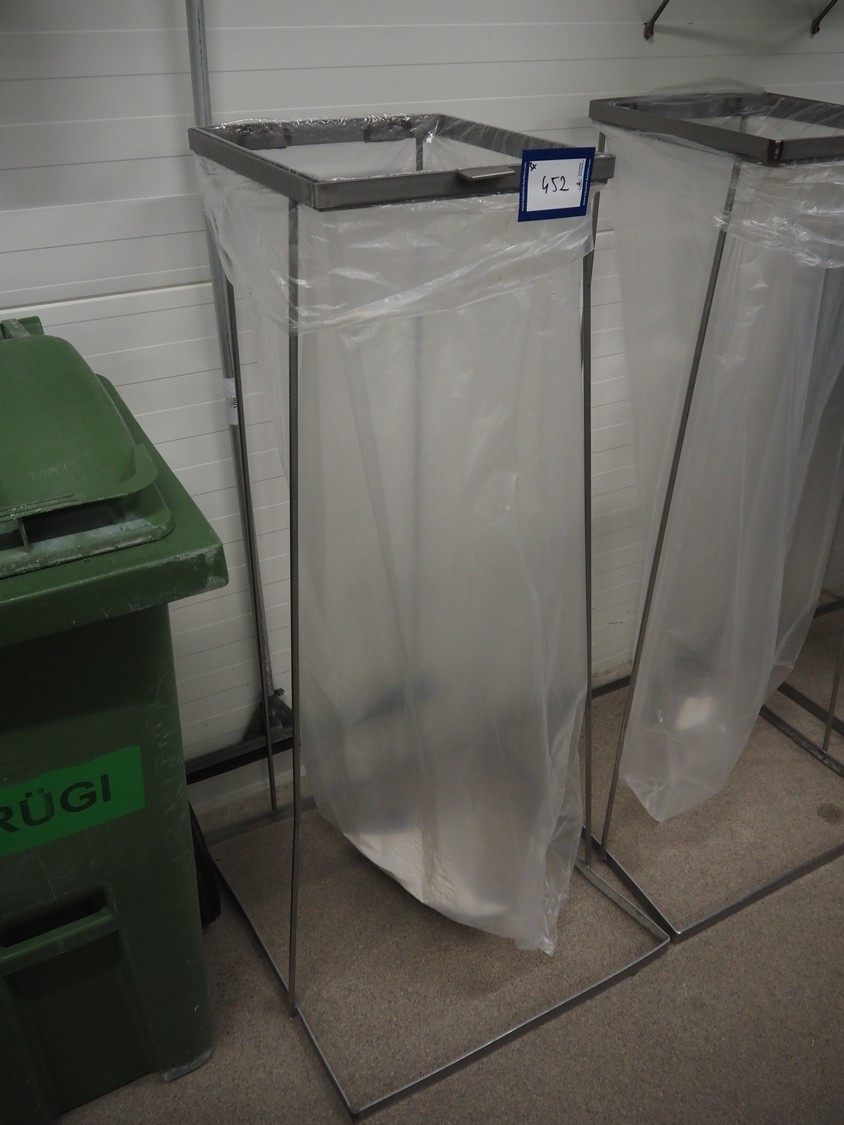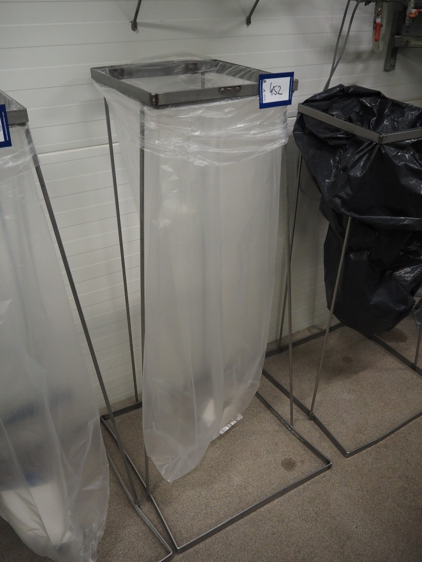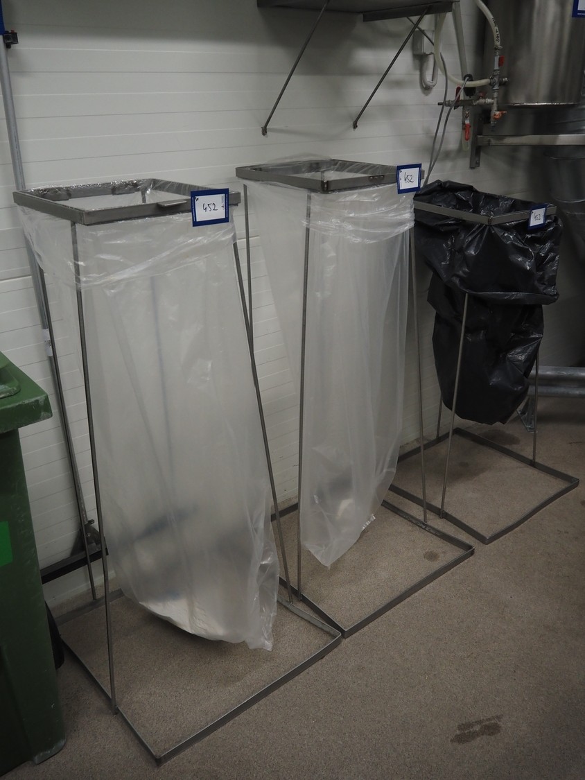 3 s/s waste bag holders, dimensions: (2x) 600 mm x 600 mm x 1250 mm and 600 mm x 600 mm x 1100 mm.