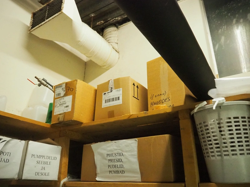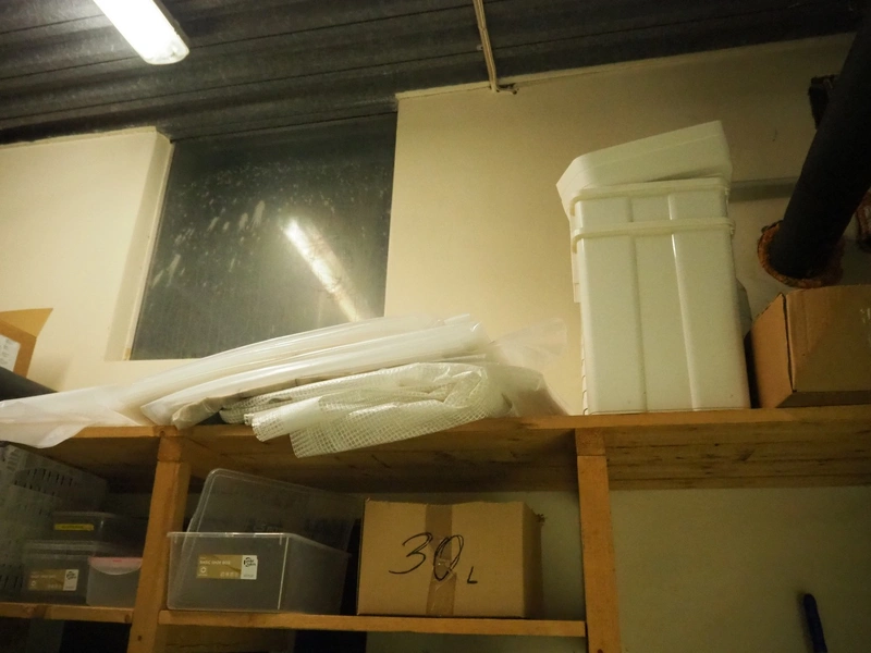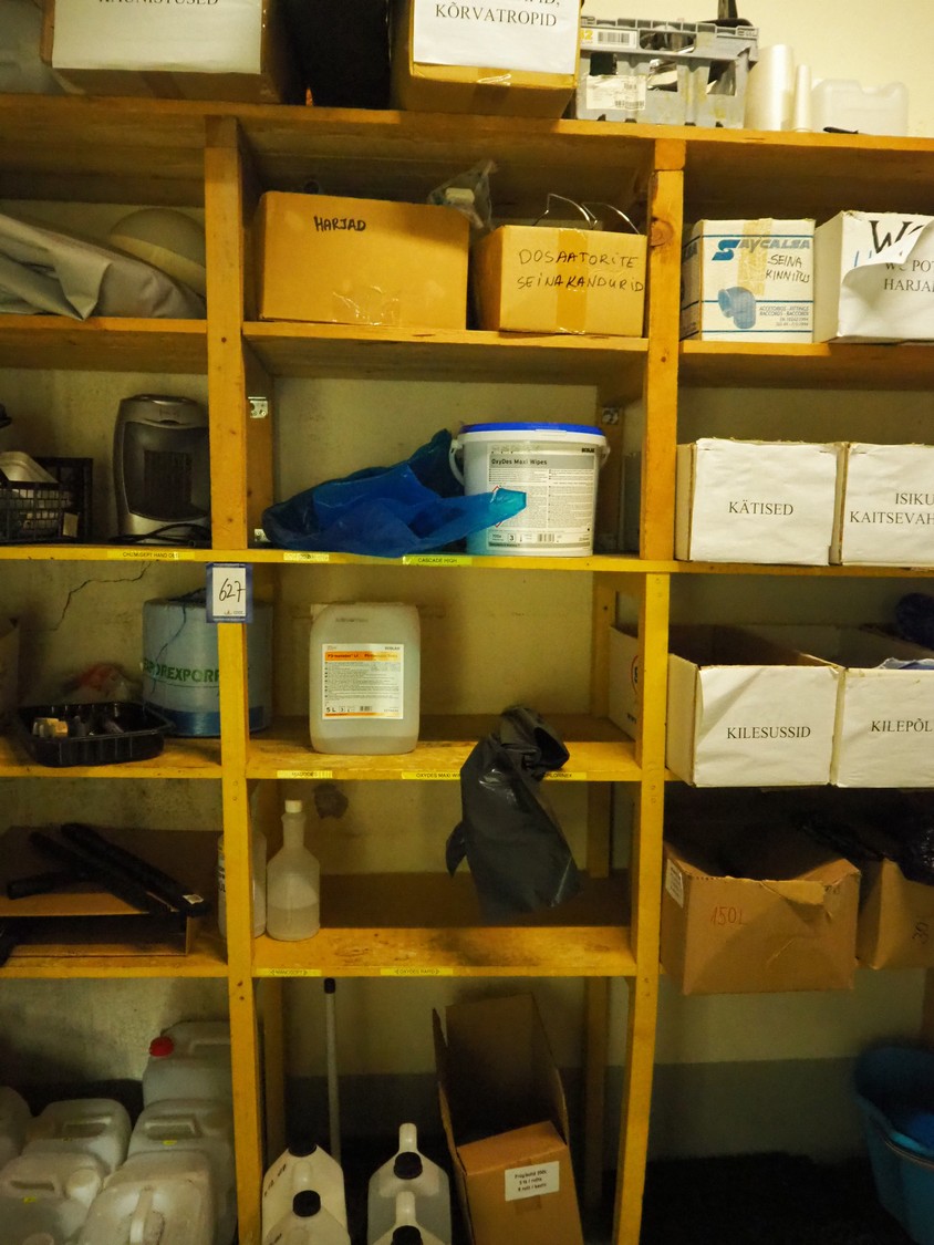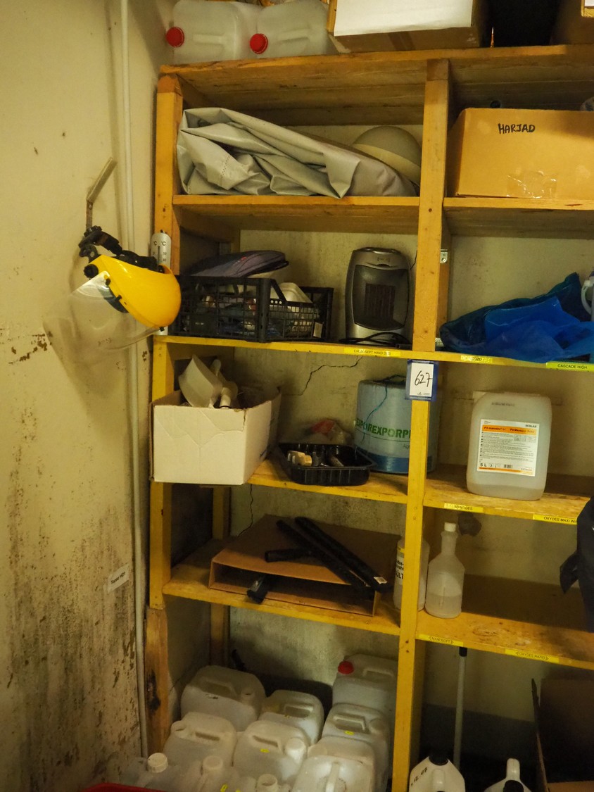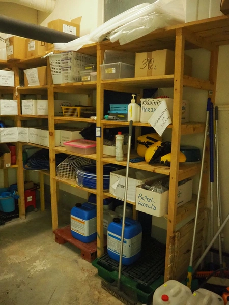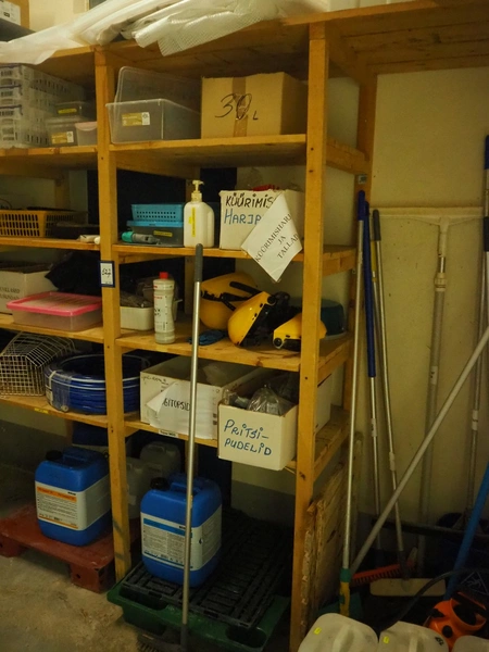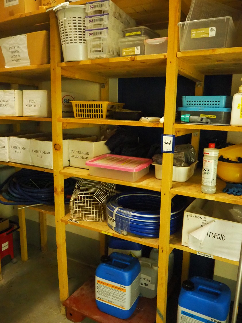 2 wooden racks with hygiene equipment, dimensions racks: 2500 mm x 650 mm x 2200 mm and 3200 mm x 650 mm x 2200 mm.