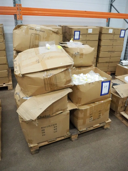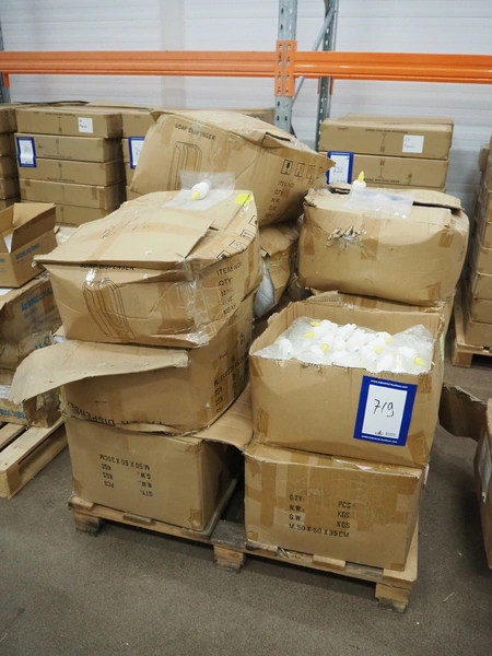 Pallet with large amount of plastic pouches and pumps, dimensions pouches: 200 mm x 235 mm.