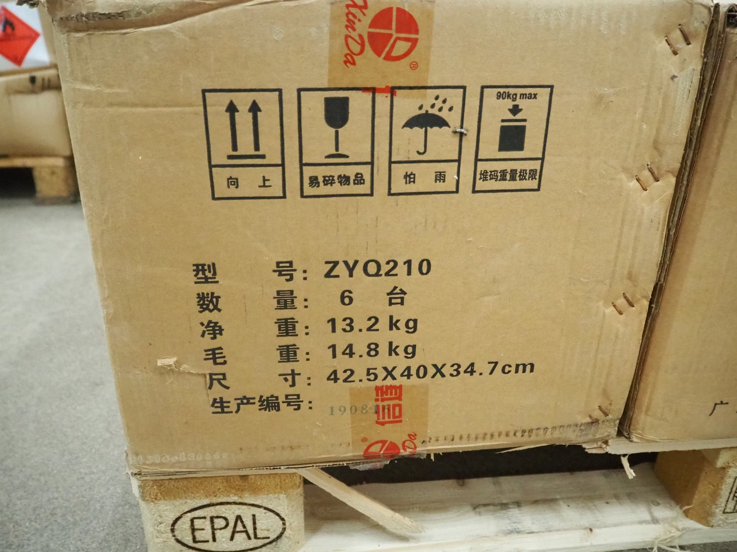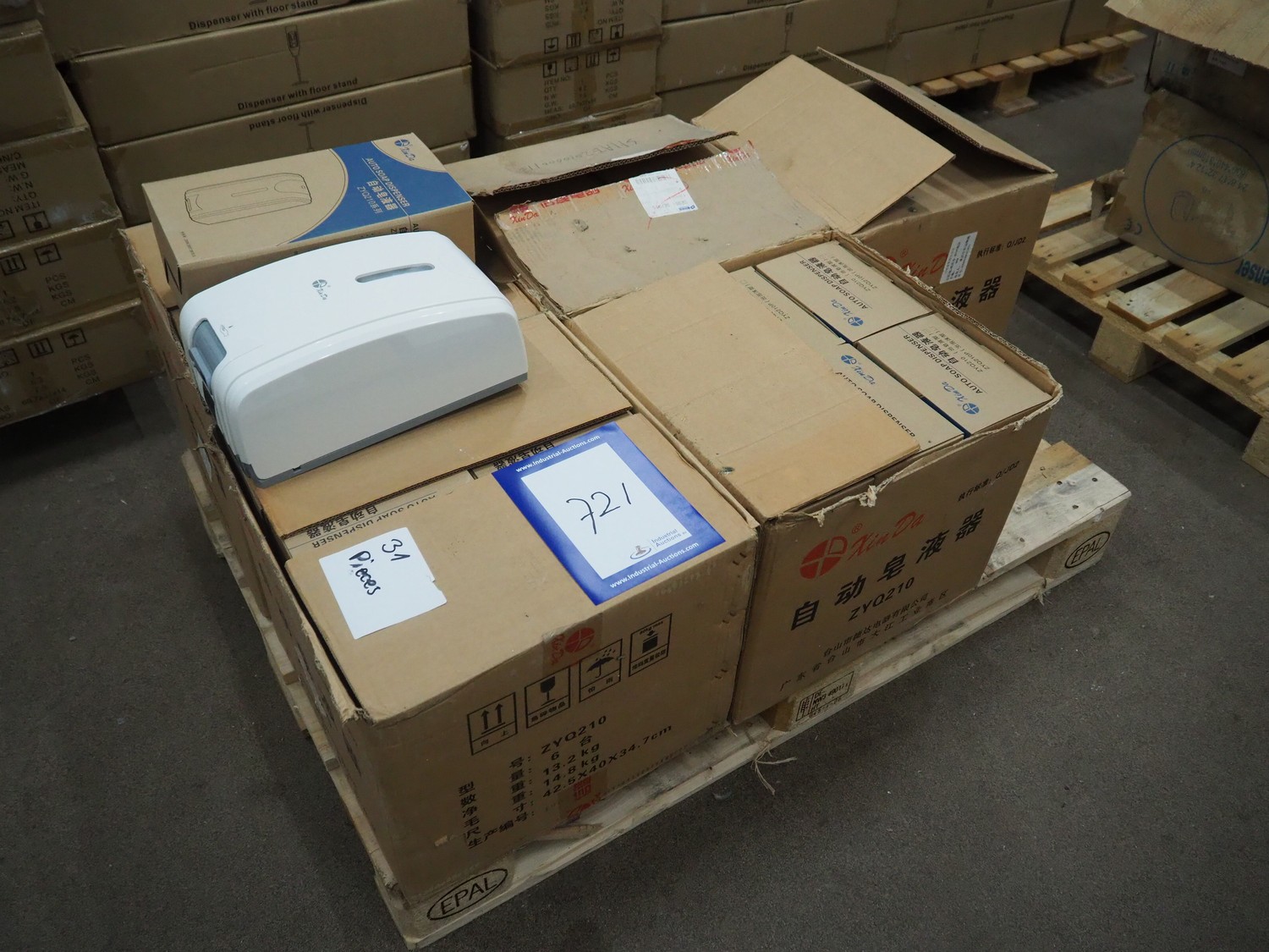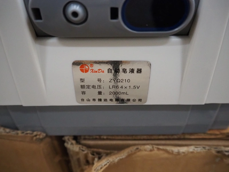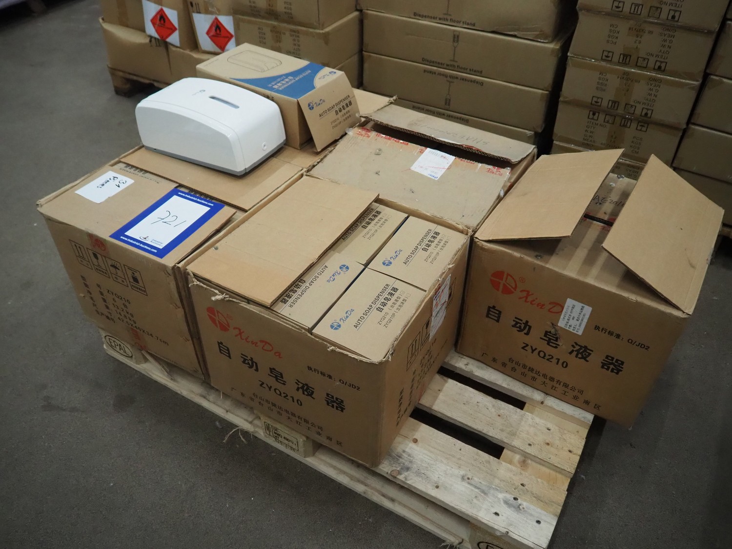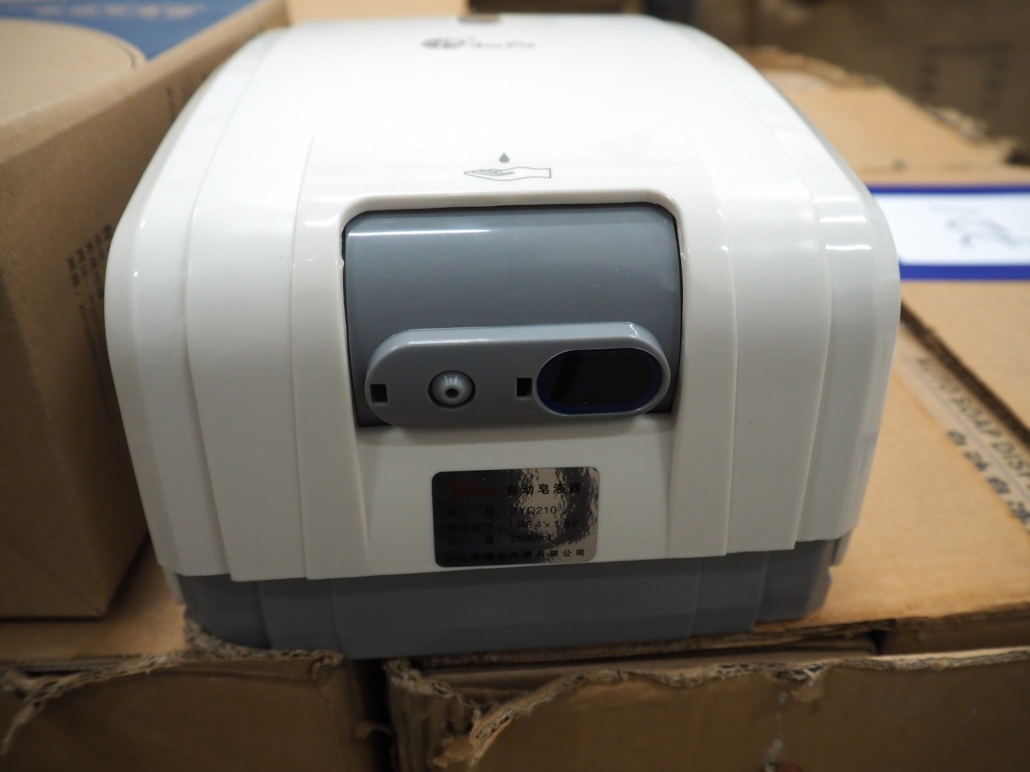 Pallet with 5 boxes of Xin Da automatic soap dispensers, 6 dispensers each box, dimensions each dispenser: 185 mm x 135 mm x 305 mm.
