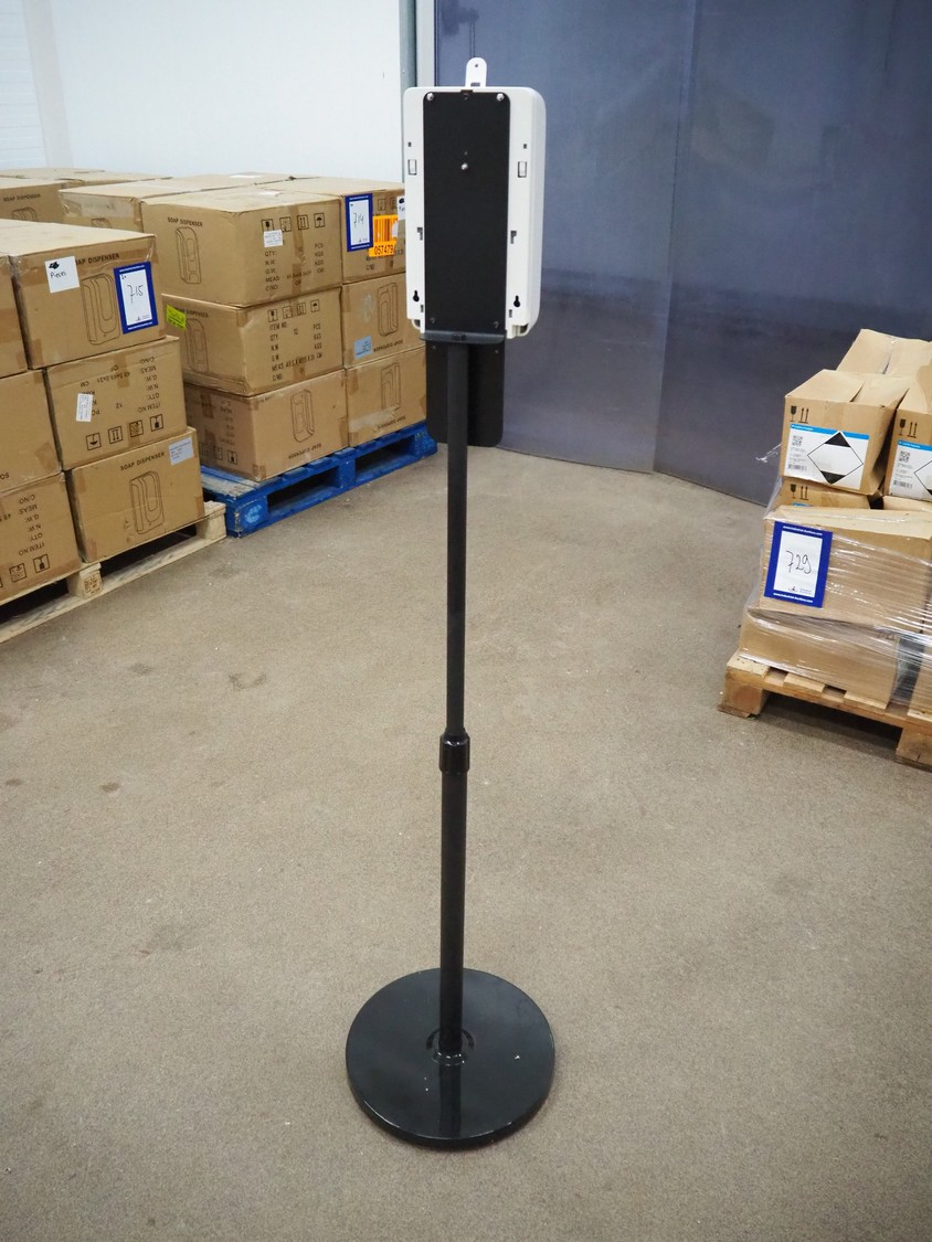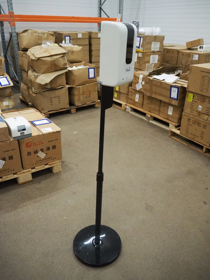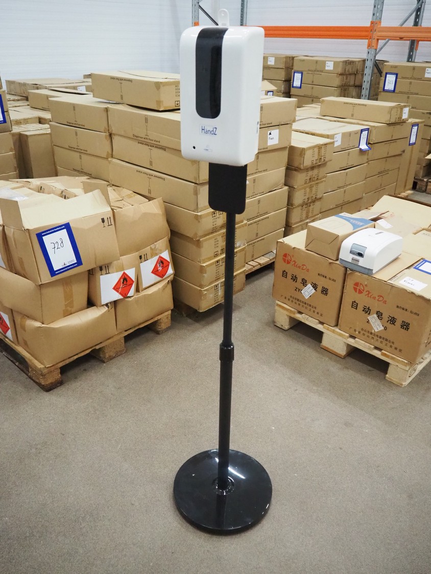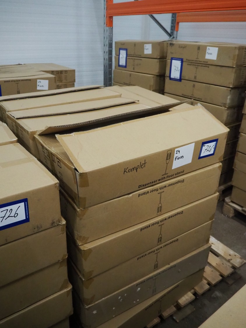 3 pallets with 96 boxes of HändZ automatic soap dispensers with floor stand, dimensions each dispenser: 355 mm x 355 mm x 1500 mm.