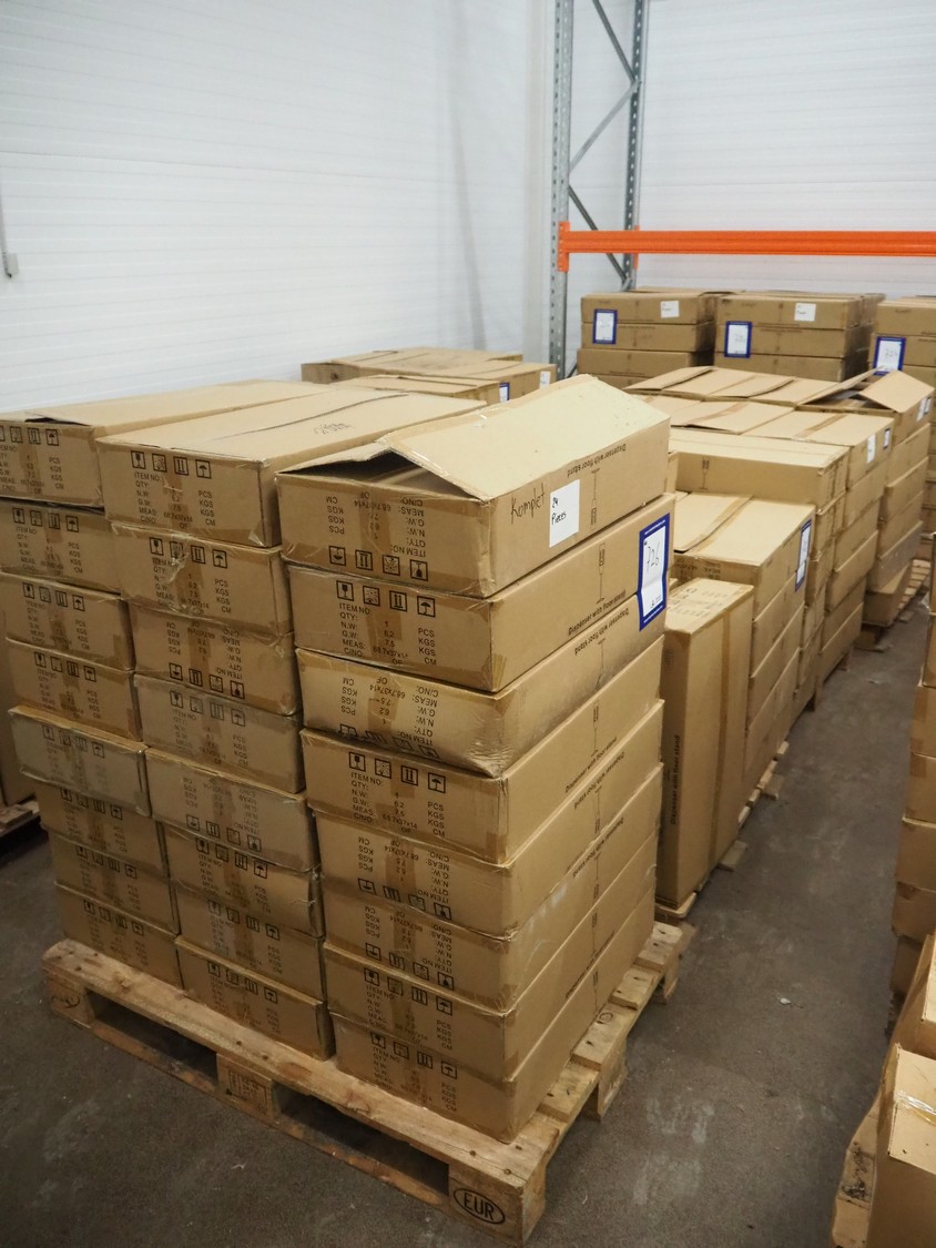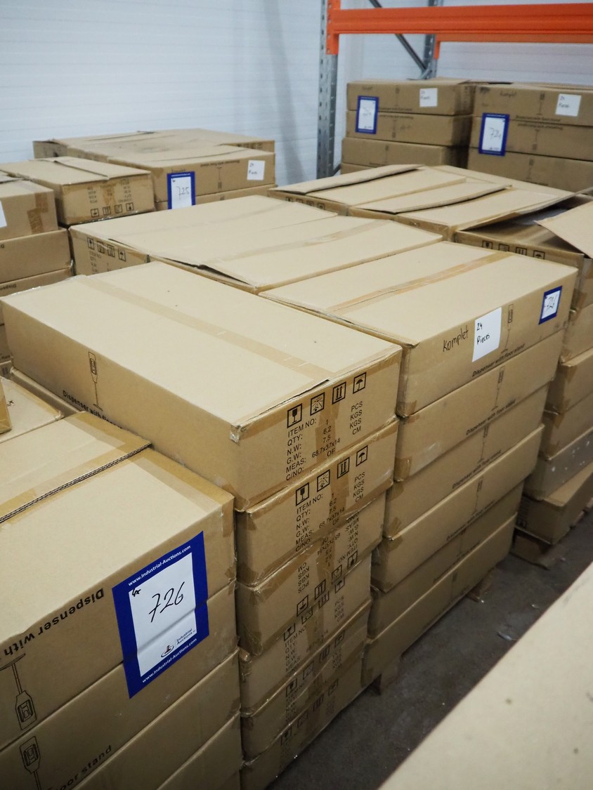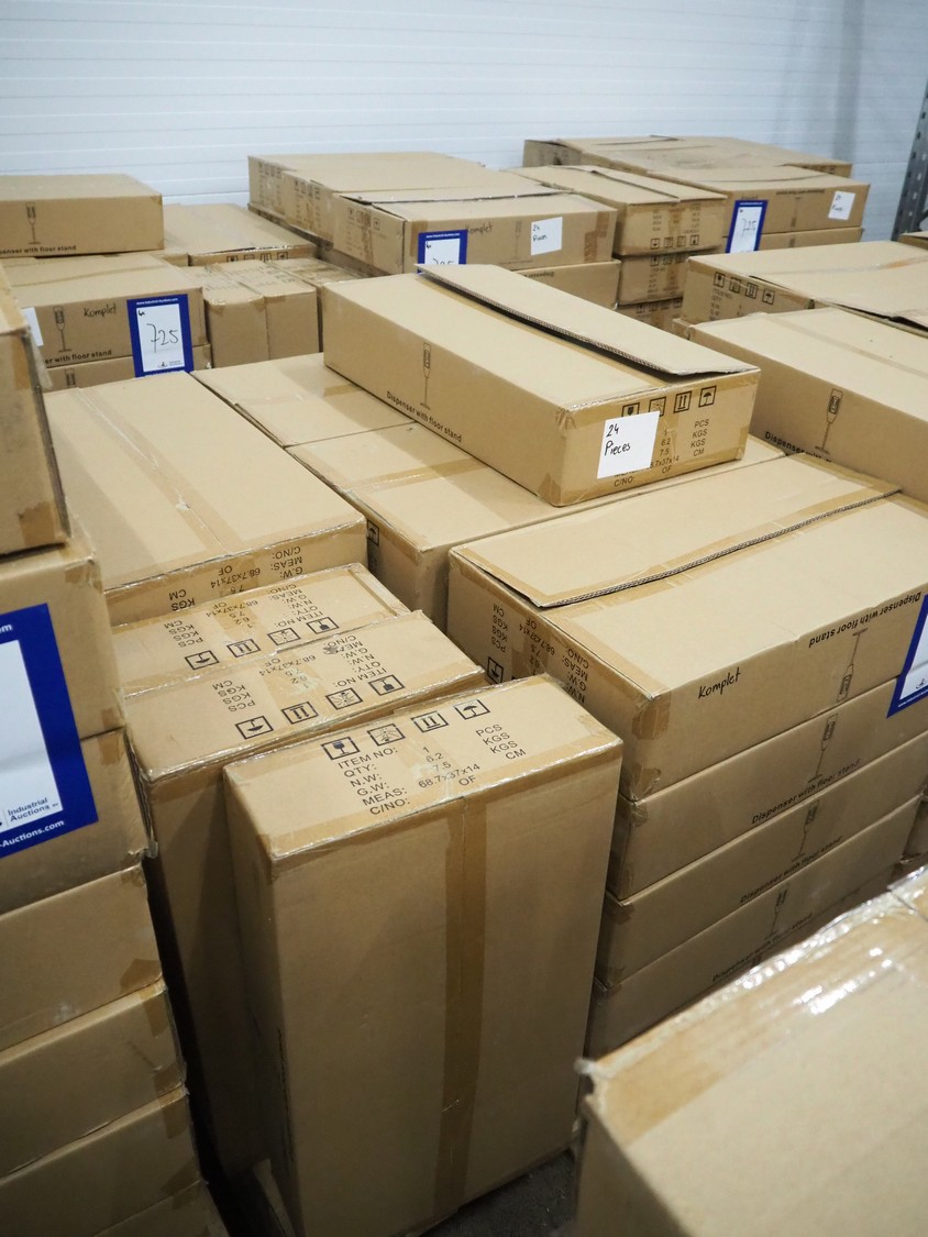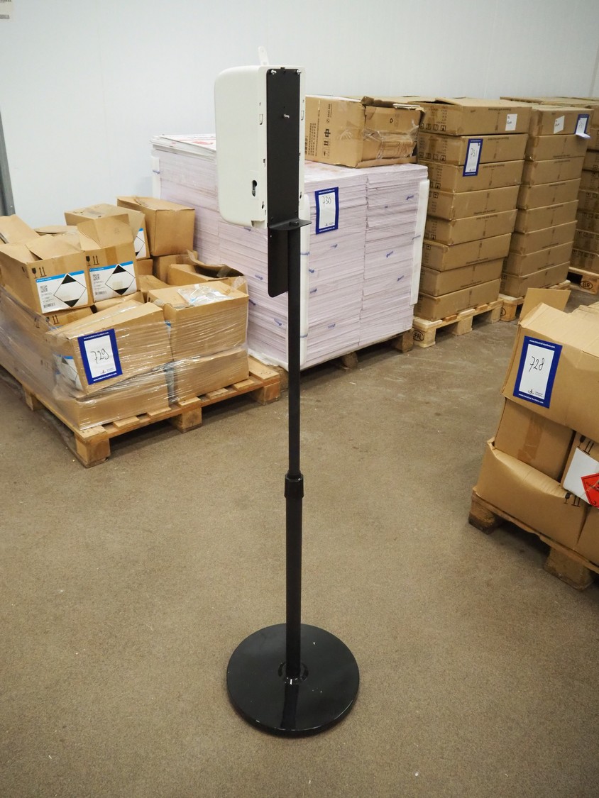 3 pallets with 96 boxes of HändZ automatic soap dispensers with floor stand, dimensions each dispenser: 355 mm x 355 mm x 1500 mm.
