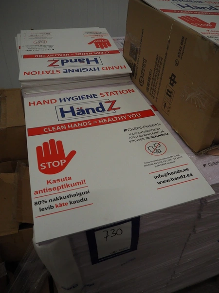 Pallet with large amount of HändZ "hand hygiene station" signs, dimensions each sign: 450 mm x 600 mm.