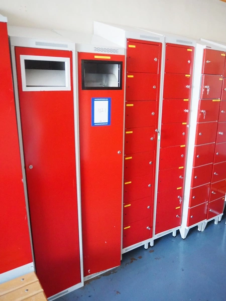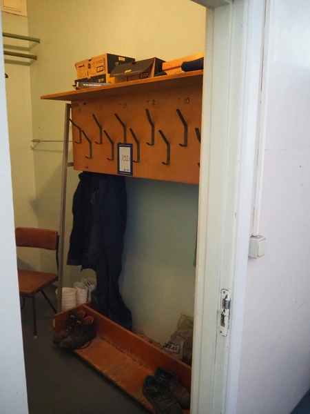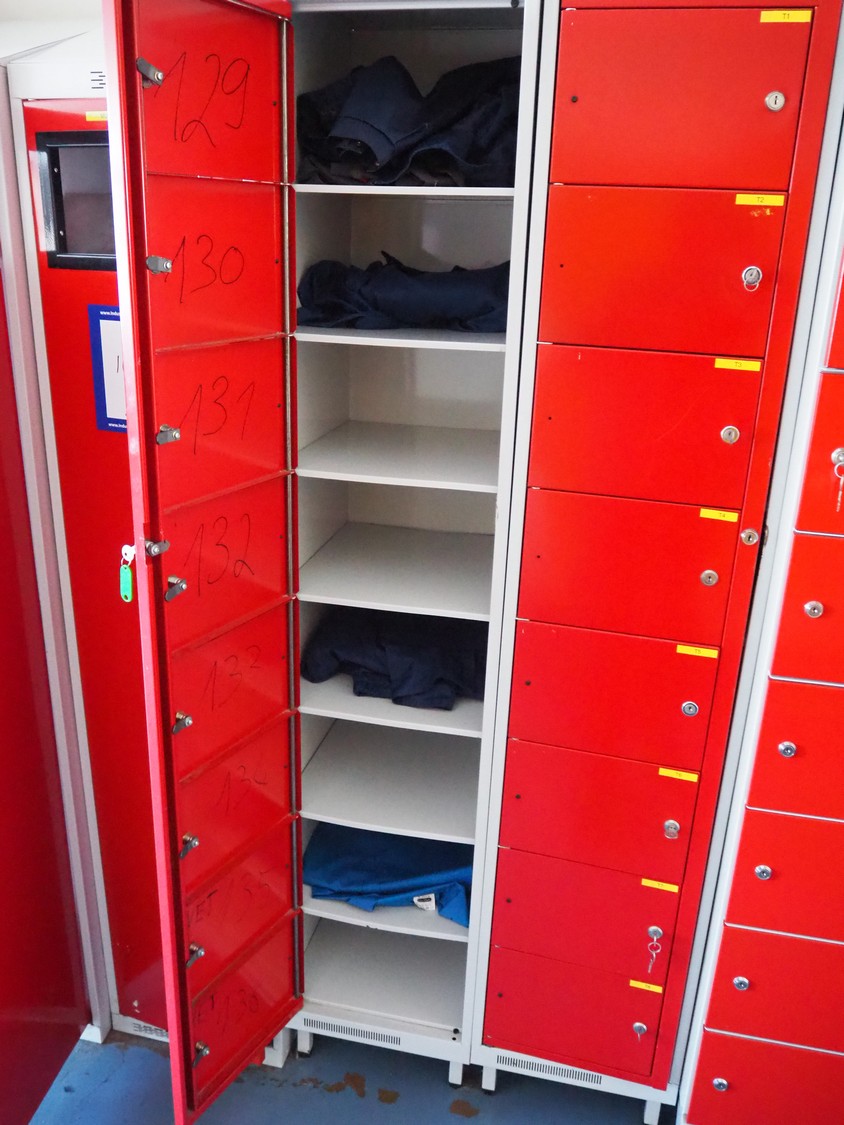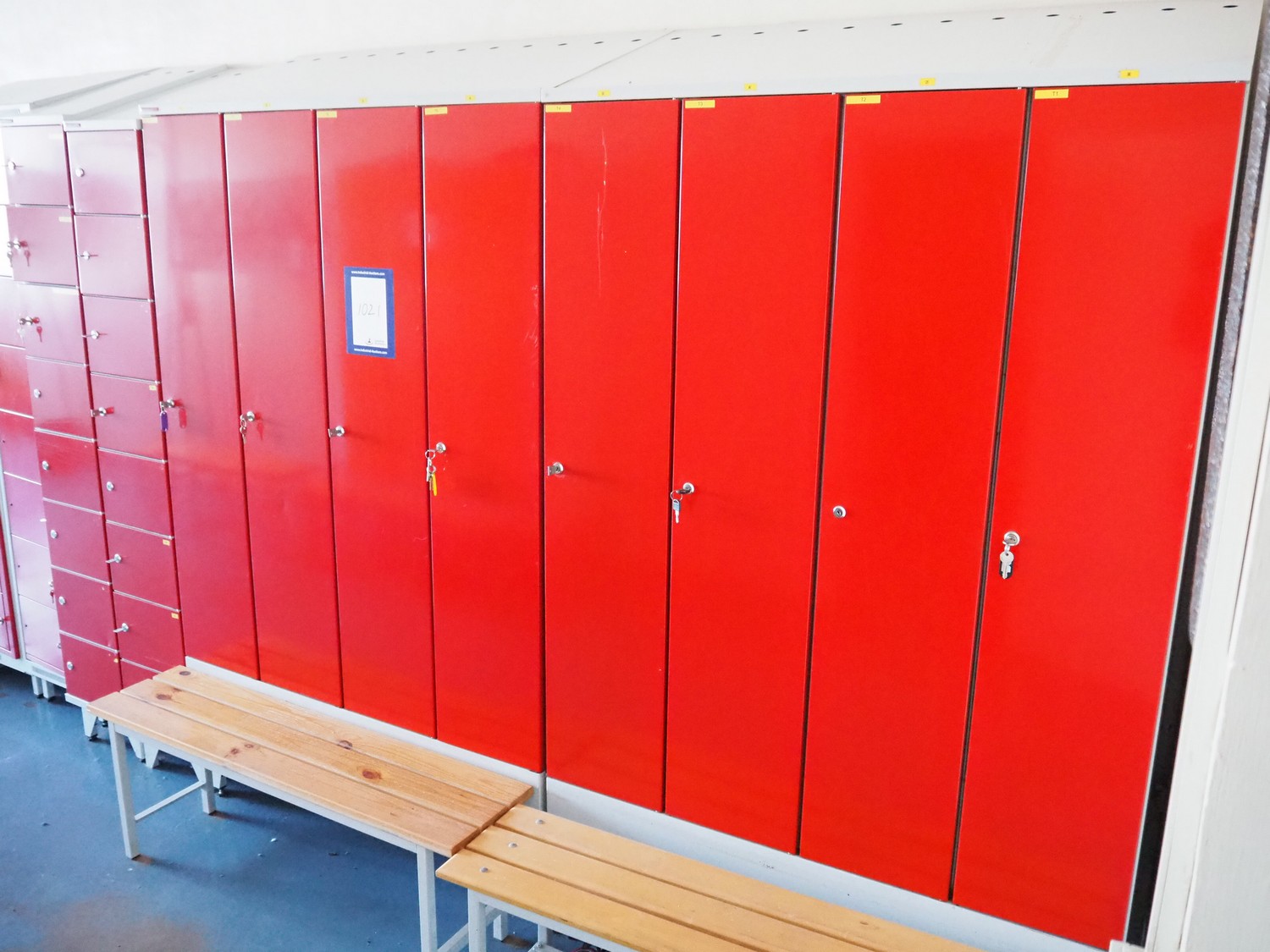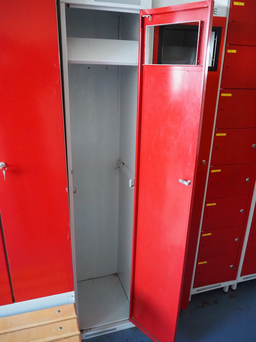(2x) Falkonettmetall steel 2-doors lockers, dimensions: (2x) 810 mm x 800 mm x 2080 mm, (1x) Falkonettmetall steel 3-doors lockers, dimensions: (1x) 1200 mm x 830 mm x 1900 mm, (4x) Falkonettmetall steel 4-doors lockers, dimensions: (4x) 1200 mm x 540 mm x 2080 mm, (2x) Falkonettmetall steel 8-doors lockers, dimensions: (2x) 380 mm x 460 mm x 2100 mm and 3 coat racks, dimensions: (3x) 1400 mm x 500 mm x 1850 mm. Various keys are missing.