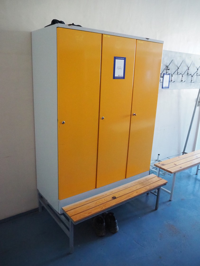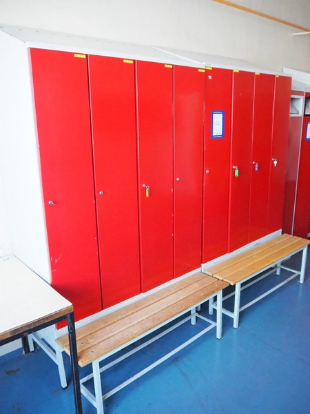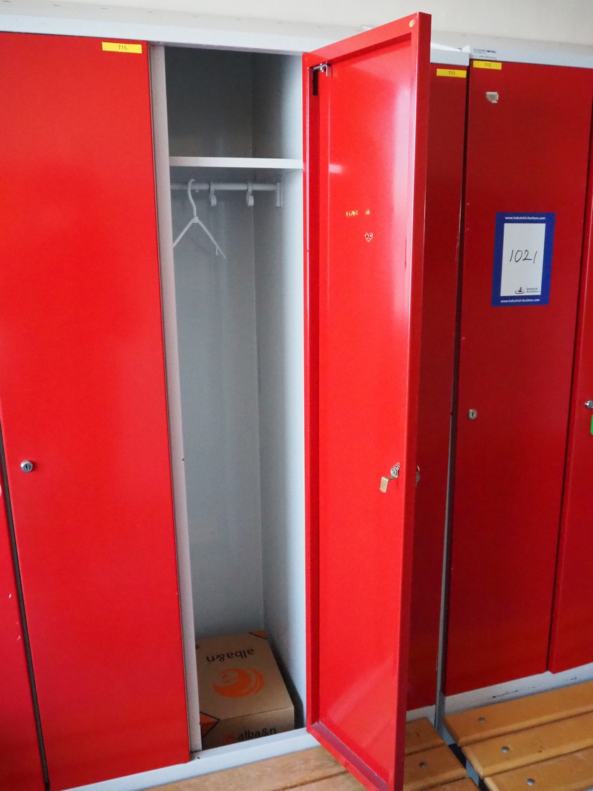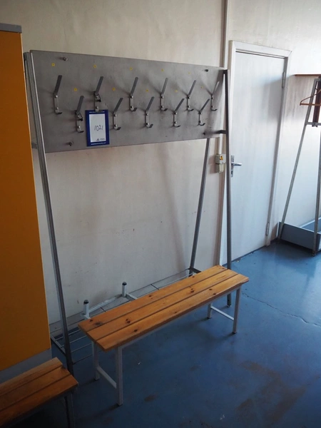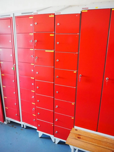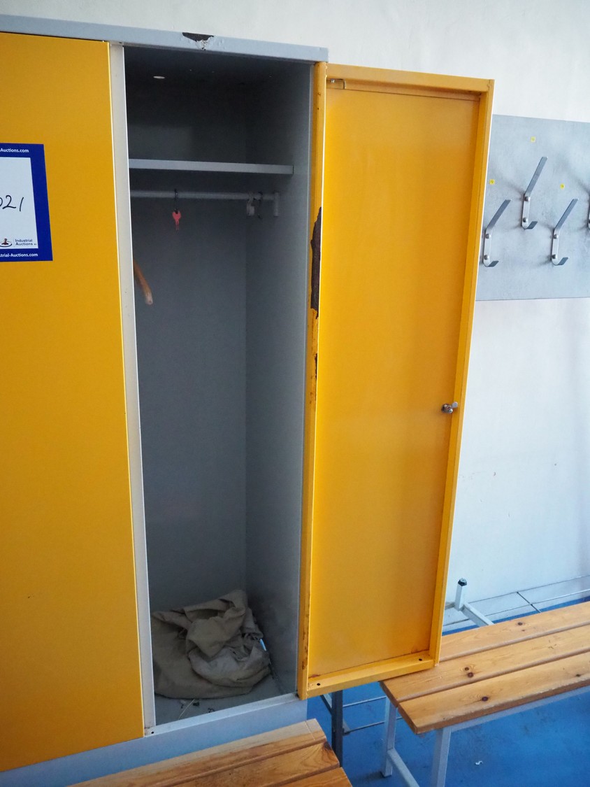 (2x) Falkonettmetall steel 2-doors lockers, dimensions: (2x) 810 mm x 800 mm x 2080 mm, (1x) Falkonettmetall steel 3-doors lockers, dimensions: (1x) 1200 mm x 830 mm x 1900 mm, (4x) Falkonettmetall steel 4-doors lockers, dimensions: (4x) 1200 mm x 540 mm x 2080 mm, (2x) Falkonettmetall steel 8-doors lockers, dimensions: (2x) 380 mm x 460 mm x 2100 mm and 3 coat racks, dimensions: (3x) 1400 mm x 500 mm x 1850 mm. Various keys are missing.