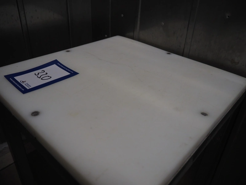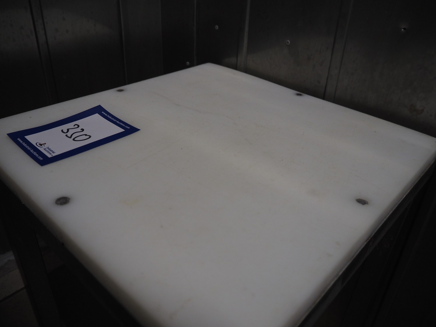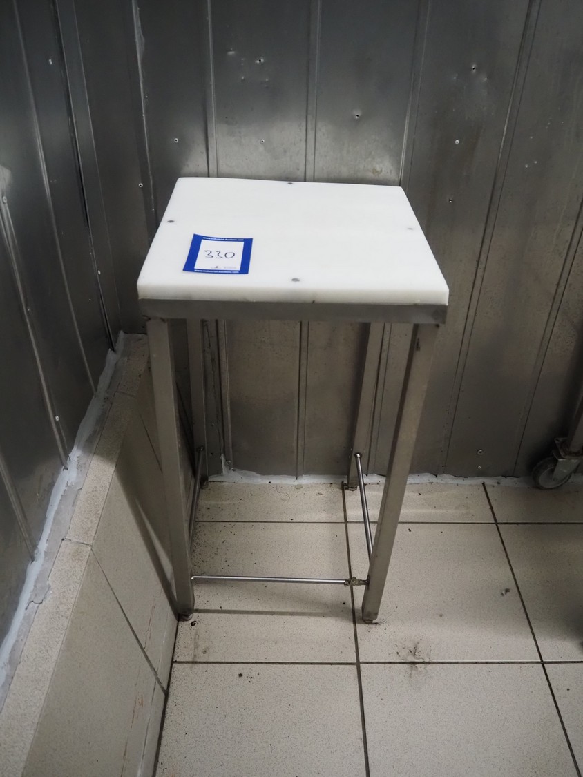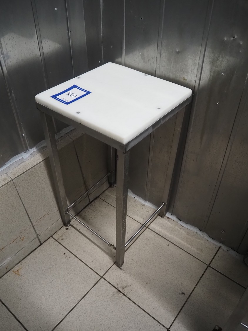 S/s stool, plastic top, dimensions: 350 mm x 350 mm x 630 mm.