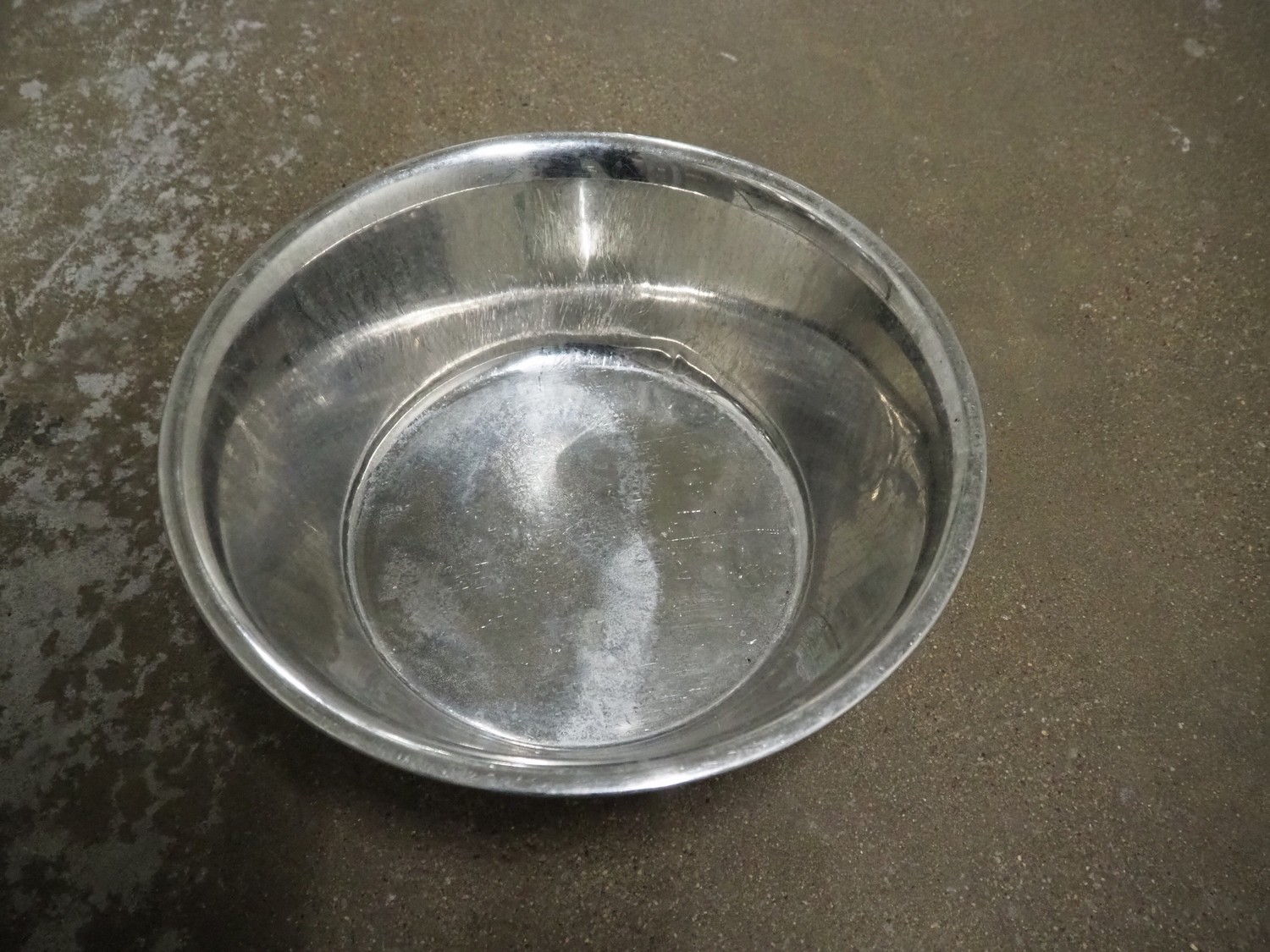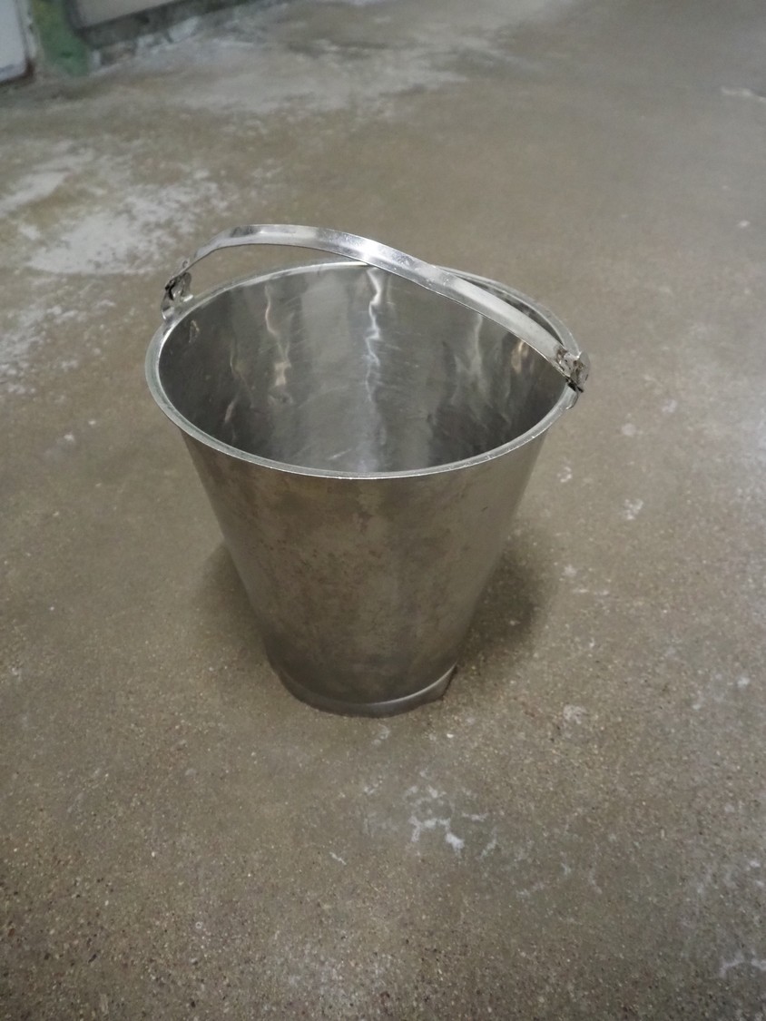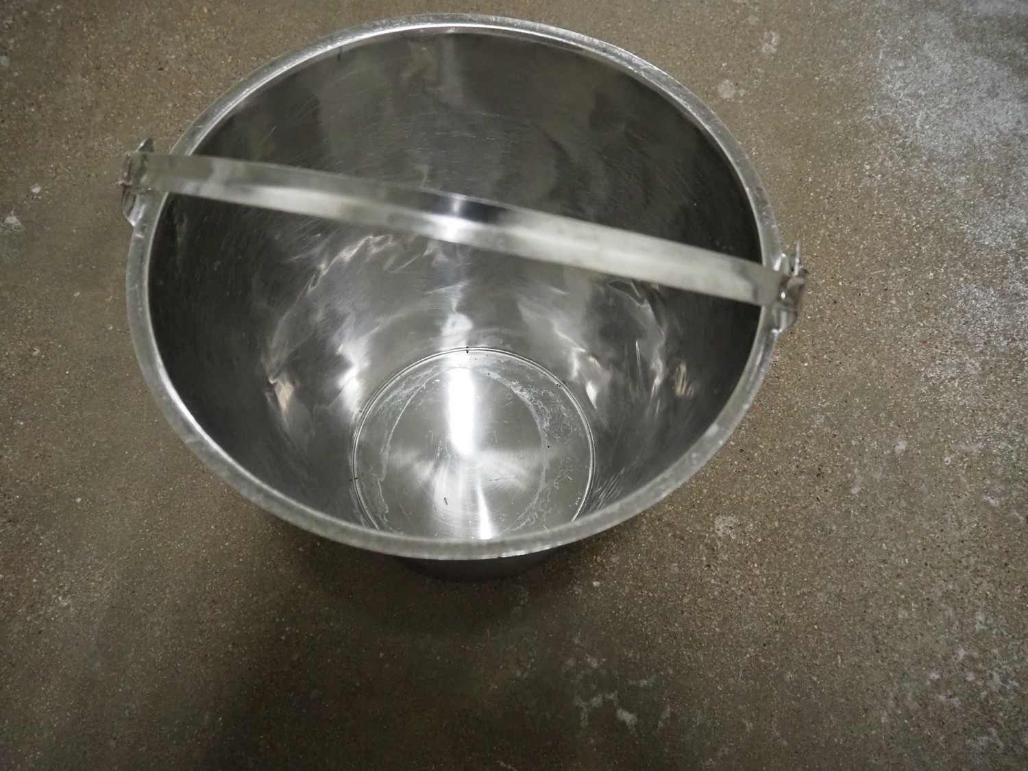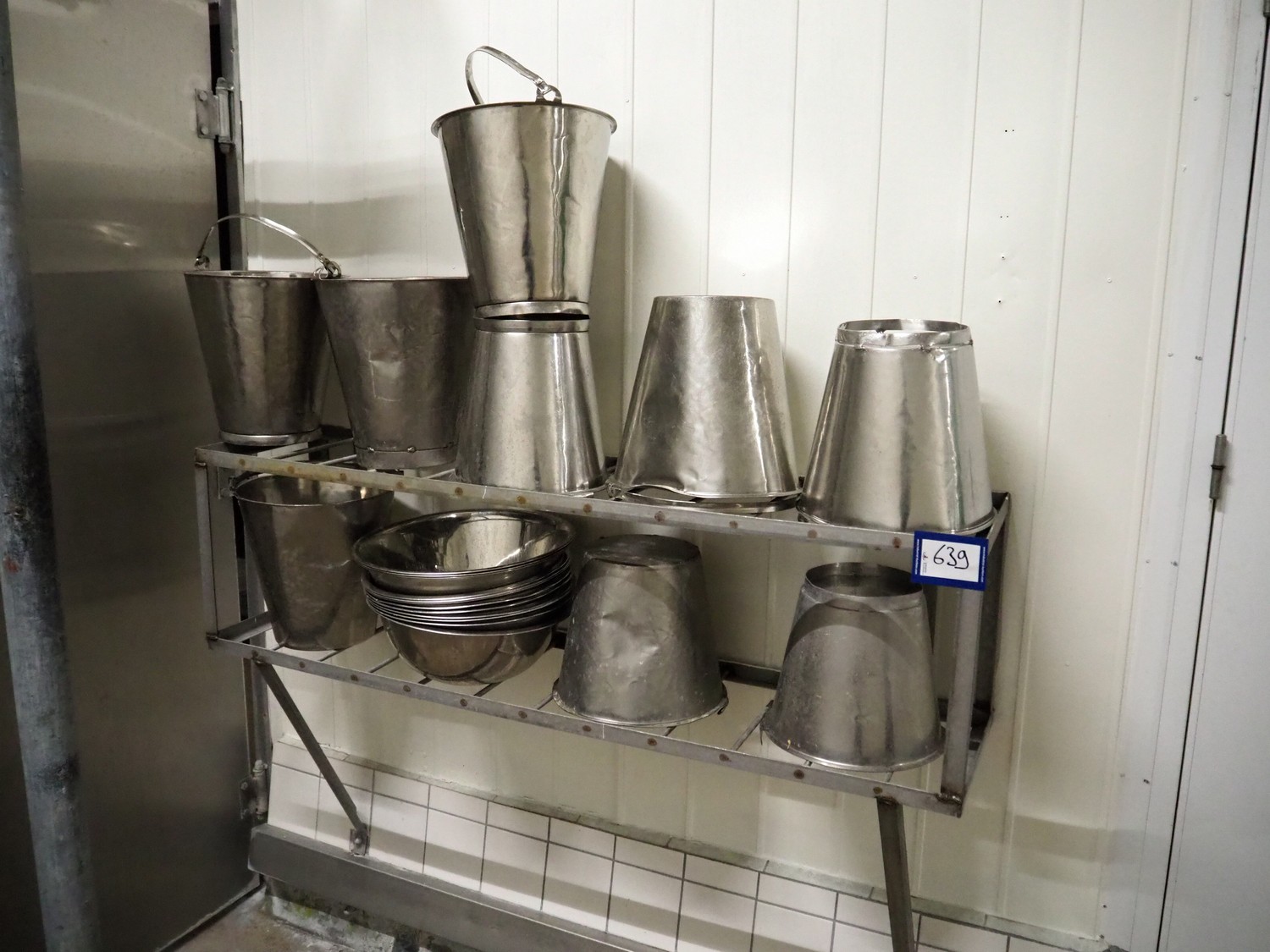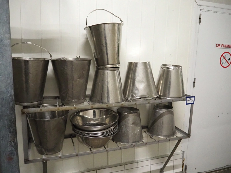S/s wall mounted rack with various s/s buckets, dimensions: 1450 mm x 360 mm x 1050 mm.